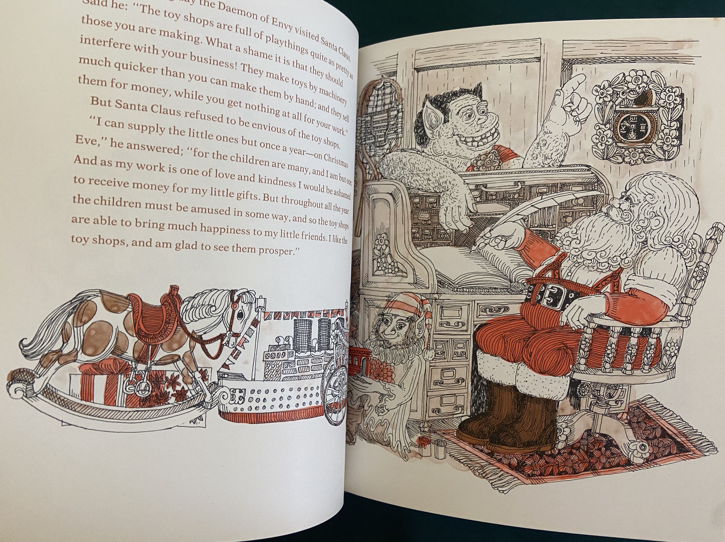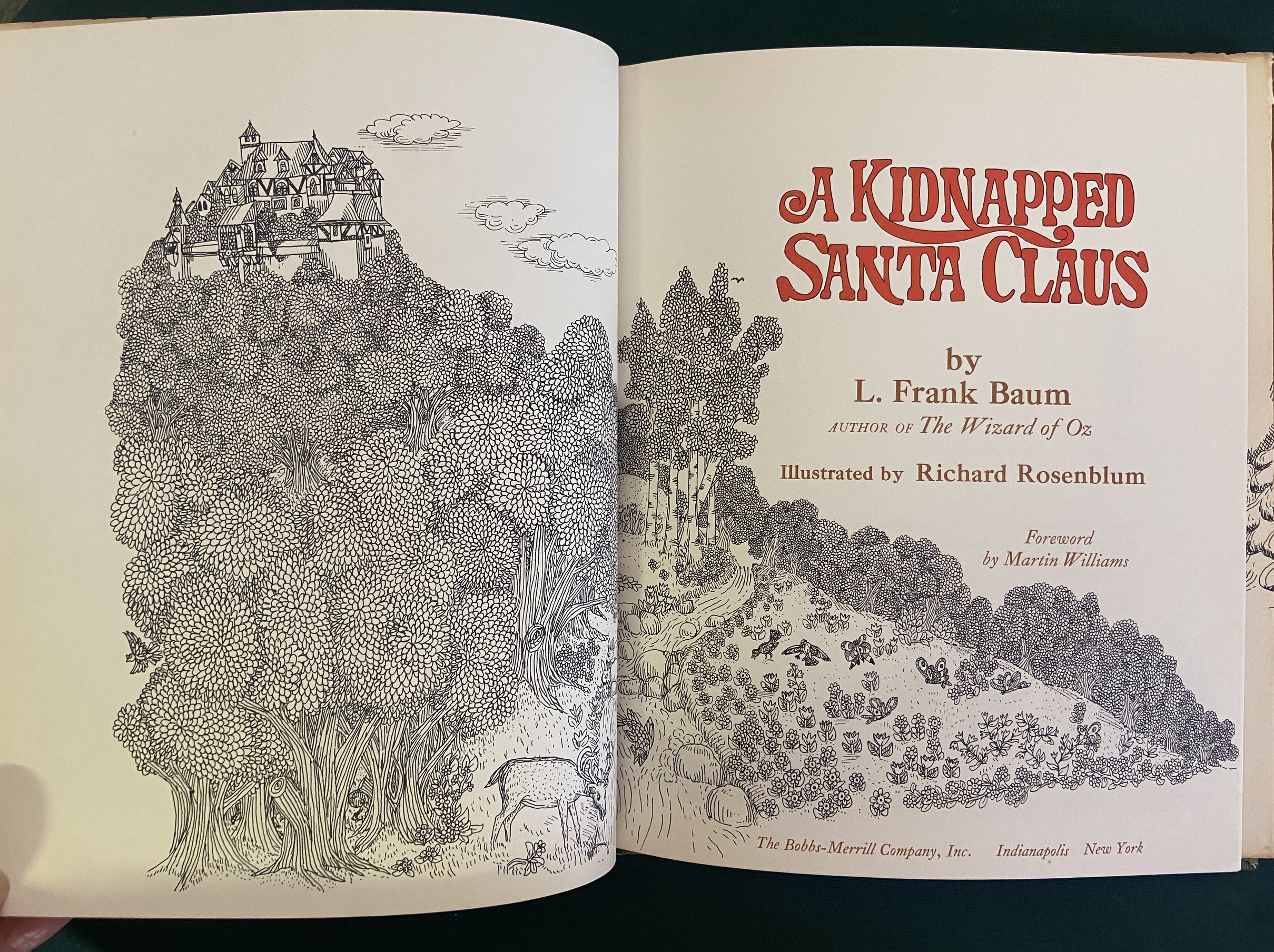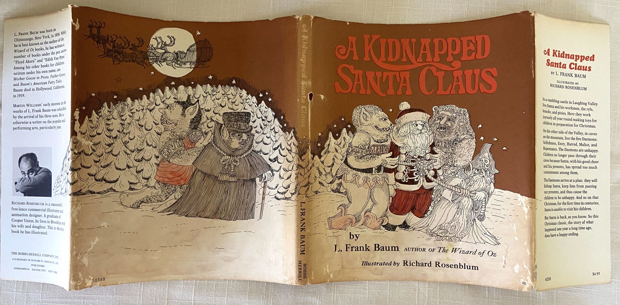 Here is a nice copy “A Kidnapped Santa Claus”, written by Wizard of Oz author L. Frank Baum, in the original pictorial dust jacket. Copyright 1969 Bobbs Merrill. Co. Santa is kidnapped on Christmas Eve by Daemons of Malice and Hate, who are angry with him for making children so happy. This book is charmingly illustrated by Richard Rosenblum, with many many red and black illustrations throughout. I took lots of photos because they’re so cute. With the original dust jacket.