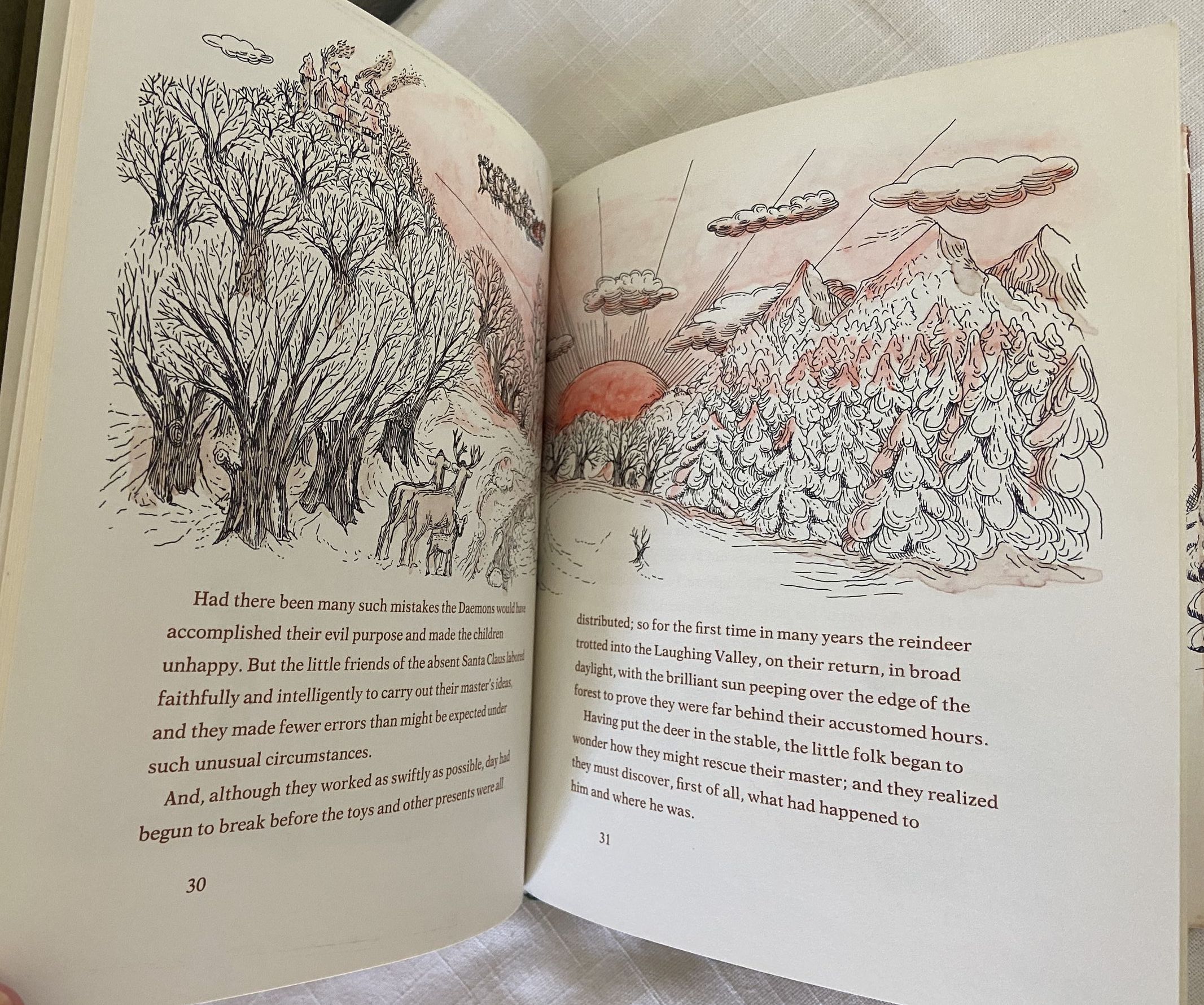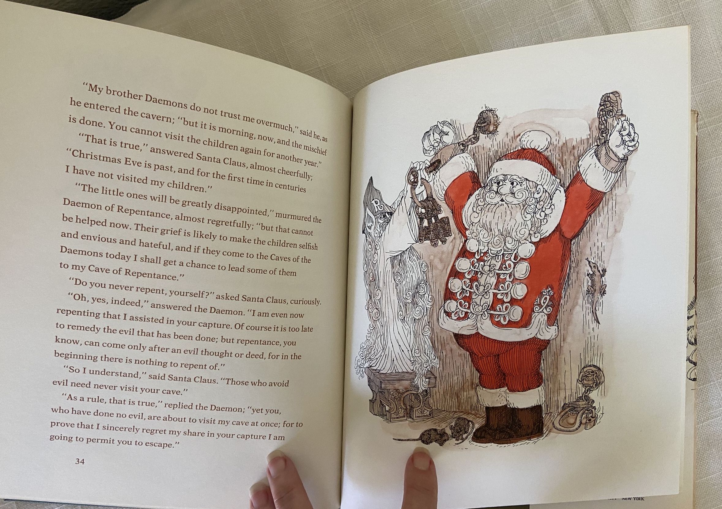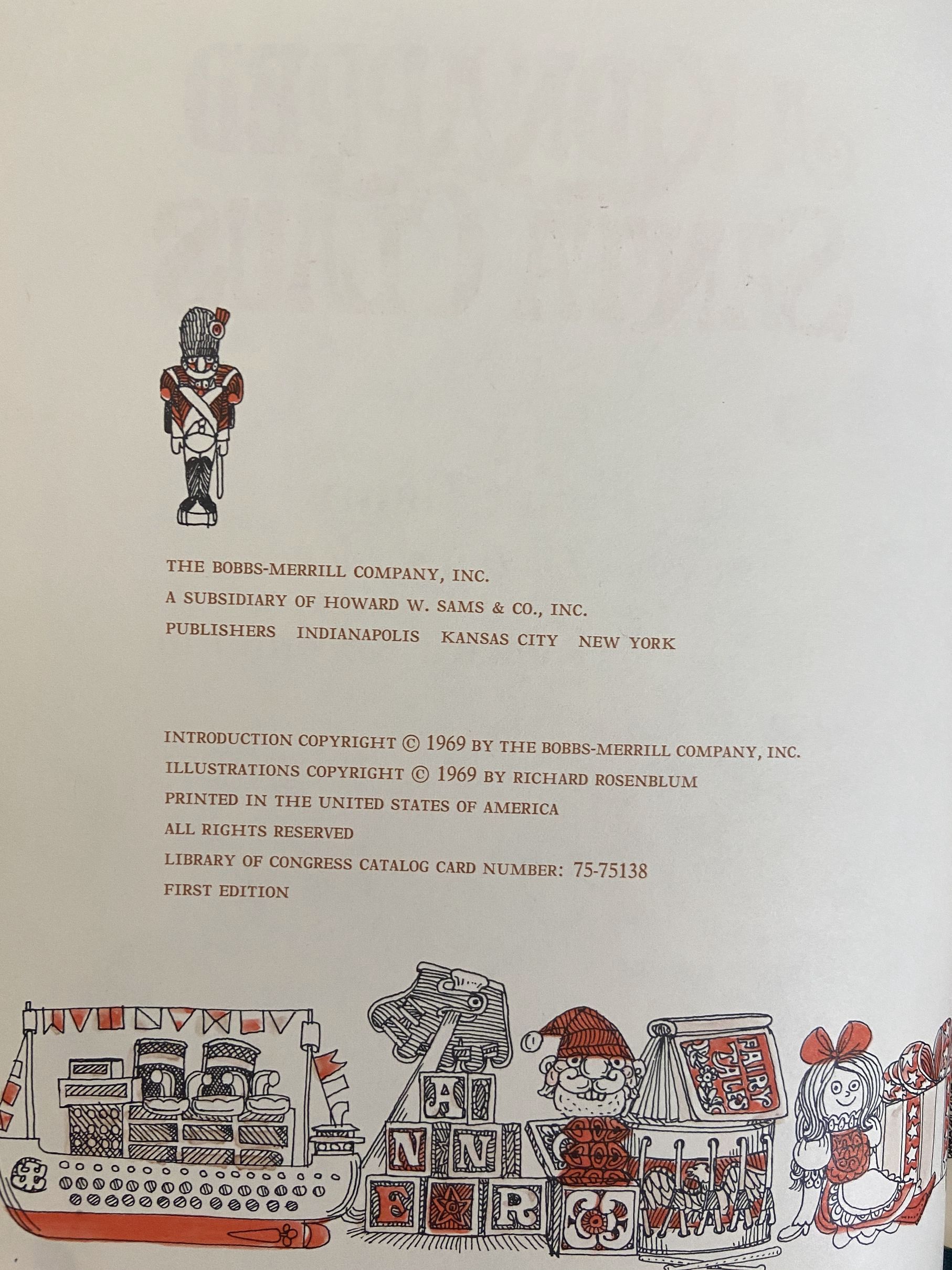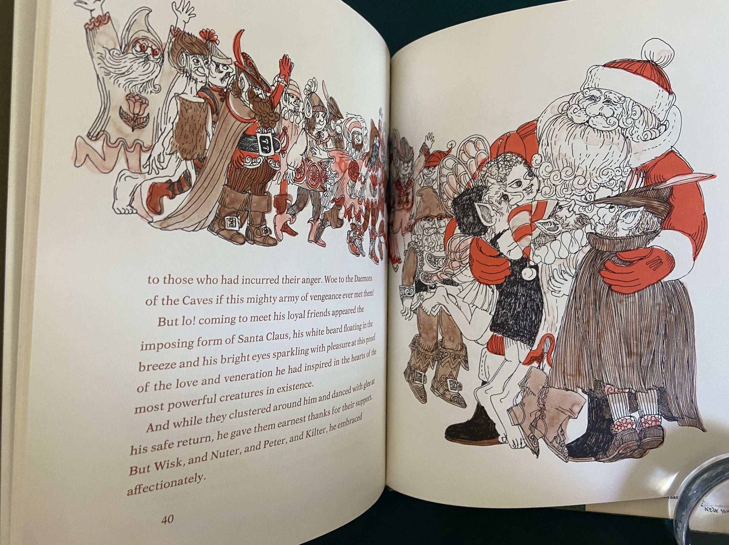 Here is a nice copy “A Kidnapped Santa Claus”, written by Wizard of Oz author L. Frank Baum, in the original pictorial dust jacket. Copyright 1969 Bobbs Merrill. Co. Santa is kidnapped on Christmas Eve by Daemons of Malice and Hate, who are angry with him for making children so happy. This book is charmingly illustrated by Richard Rosenblum, with many many red and black illustrations throughout. I took lots of photos because they’re so cute. With the original dust jacket.