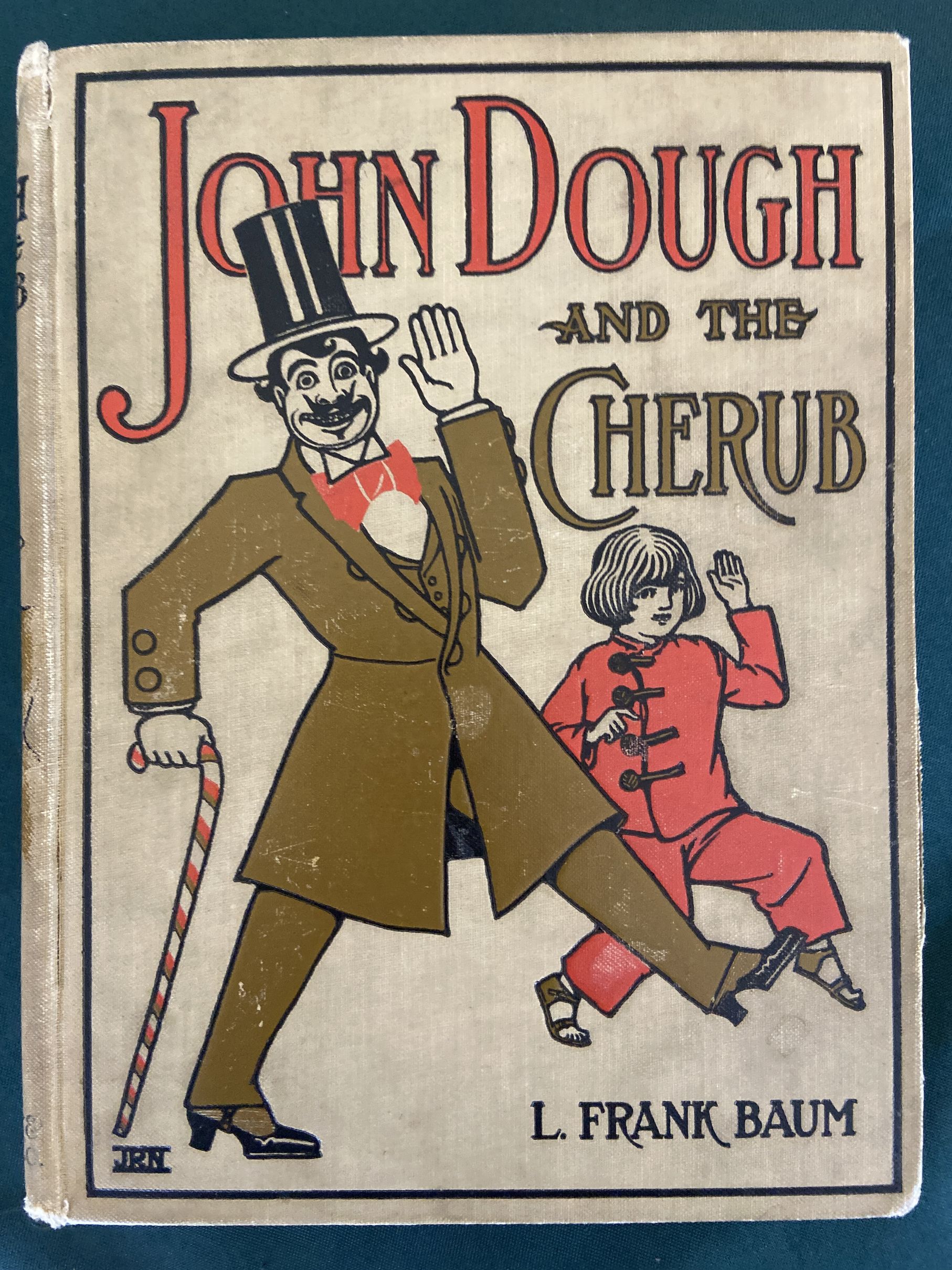 Interesting book by L. Frank Baum about John Dough, a very unusual gingerbread man. This is the 1906 first edition, first printing with misprint “cage” on p. 275, before it was corrected to “cave”. In binding A (REILLY & BRITTON CO on spine). with the stub for the detachable contest blank present in the book.