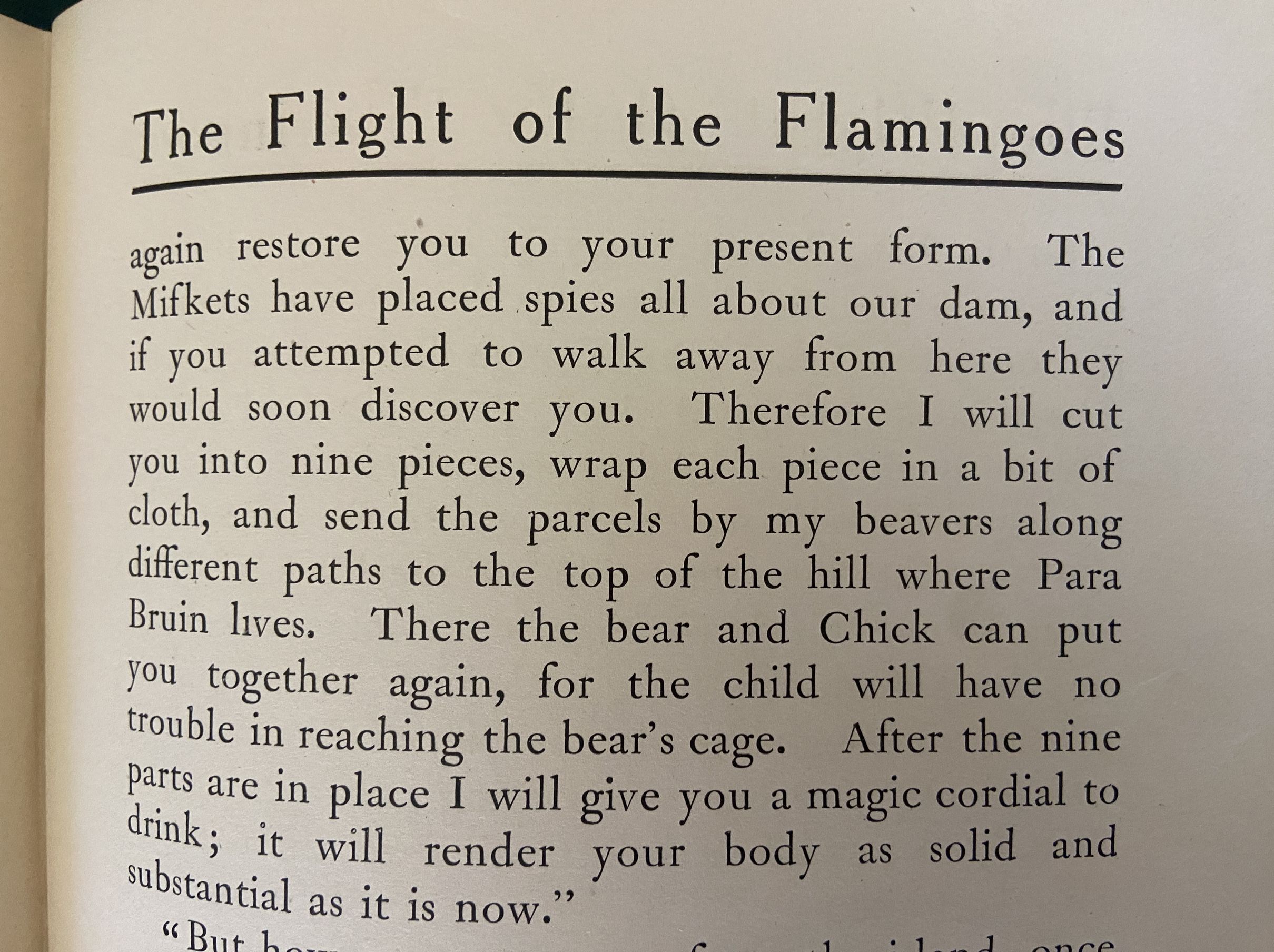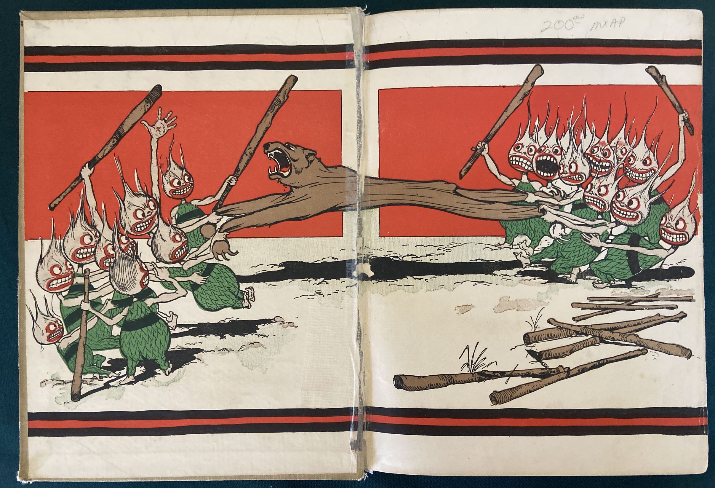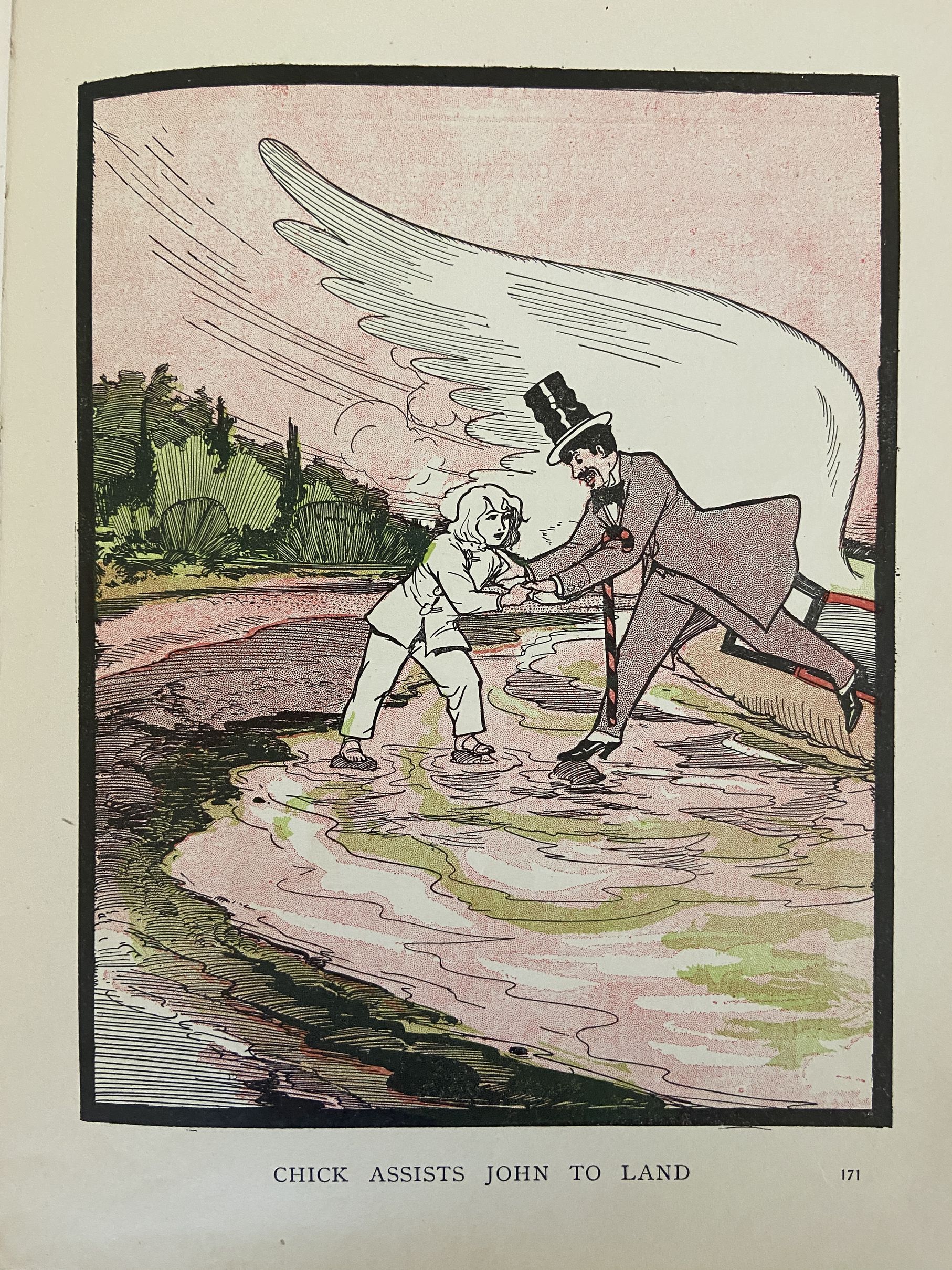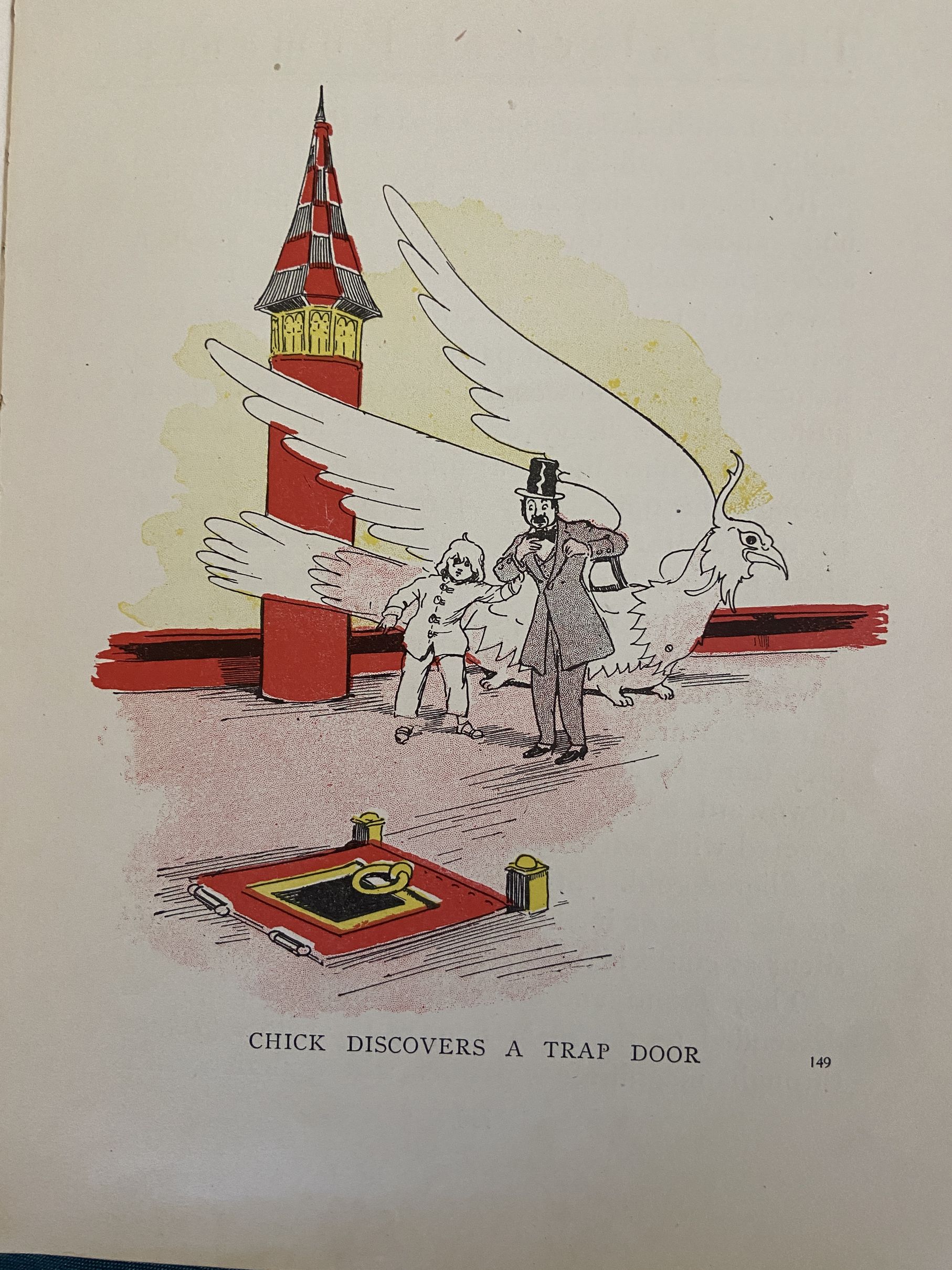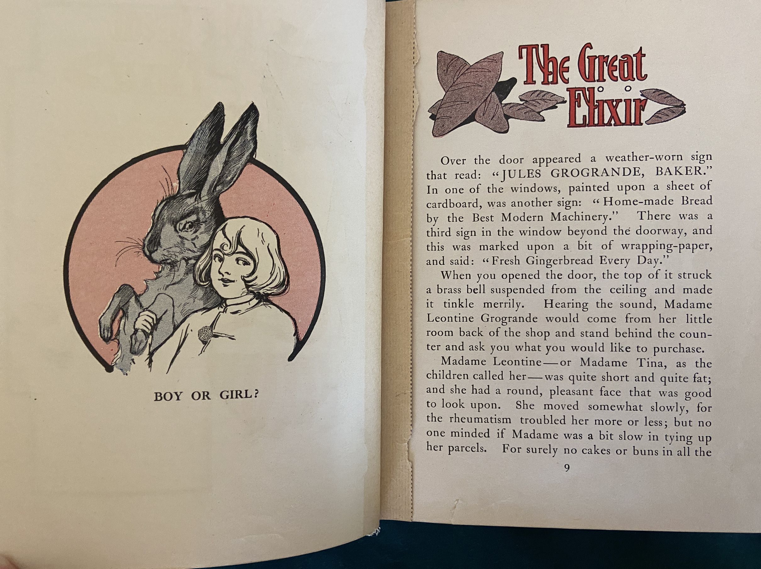 The topic of the contest was “Is the Cherub a boy or a girl?” Good question. The book has many weird and wonderful drawings in vivid color by John R. Neill. Rear endpapers advertise The Twinkle Tales and The Christmas Stocking Series (with the little books packaged in a miniature bookcase), The Land of Oz and the elusive Wogglebug Book.
