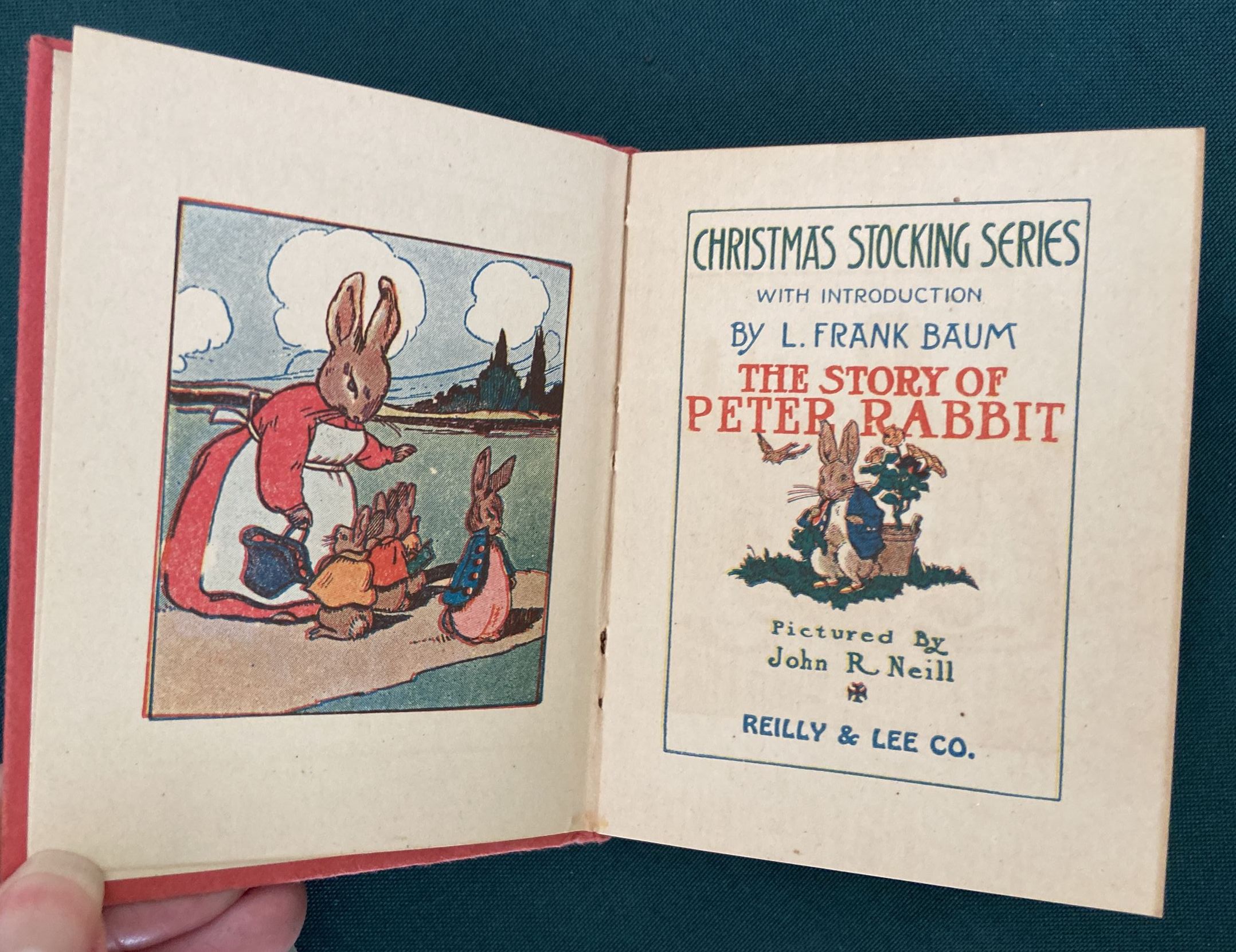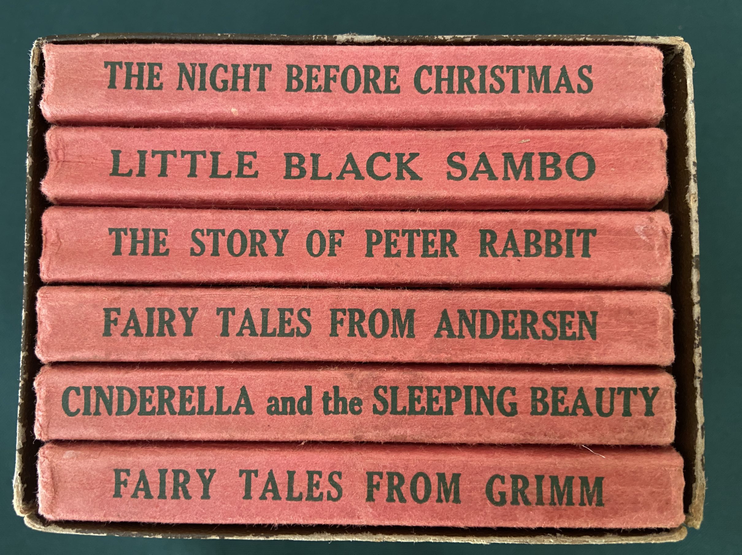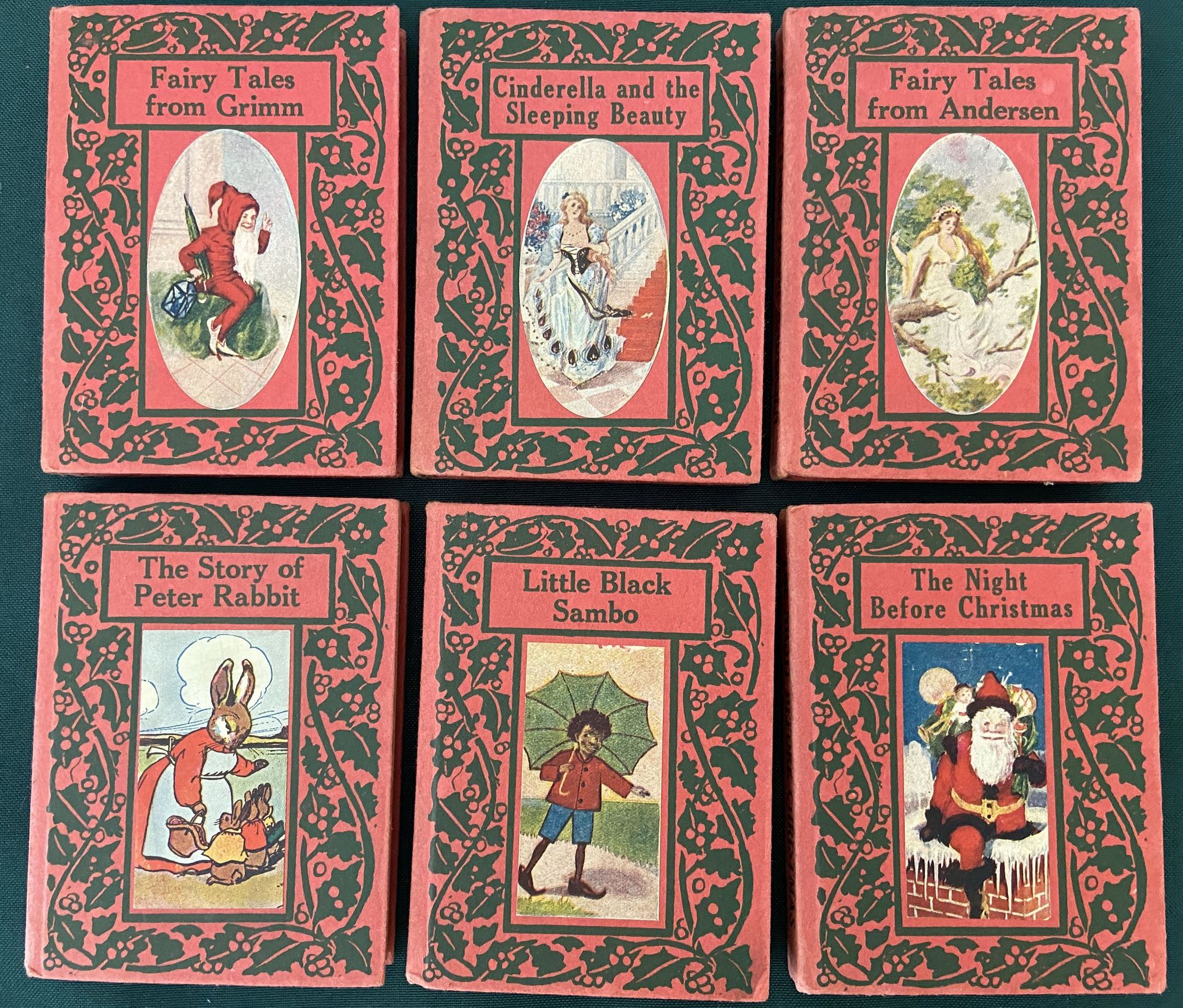 A scarce complete set of six fairy tale books published by Reilly & Lee with introductions by L. Frank Baum of Wizard of Oz fame. Includes the highly desirable Little Black Sambo, The Night Before Christmas, Story of Peter Rabbit, Fairy Tales From Grimm, Fairy Tales From Andersen and Cinderella & Sleeping Beauty. Peter Rabbit is notable as being the only one of the Christmas Stocking series books illustrated by John R. Neill, who also illustrated most of the Oz books. Now, what makes this set REALLY special is that it includes the base and lid of the ORIGINAL STEAMER TRUNK that was issued to enclose and showcase the set. Very cute, imprinted with Christmas-related travel decals. This is really a fabulous set for the serious collector. These tiny books are only 3″ by 4″ and contain about 124 pages, plus ads at the back for Oz and related books. Red decorated covers with color pastedown illustrations. Note that Bibliographia Baumiana confirms that Reilly & Lee still was issuing the books with the steamer trunk option in the 1920s.