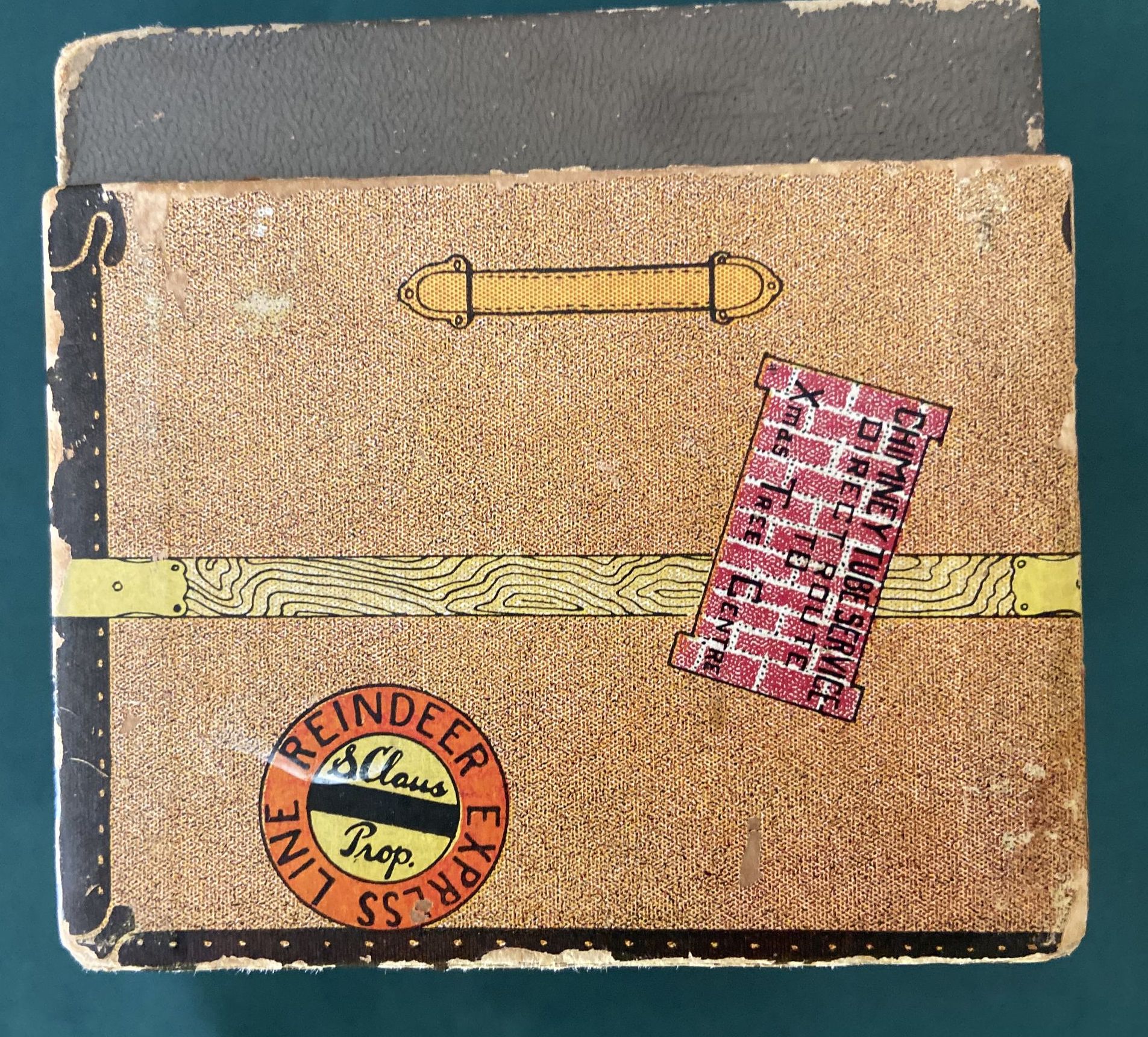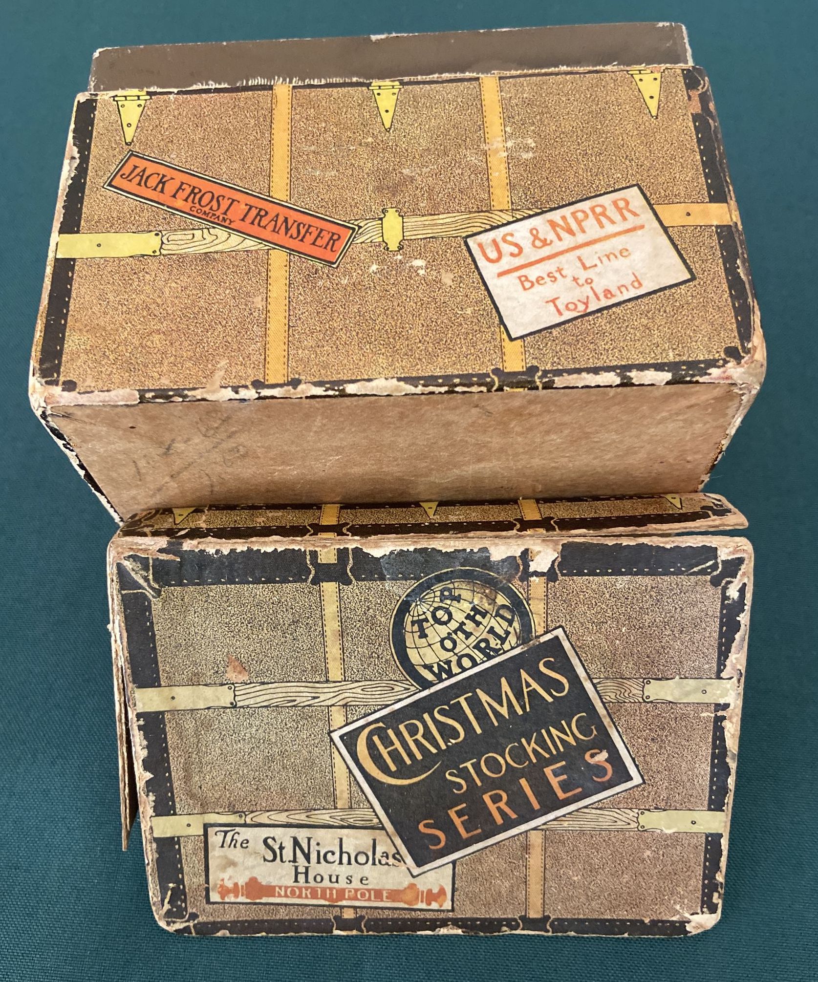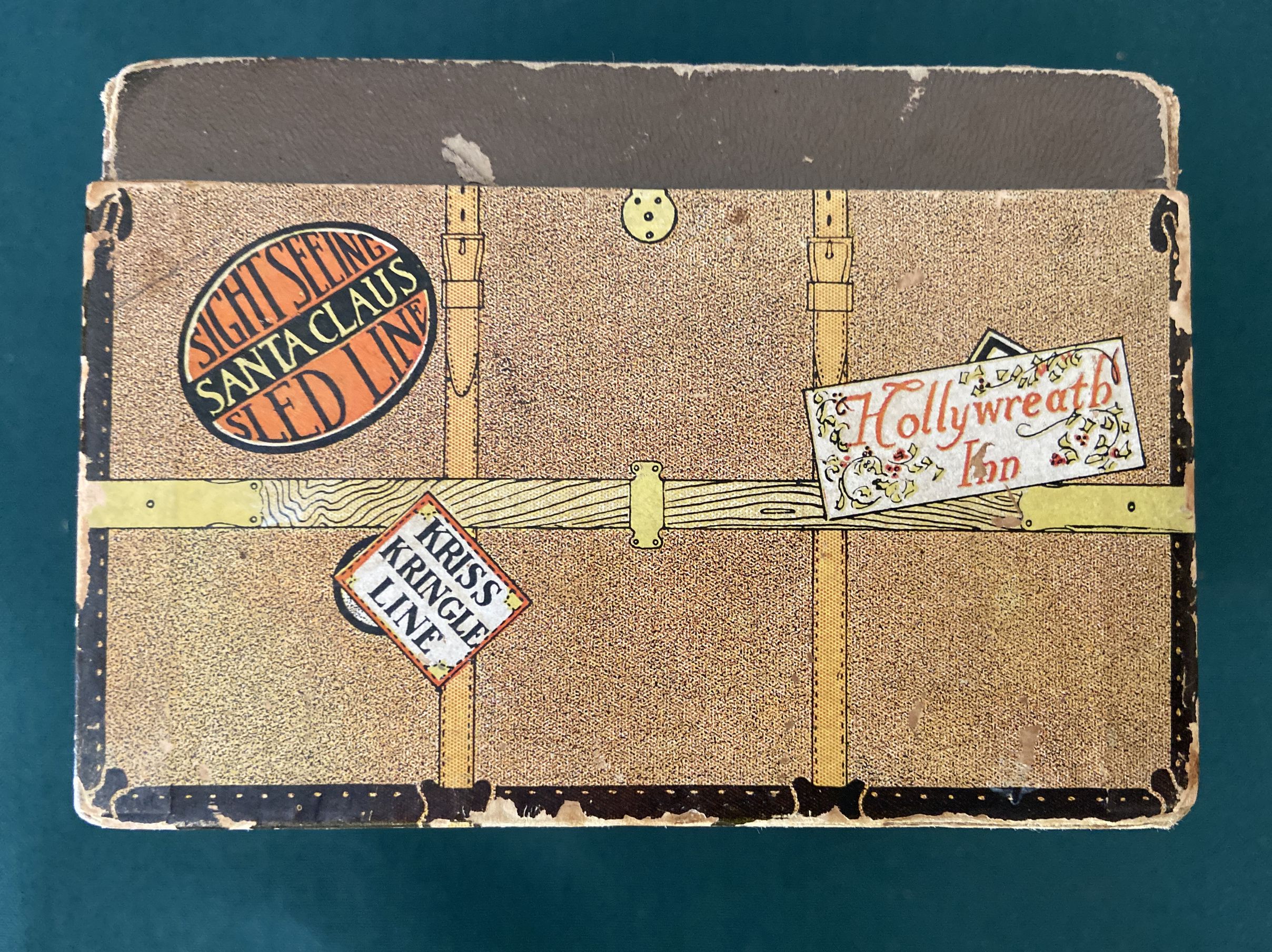 A scarce complete set of six fairy tale books published by Reilly & Lee with introductions by L. Frank Baum of Wizard of Oz fame. Includes the highly desirable Little Black Sambo, The Night Before Christmas, Story of Peter Rabbit, Fairy Tales From Grimm, Fairy Tales From Andersen and Cinderella & Sleeping Beauty. Peter Rabbit is notable as being the only one of the Christmas Stocking series books illustrated by John R. Neill, who also illustrated most of the Oz books. Now, what makes this set REALLY special is that it includes the base and lid of the ORIGINAL STEAMER TRUNK that was issued to enclose and showcase the set. Very cute, imprinted with Christmas-related travel decals. This is really a fabulous set for the serious collector. These tiny books are only 3″ by 4″ and contain about 124 pages, plus ads at the back for Oz and related books. Red decorated covers with color pastedown illustrations. Note that Bibliographia Baumiana confirms that Reilly & Lee still was issuing the books with the steamer trunk option in the 1920s.