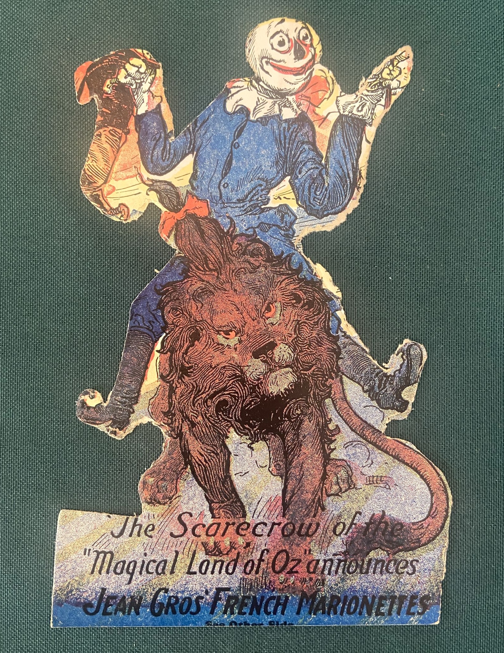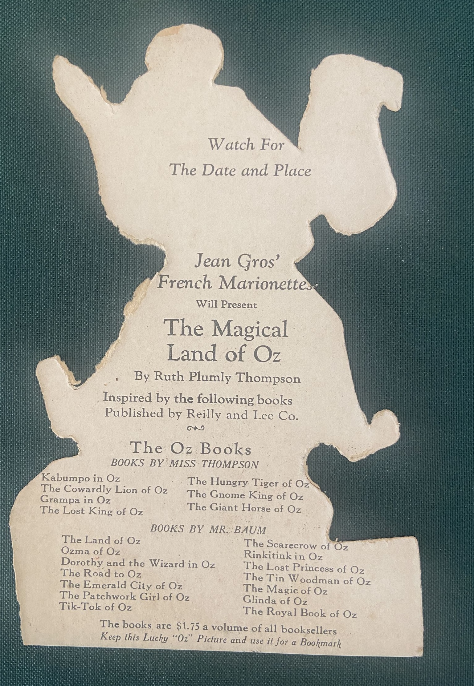 Original Scarecrow cardstock bookmark advertising The Magical Land of Oz, a marionette show ca. 1928 by Jean Gros, starring the Scarecrow and Tin Woodman. The bookmark design is from John R Neill’s color endpapers for The Patchwork Girl of Oz book. Back advertises the Oz books, with the last one listed Giant Horse of Oz (1928). Rare and ephemeral, this is one of the most desirable Oz collectibles because so few survived! About 5 1/2″ tall.