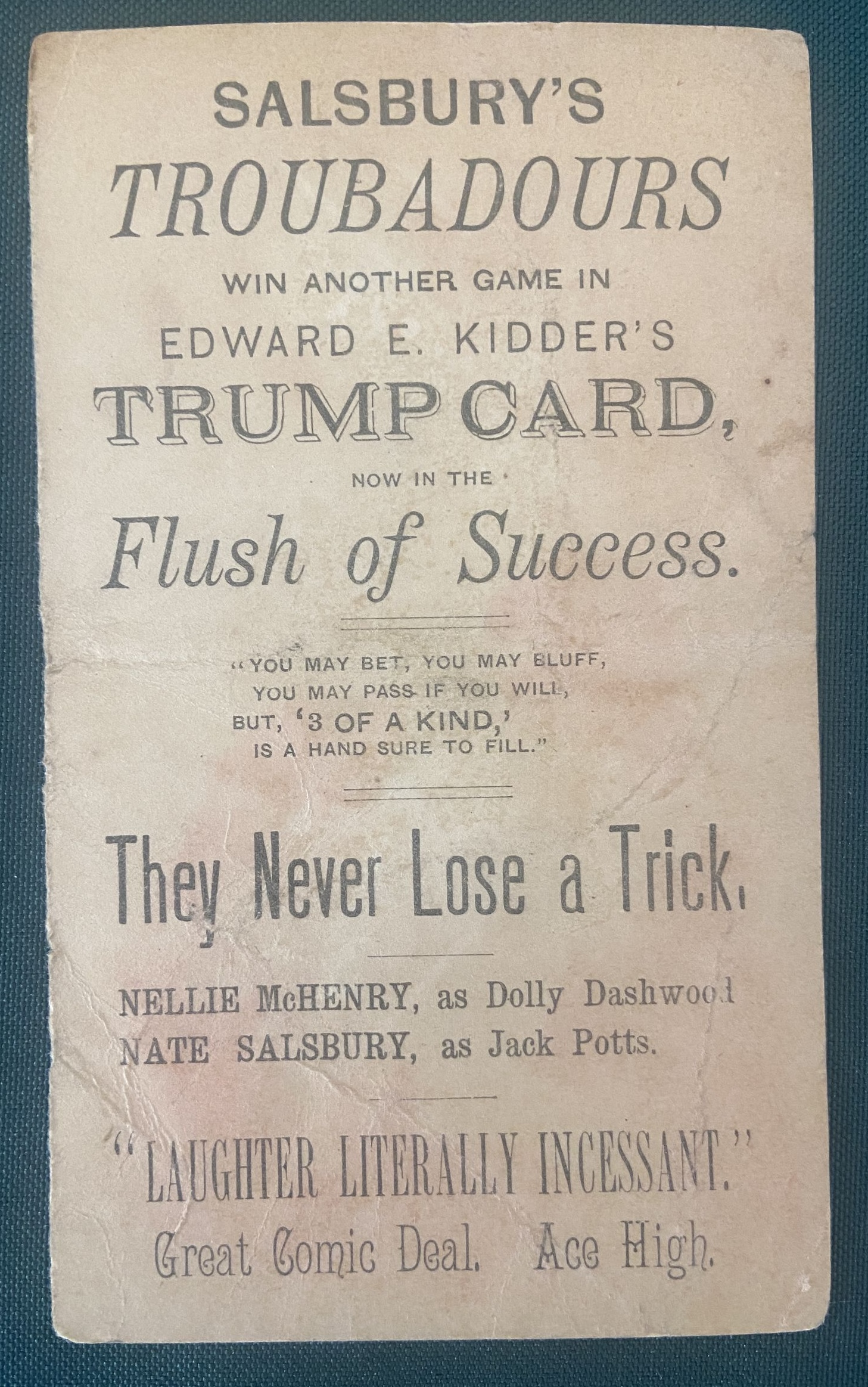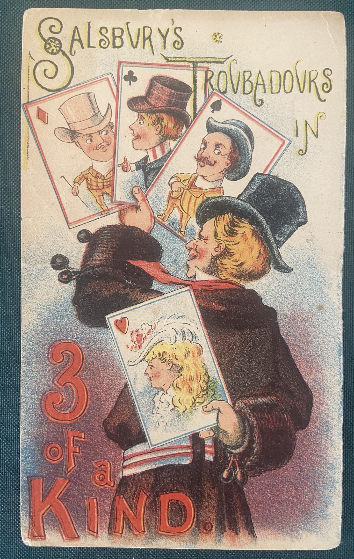 A rare trade card with funky characters by Wizard of Oz illustrator W W Denslow attributed to Denslow in the Autumn 1992 Baum Bugle checklist of Denslow’s work. Ca 1881, one of the earliest Denslow collectibles! This is the title card of a set of eight advertising the play “3 of a Kind”, and the only ones to attribute the play to “Salsbury’s Troubadours”. In good condition, with a light edge wear and creasing. A nice example of Denslow’s very early work. I also have other cards in this series in a separate listing.