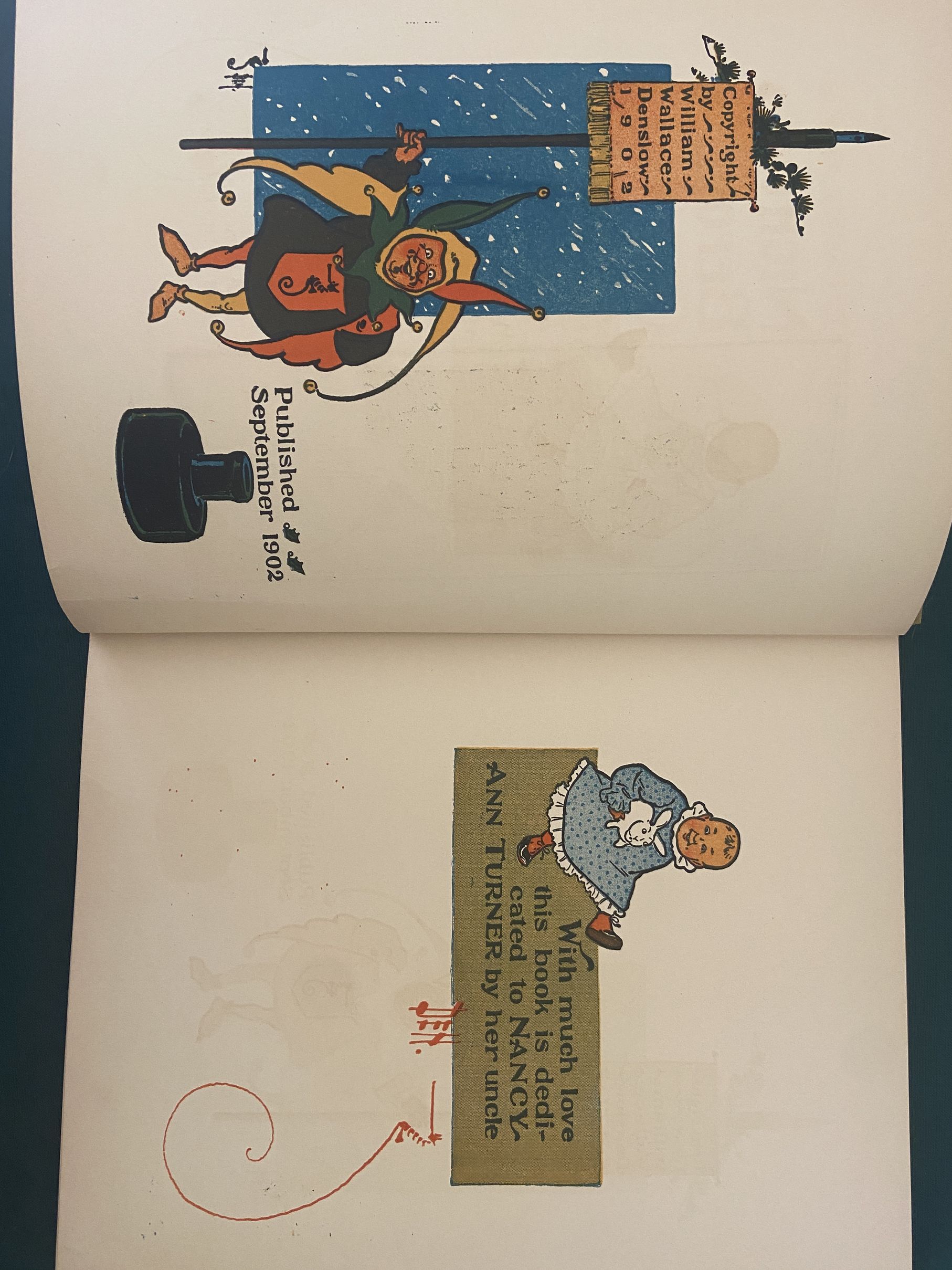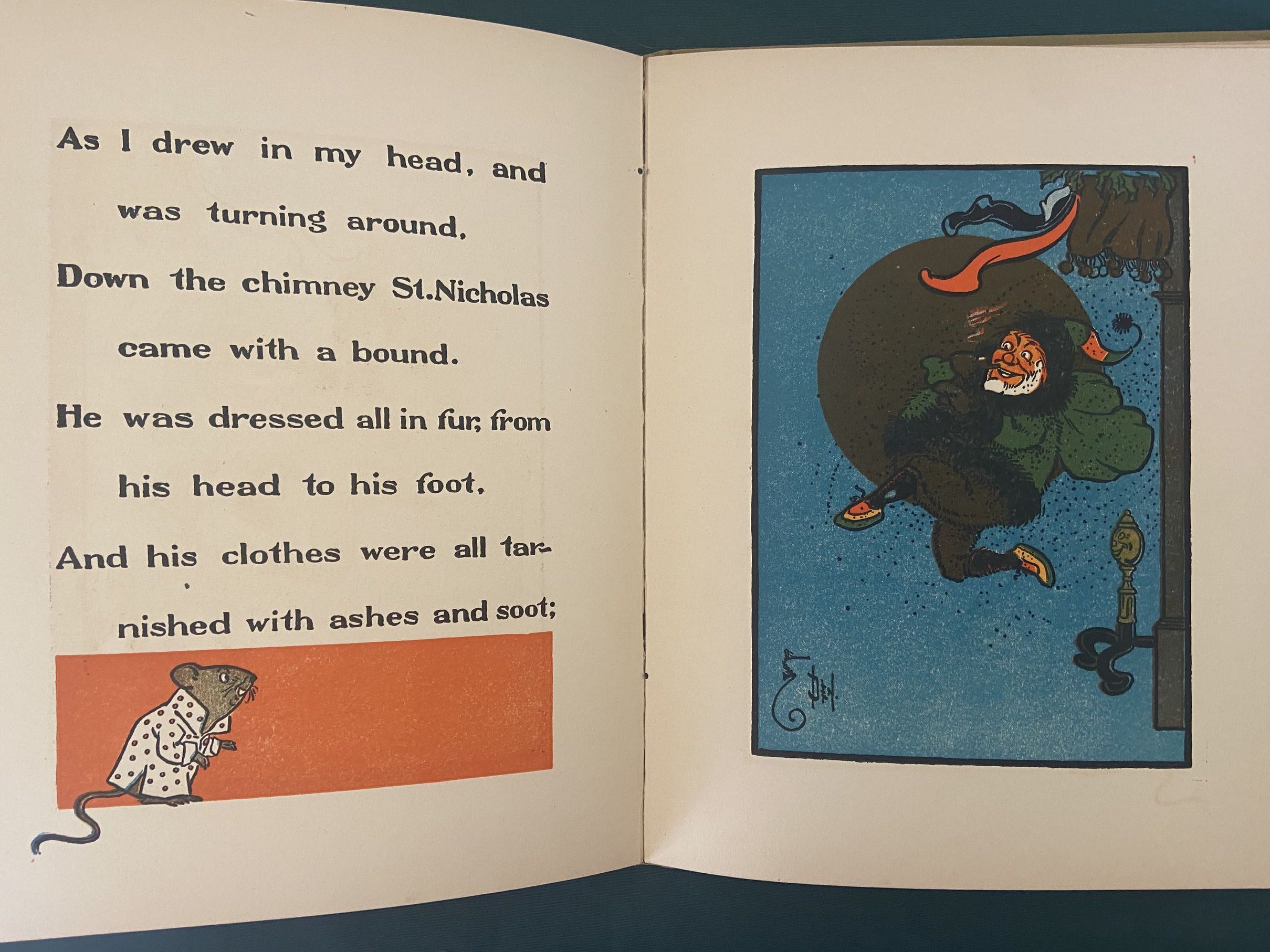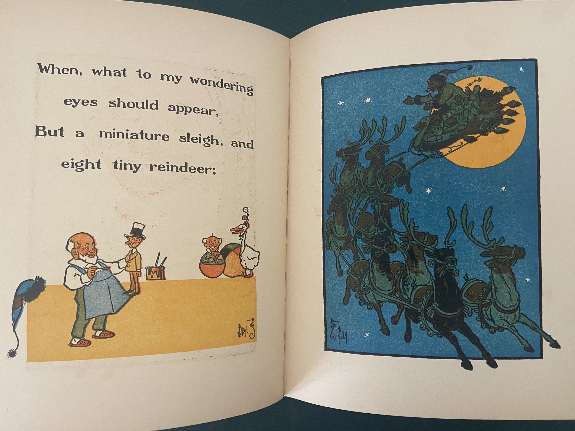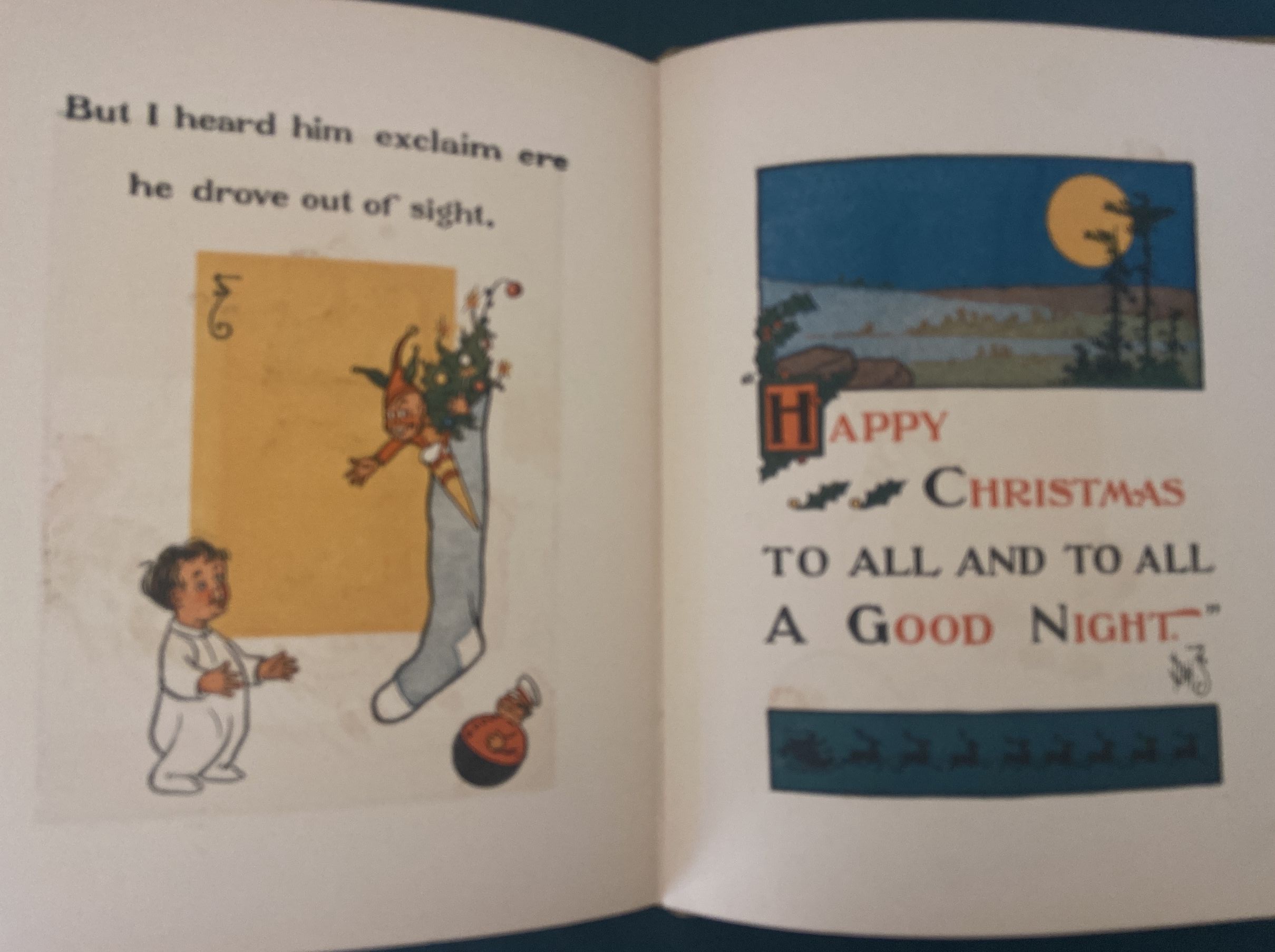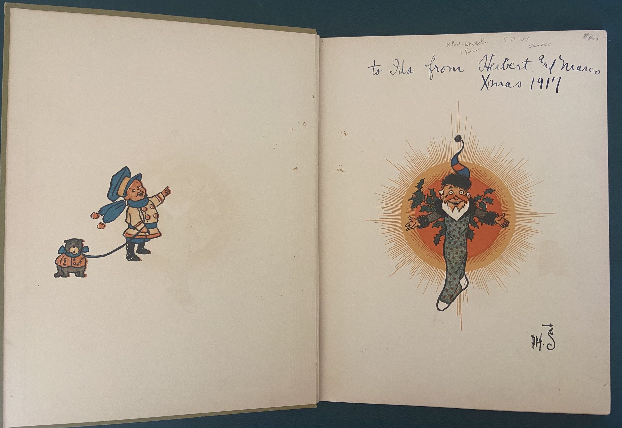 Here is a fabulous book, Denslow’s Night Before Christmas, designed and illustrated by W. W. Denslow of Wizard of Oz fame. Copyright 1902, this is the Donohue version from slightly later–this one with a 1917 inscription. With many incredible and clever full-page color illustrations by Denslow, each signed with the seahorse and “DEN”. Some of the pages actually show famous Baum/Denslow characters as toys in Santa’s bag: the Tin Woodman of Oz and Mother Goose! Very fun, whimsical and classic Denslow style.