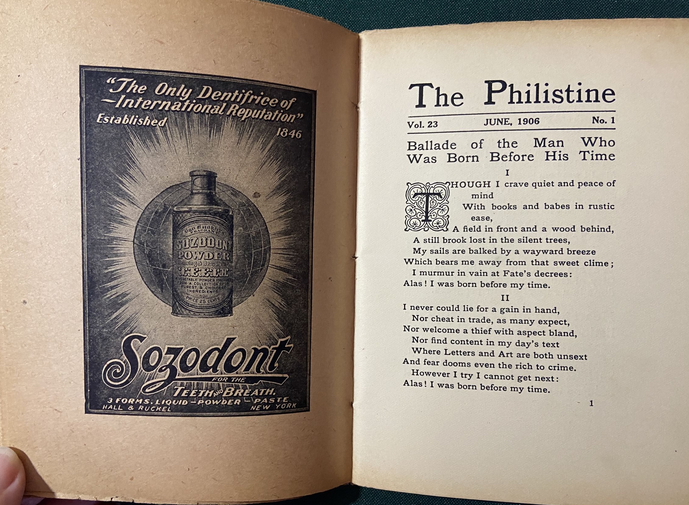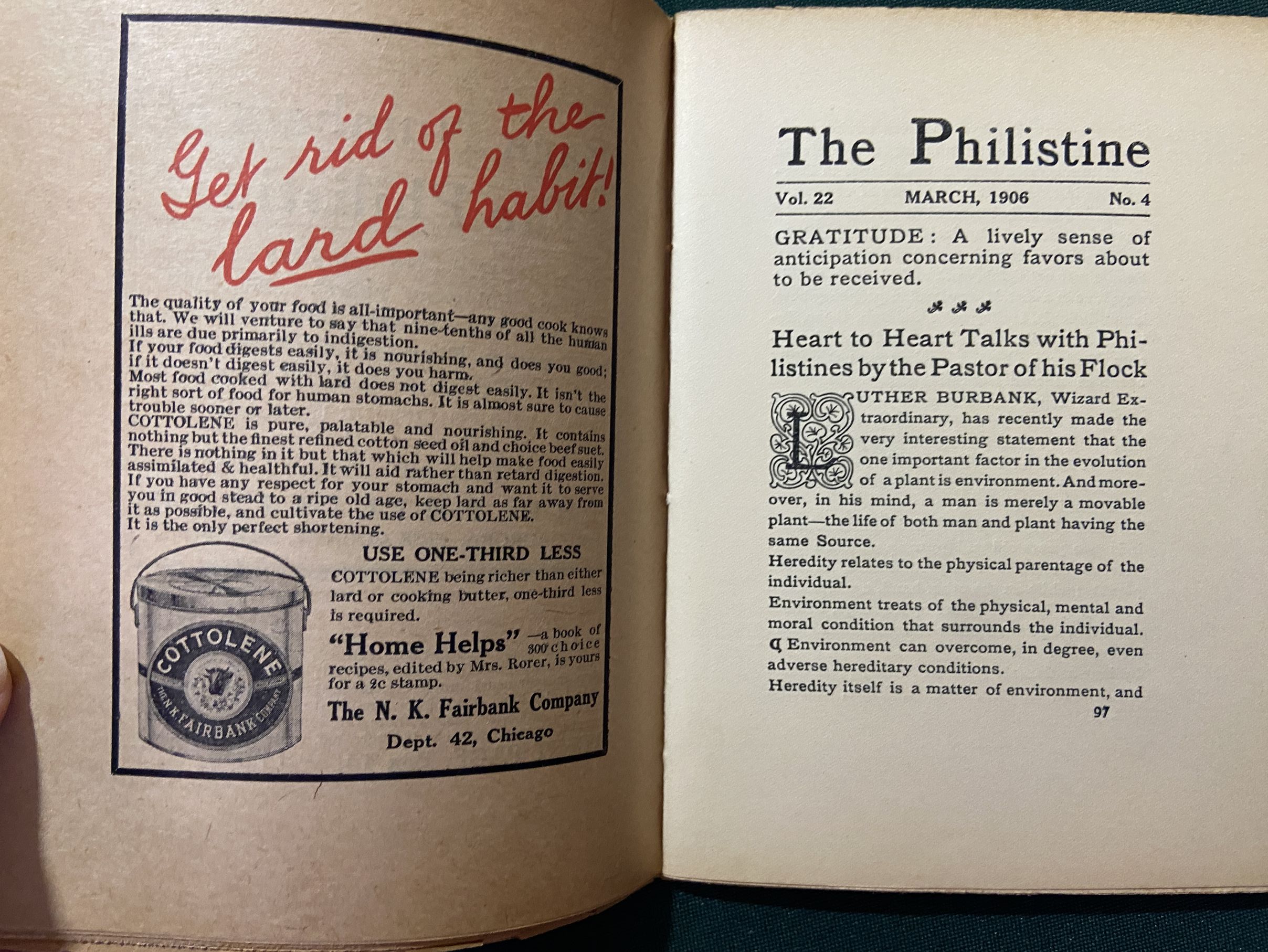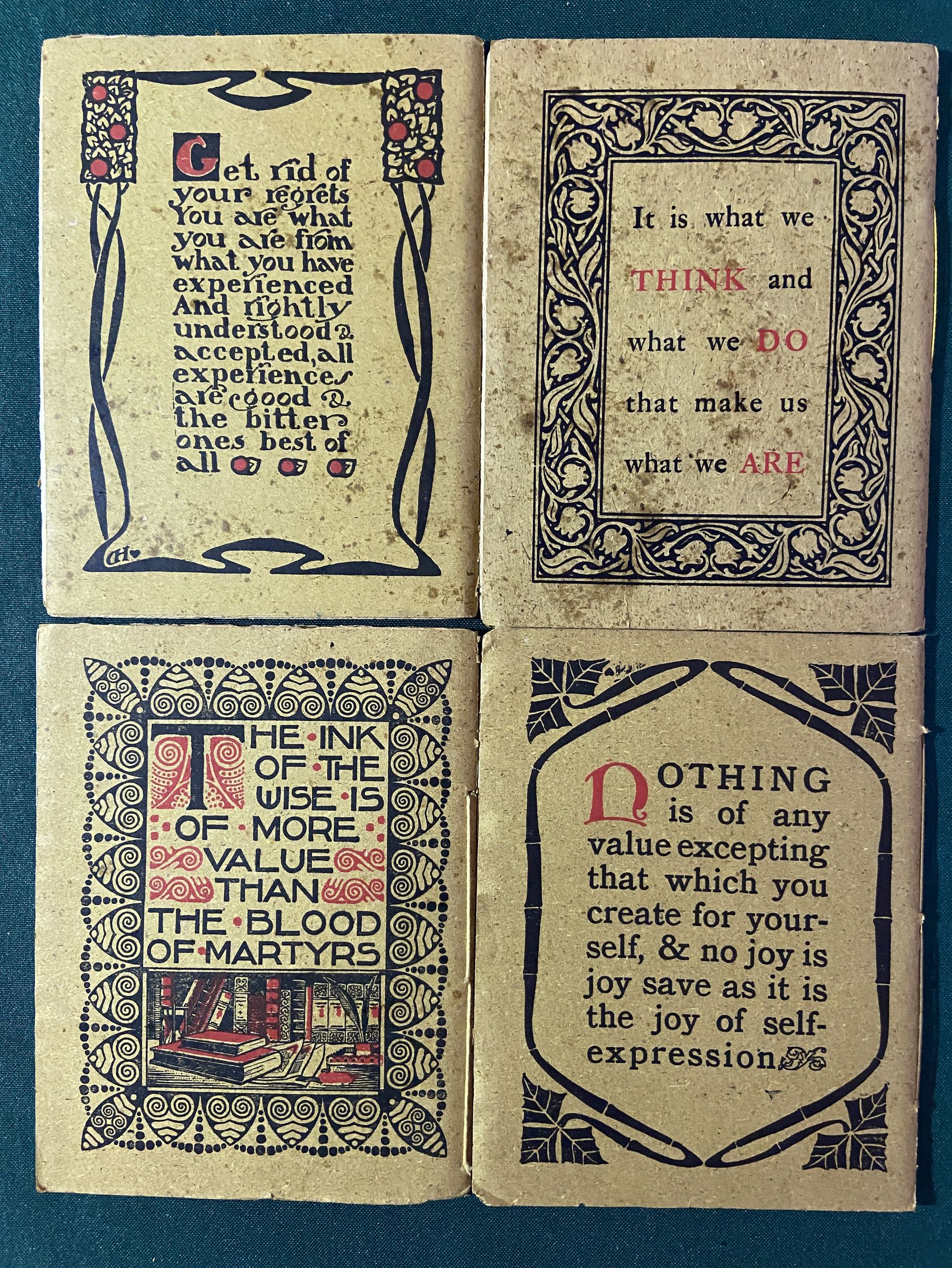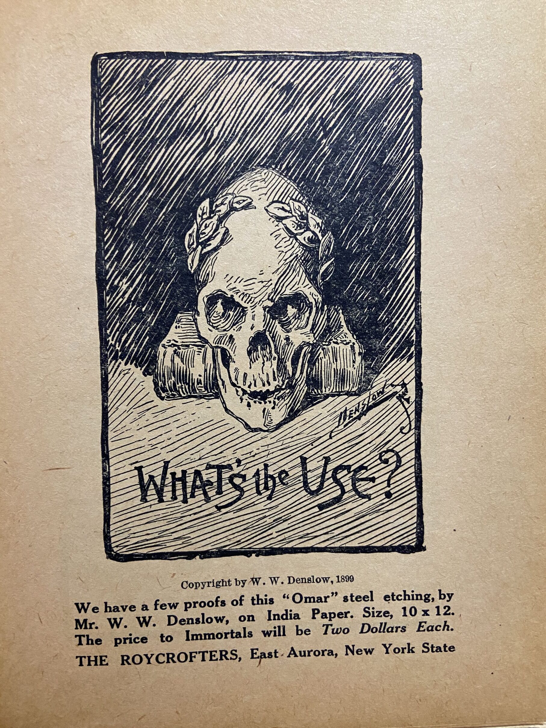 Here are four issues of “The Philistine, A Periodical of Protest”, a Roycroft publication, one (March 1906) with W W Denslow’s sardonic “What’s the Use” skull illustration. This small monthly magazine was put out by Hubbard with social and political commentary. These issues were published between Jan through June of 1906. The front covers also have a Denslow seahorse holding up the volume number. The magazines are complete and also have Hubbard copy and interesting period ads for lotions, potions, ties, etc. Beautiful decorated mottos on the rear cover as well. They are in nice condition with age toning and some light wear.