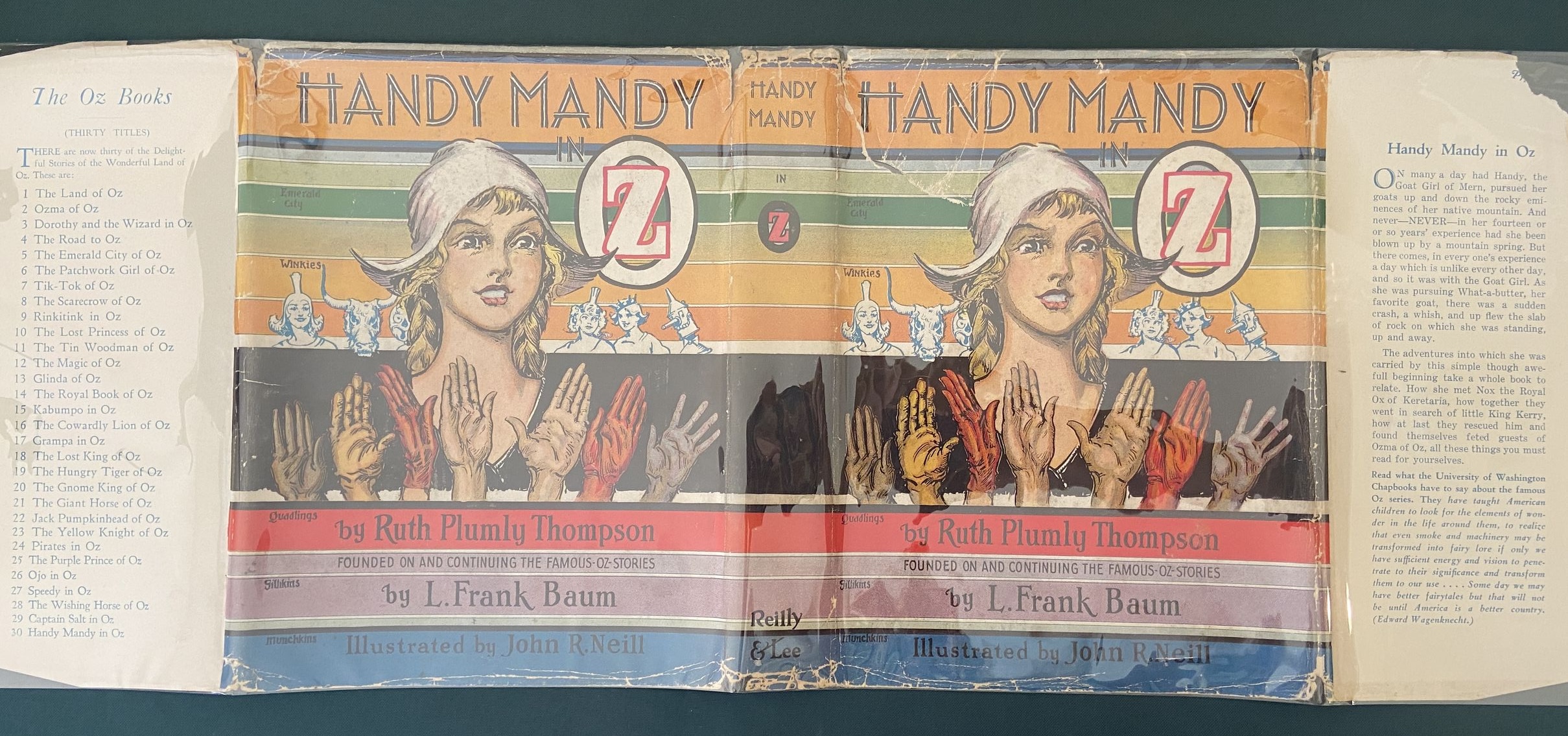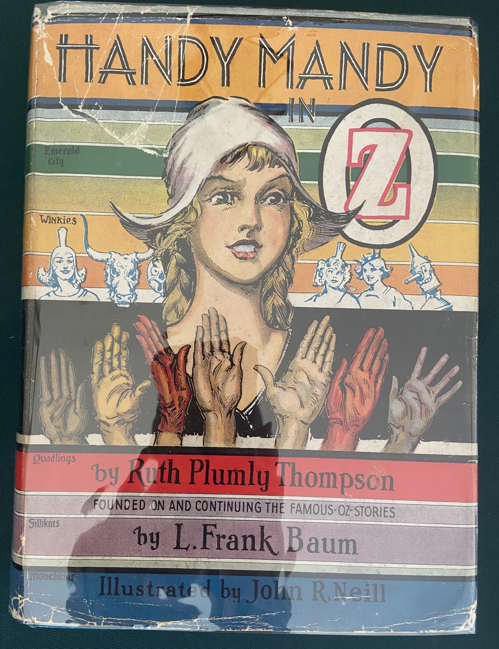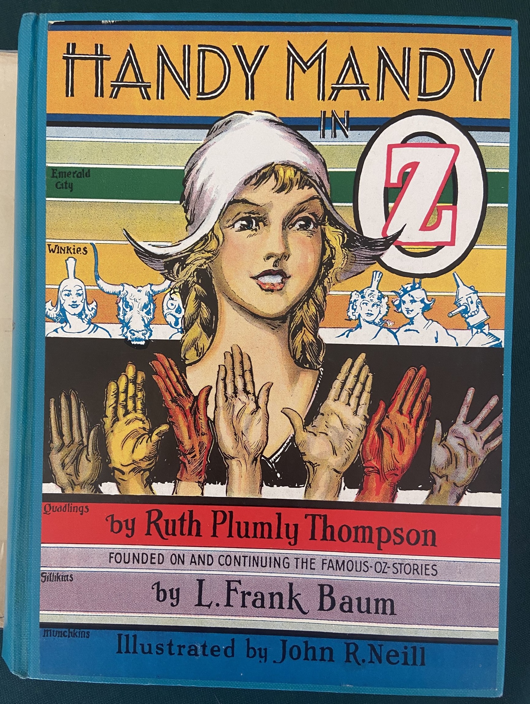 Here is a first edition copy of Handy Mandy in Oz, with the original 1st edition dust jacket! Copyright 1937 by Ruth Plumly Thompson, this is a first edition with Handy Mandy on the spine and 16-page gatherings. With black and white illustrations (as issued) by the famed John R Neill. The book itself is in very good plus condition, with beautiful clean turquoise cloth, tight hinges, light age toning to endpapers, clean pages, and a slight cock to spine. The color dust jacket is good, price-clipped and with some creasing at base, wear to spine ends and a long closed tear to top left of cover. Still quite attractive.
