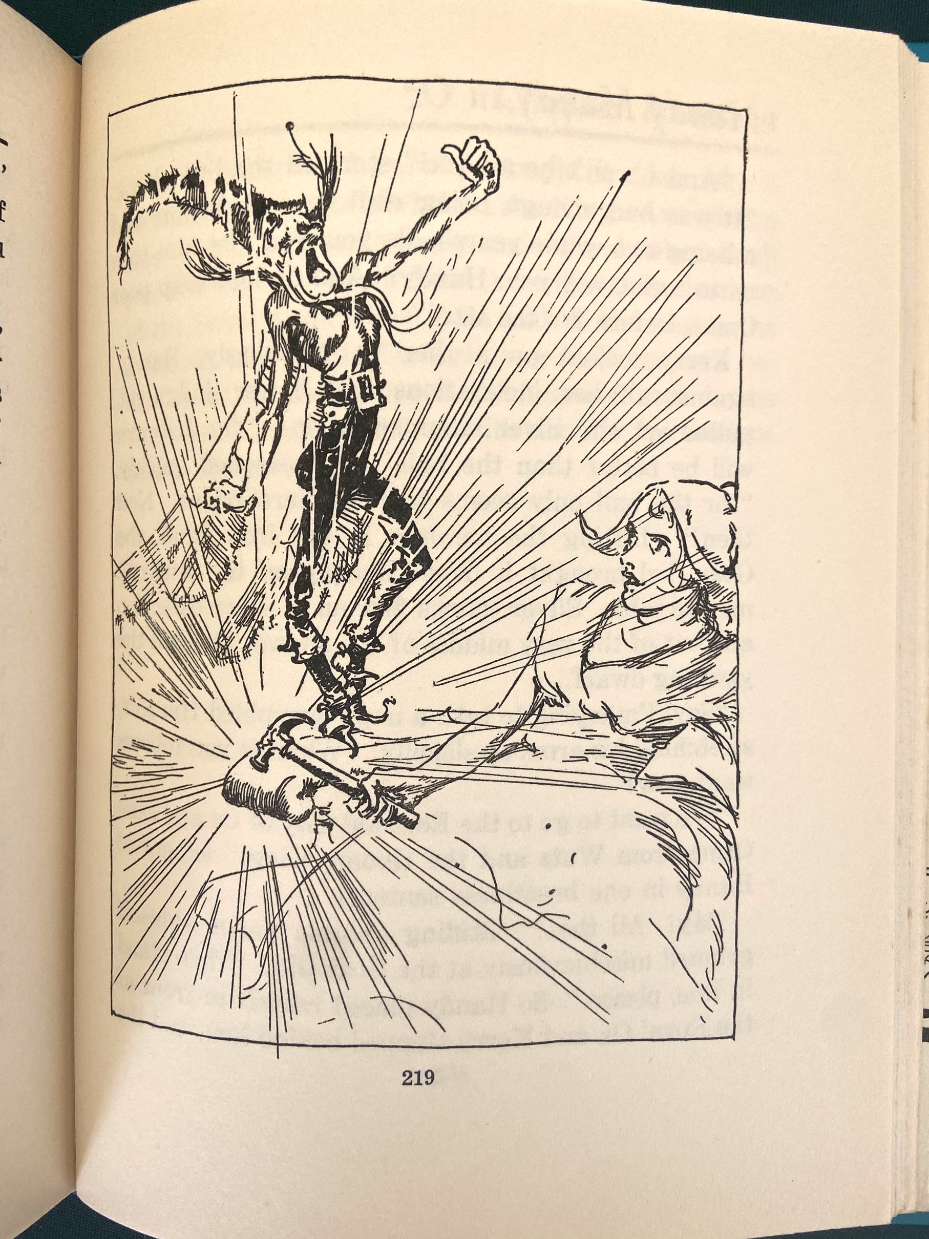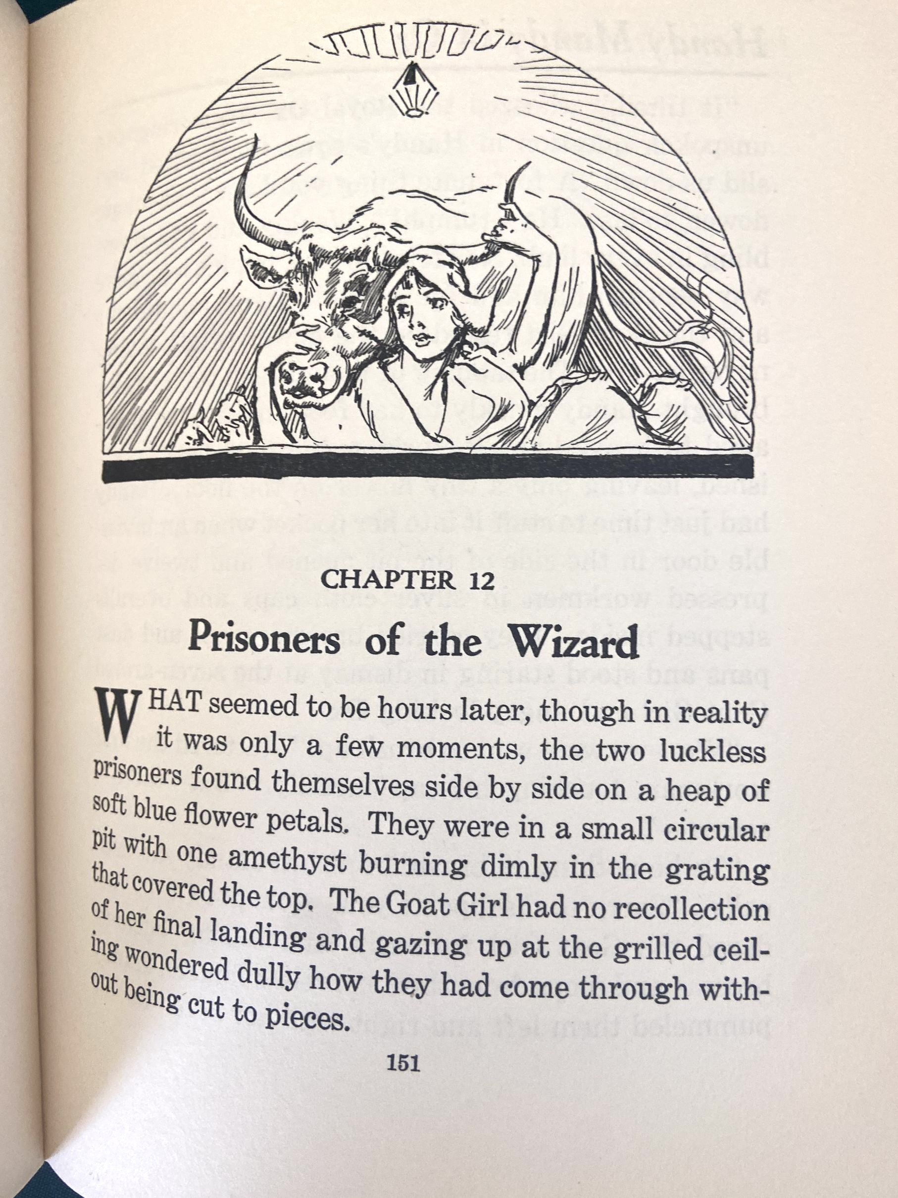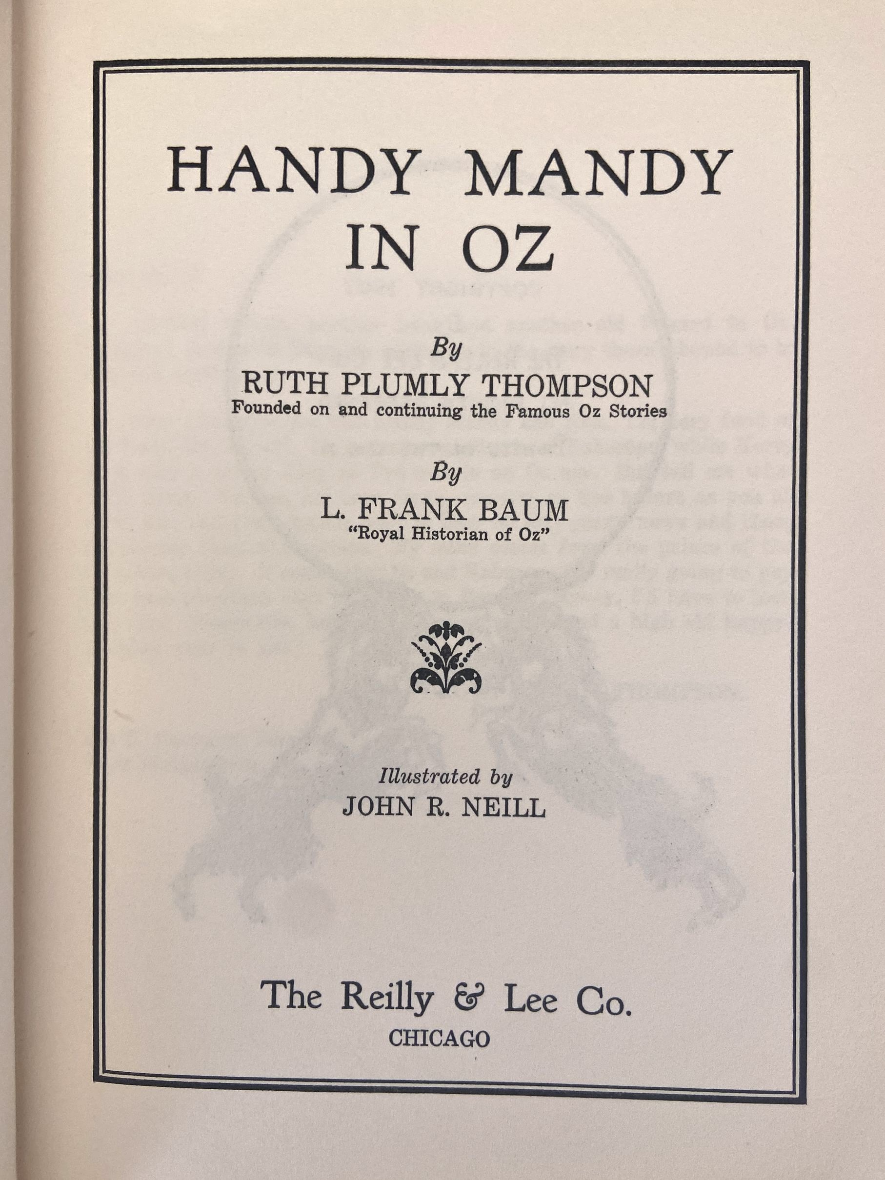 Here is a first edition copy of Handy Mandy in Oz, with the original 1st edition dust jacket! Copyright 1937 by Ruth Plumly Thompson, this is a first edition with Handy Mandy on the spine and 16-page gatherings. With black and white illustrations (as issued) by the famed John R Neill. The book itself is in very good plus condition, with beautiful clean turquoise cloth, tight hinges, light age toning to endpapers, clean pages, and a slight cock to spine. The color dust jacket is good, price-clipped and with some creasing at base, wear to spine ends and a long closed tear to top left of cover. Still quite attractive.