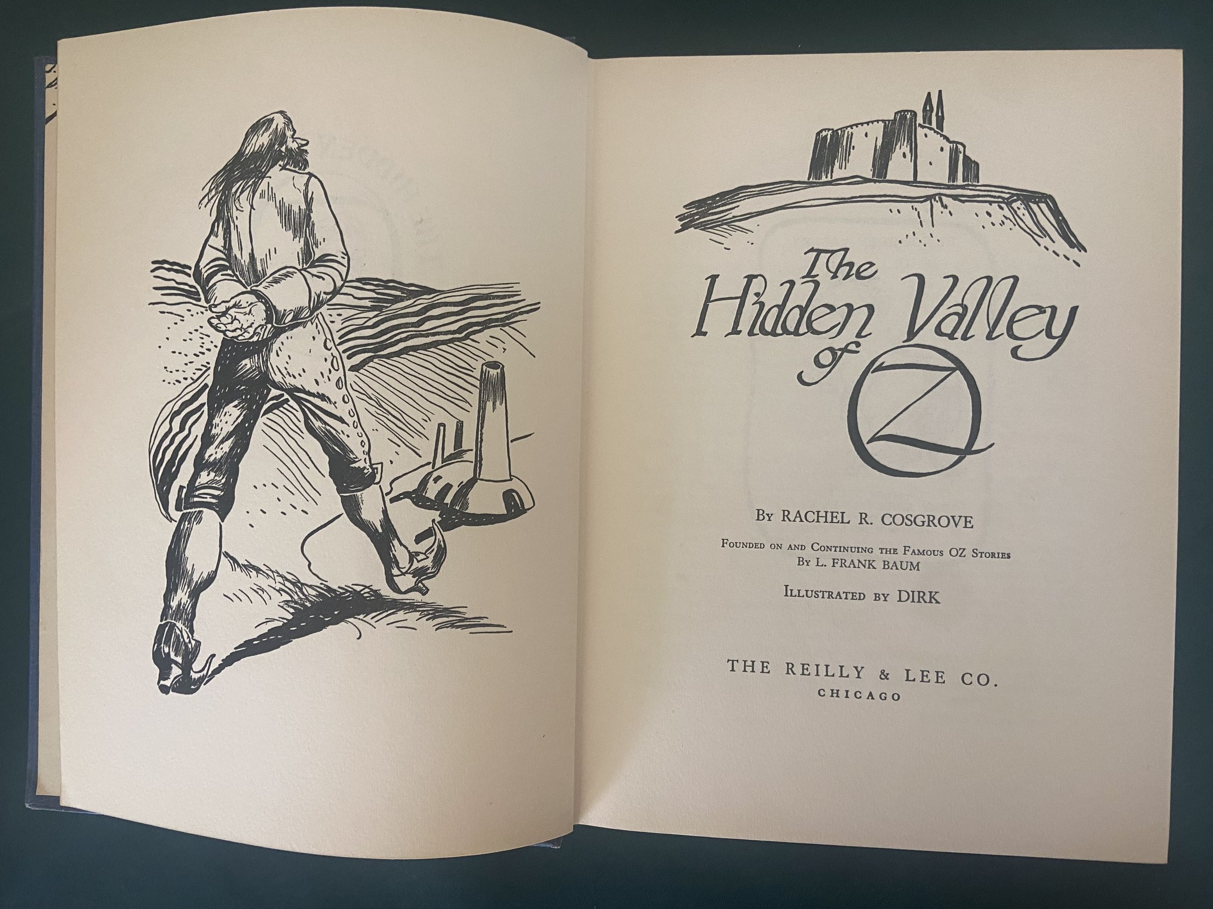 Here is a first edition copy of one of the scarcer Oz books, “Hidden Valley of Oz”, by author Rachel Cosgrove. Copyright 1951 by Reilly & Lee, with the paste-down cover plate in cloth binding A. Illustrations in B&W by Dirk (this book never had color plates).