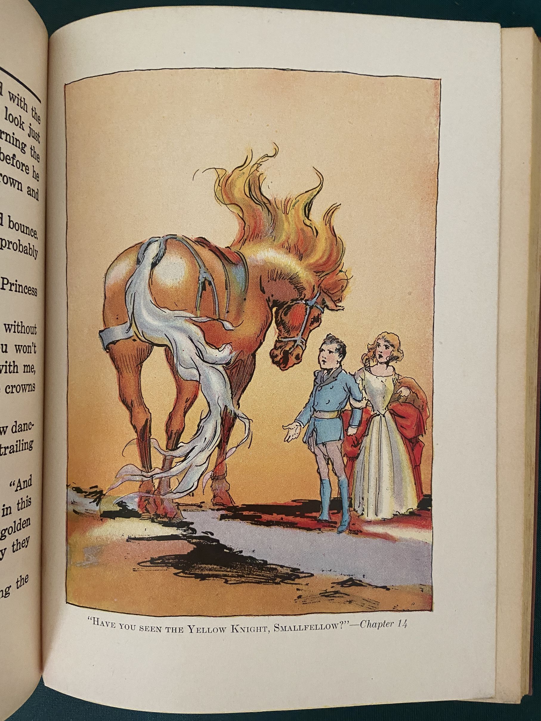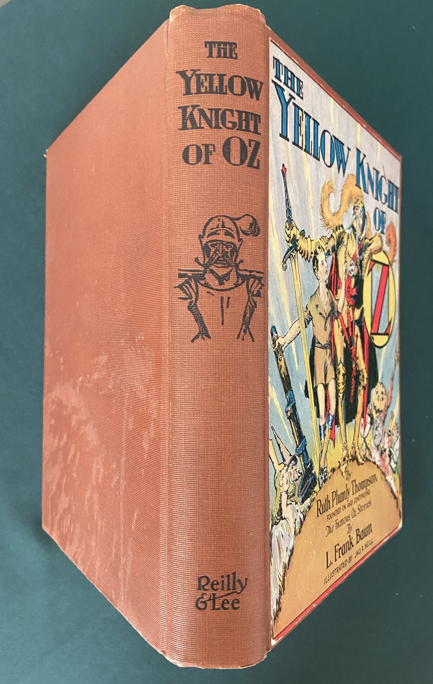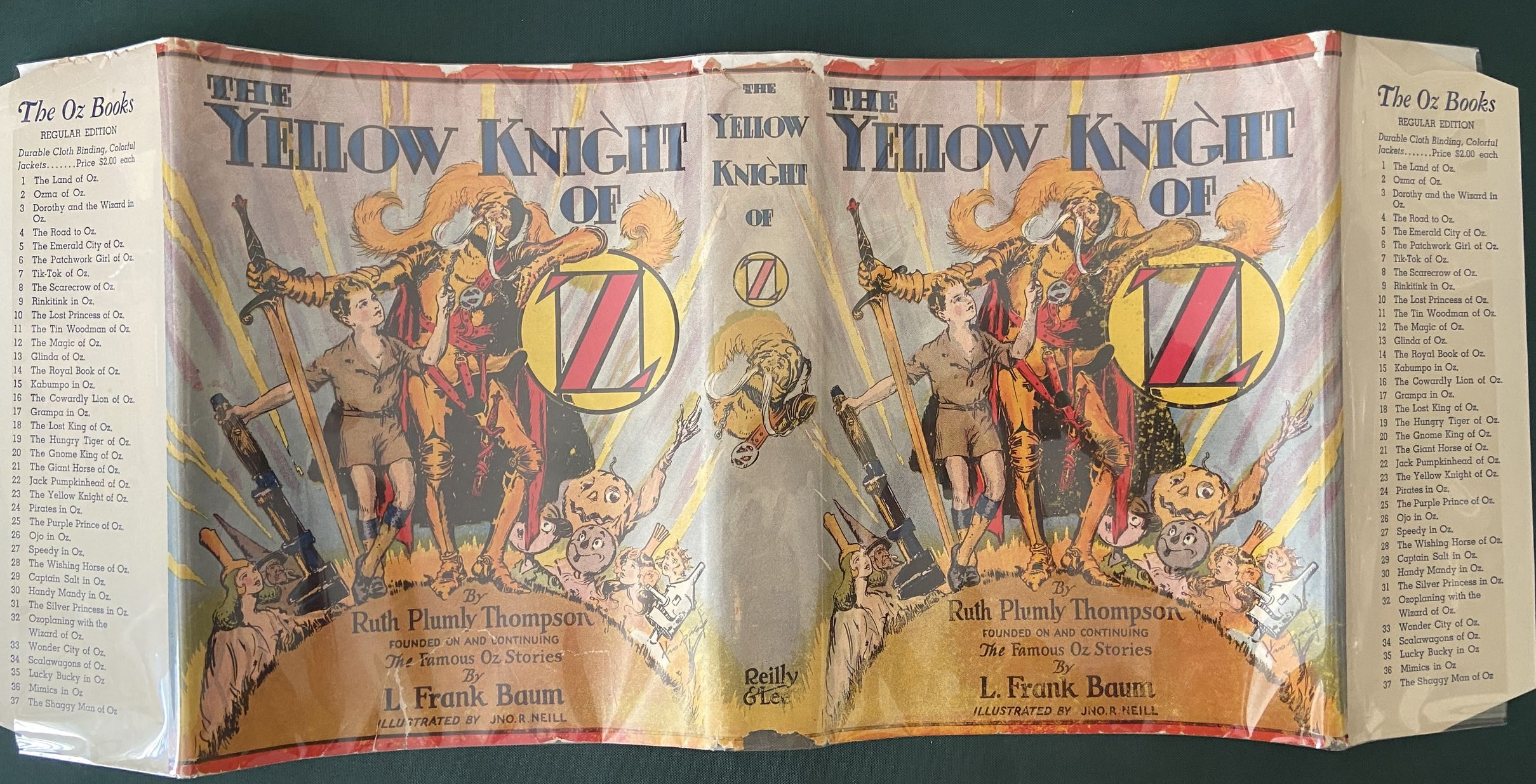 Here is a nice copy of “The Yellow Knight of Oz”, one of the harder to find and thus more desirable vintage Oz titles. Written by Ruth Plumly Thompson, successor to L. Frank Baum. Copyright 1930 by Reilly & Lee, this is a first edition with 12 fabulous color plates by John R. Neill–plus one bonus plate–a duplicate of the one opposite p 40 is also tipped in opposite p 32–for 13 total! With illustrated endpapers, in the “B” binding state with semi-script “Reilly & Lee” on spine (Book Collector’s Guide to L Frank Baum). Brick red cloth, in a later dust jacket listing titles to Shaggy Man of Oz (1949).