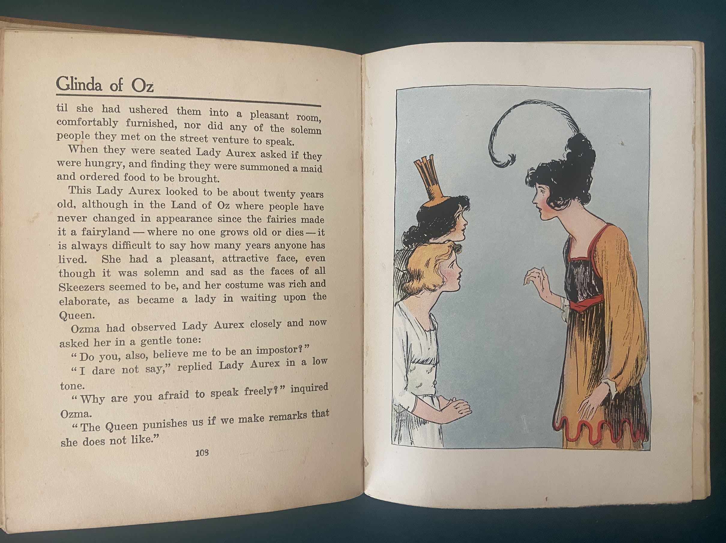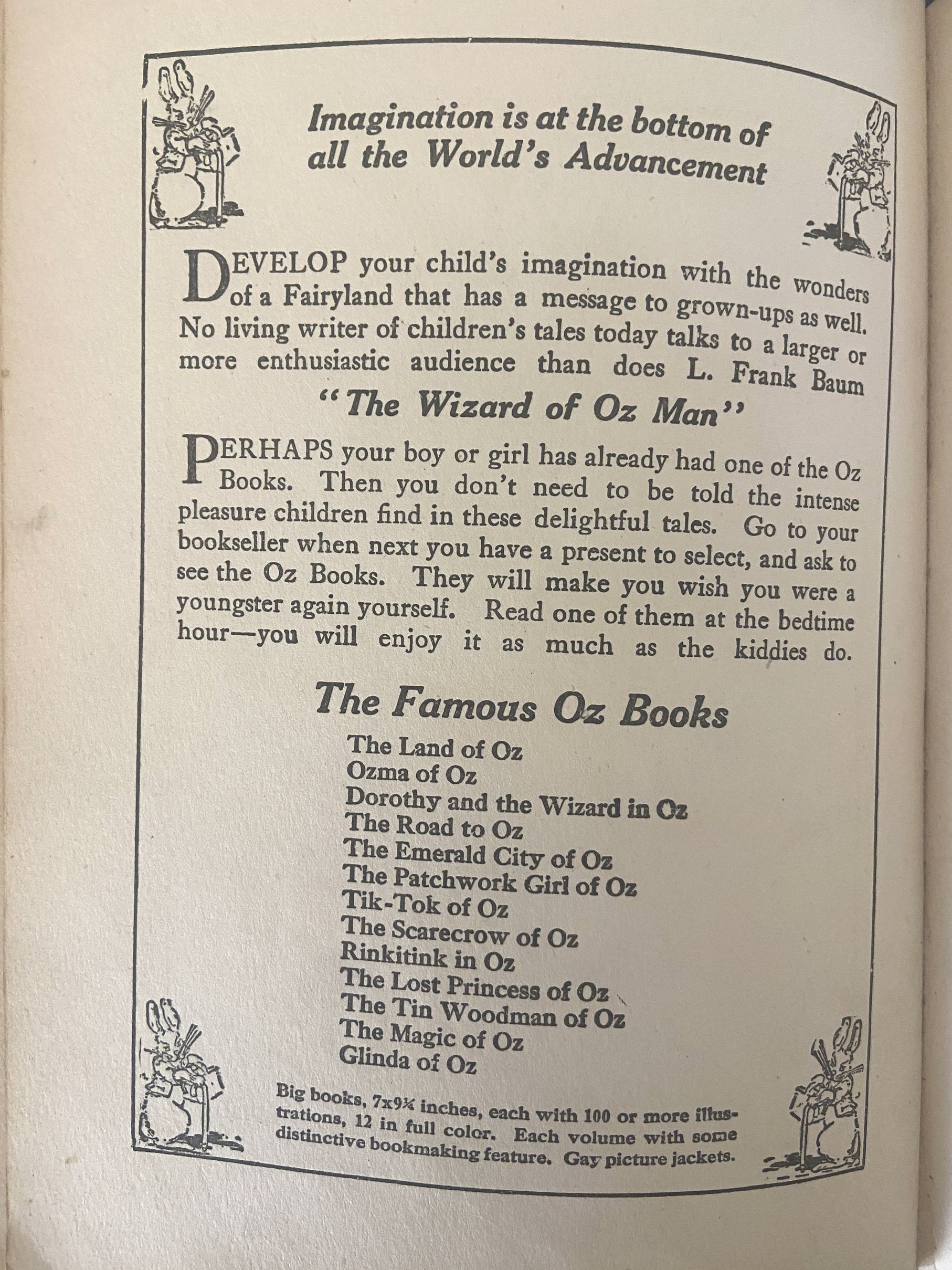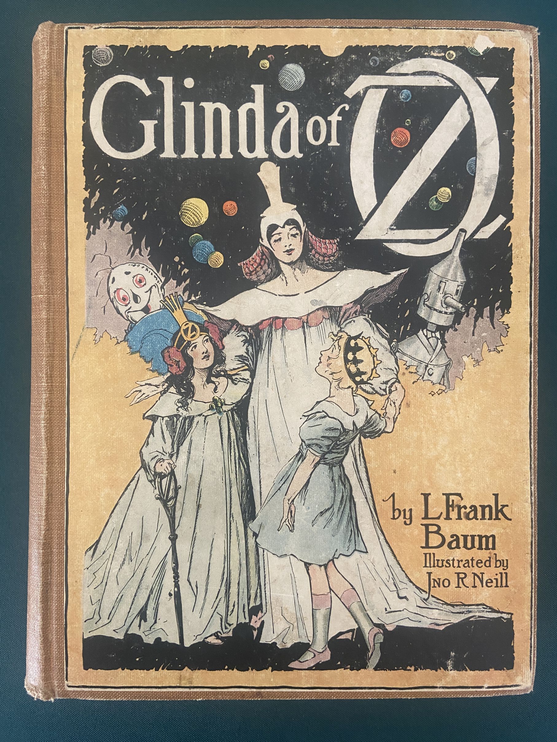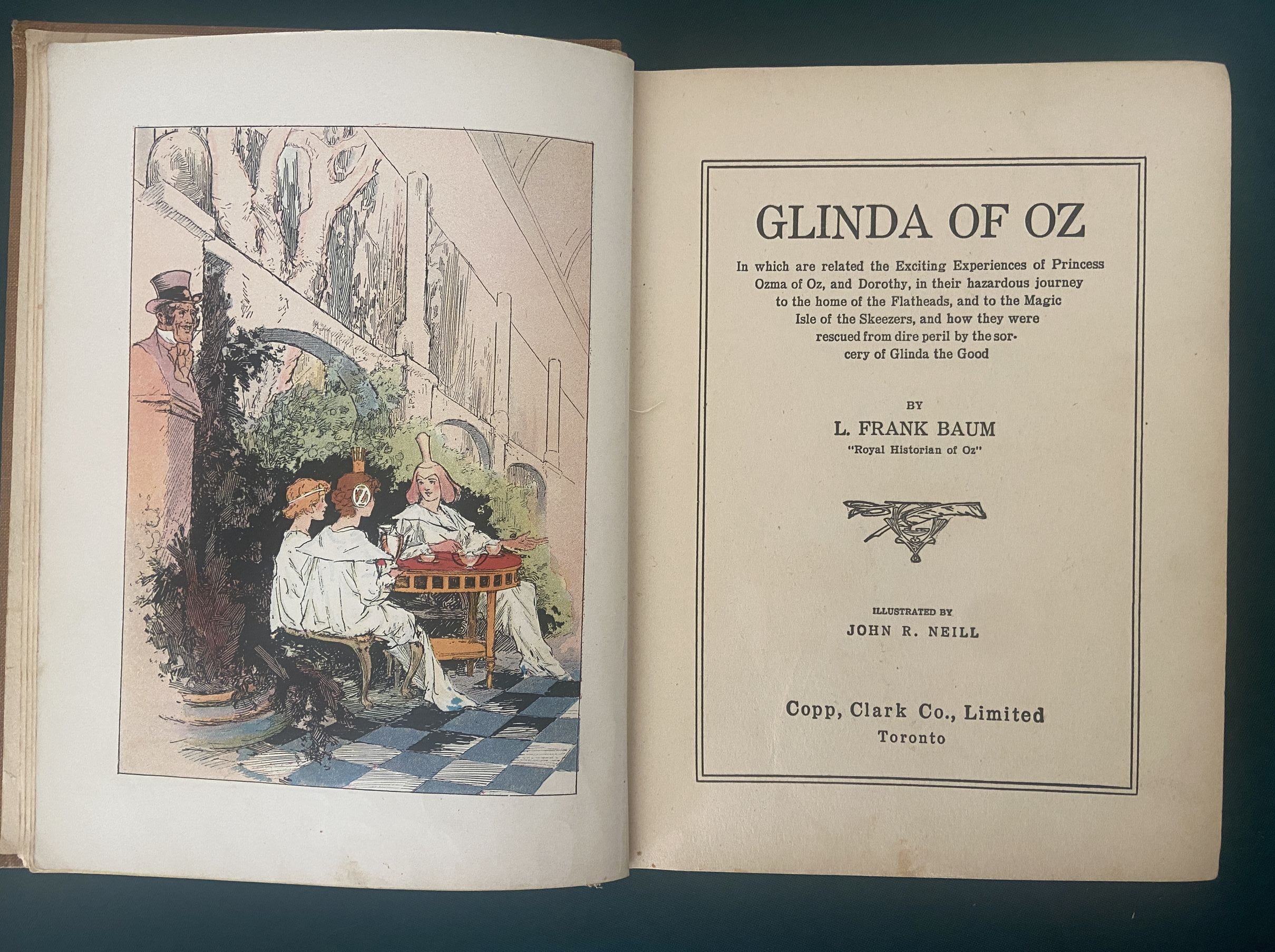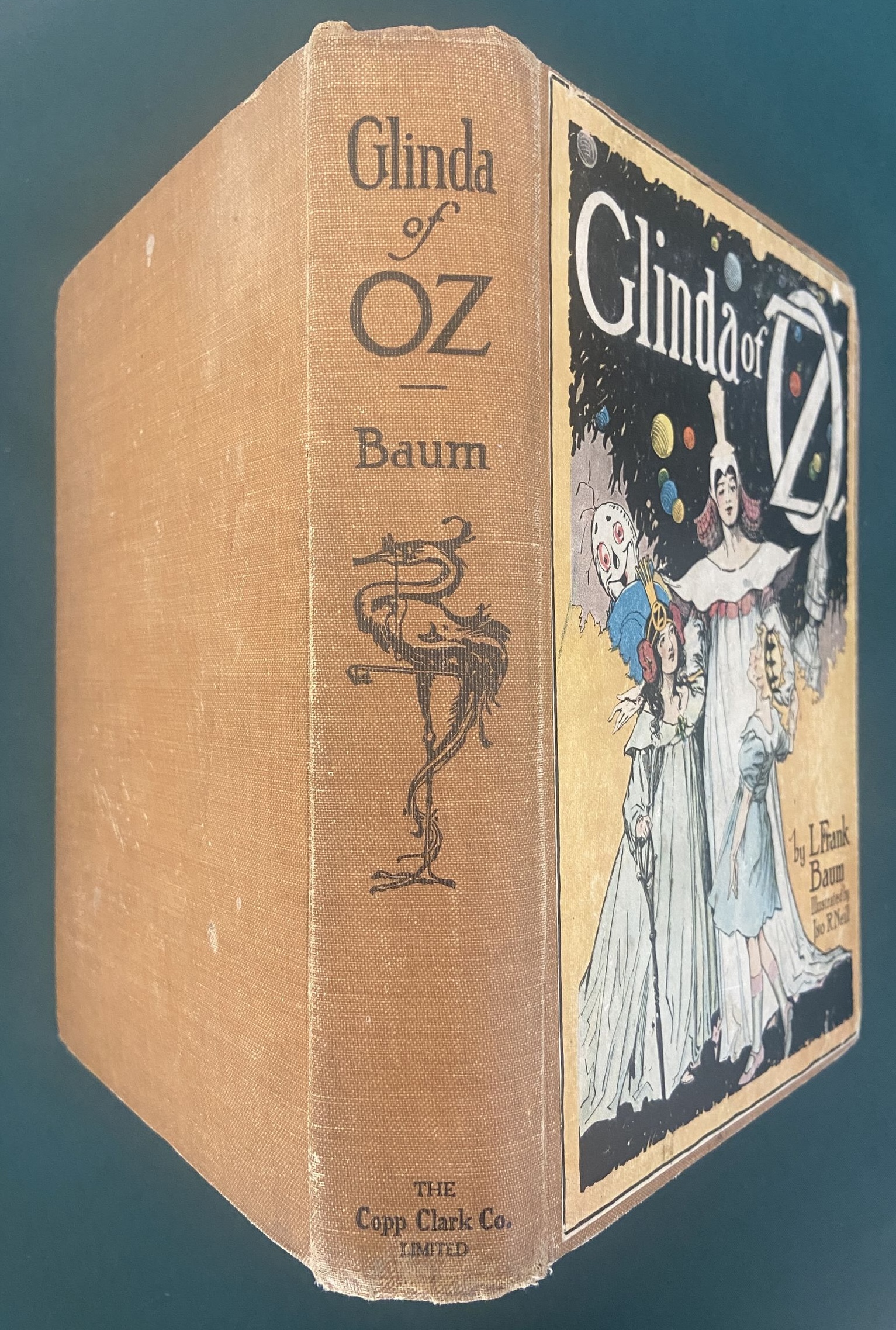 On Reserve for R: do not purchase please! Here is a hard to find copy of the first edition/first state of Glinda of Oz. Not only that, this is the first Copp Clark (Canadian) edition. Oz experts know that Copp-Clark published many of the Oz books simultaneously with the first editions of Reilly & Britton, and that they are much rarer than the American editions. See “Oz in Canada” reference book for more information, where C. J. Hinke says, “Collectors of Oz books have long recognized that Copp Clark Copies are very scarce”. This book is a Copp Clark first, with their imprint on both the spine and the title page. Copyright 1920, written by L. Frank Baum. With all the first printing points as in Bibliographia Oziana–Glinda of Oz last title in list on back of half-title page; ad for Oz-Man tales in the back. Also contains 12 beautiful color plates by John R. Neill.