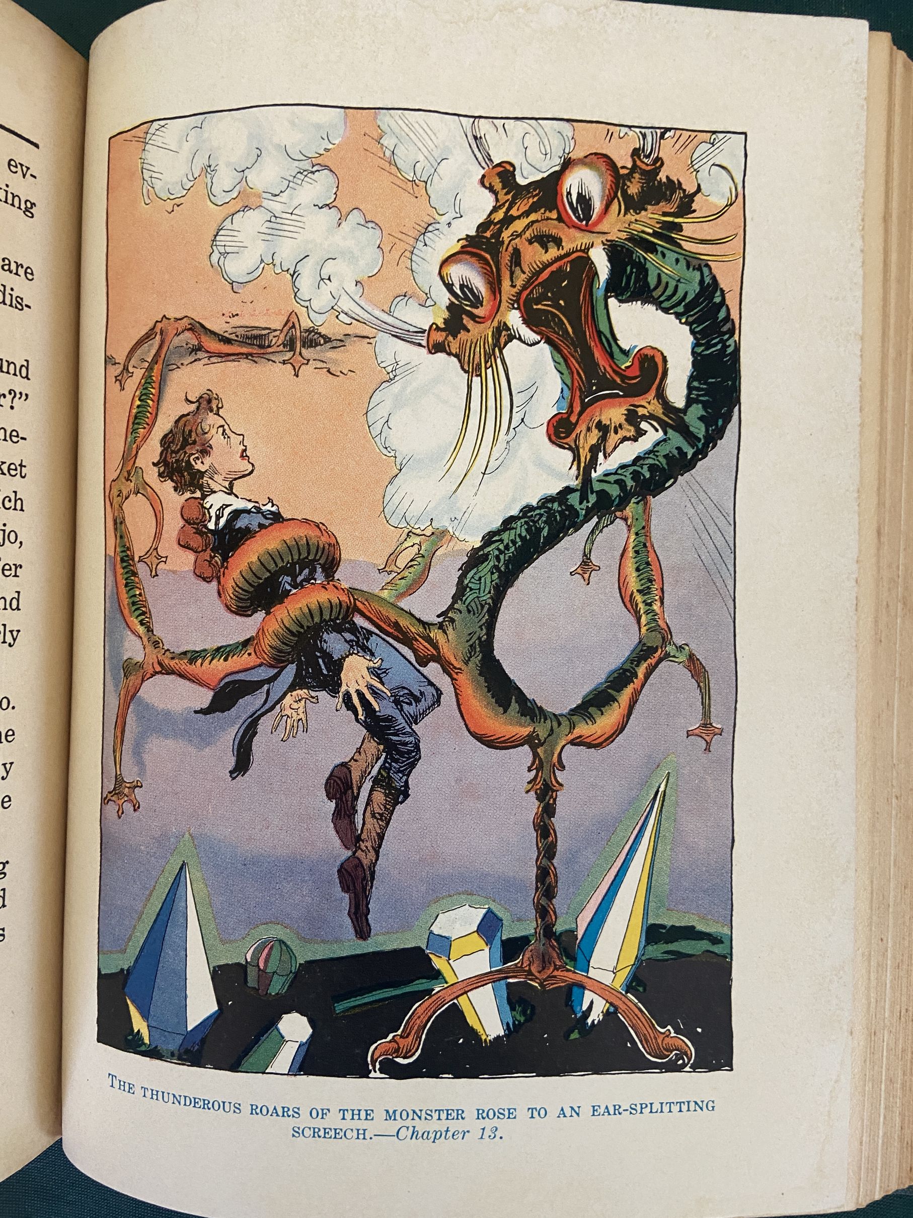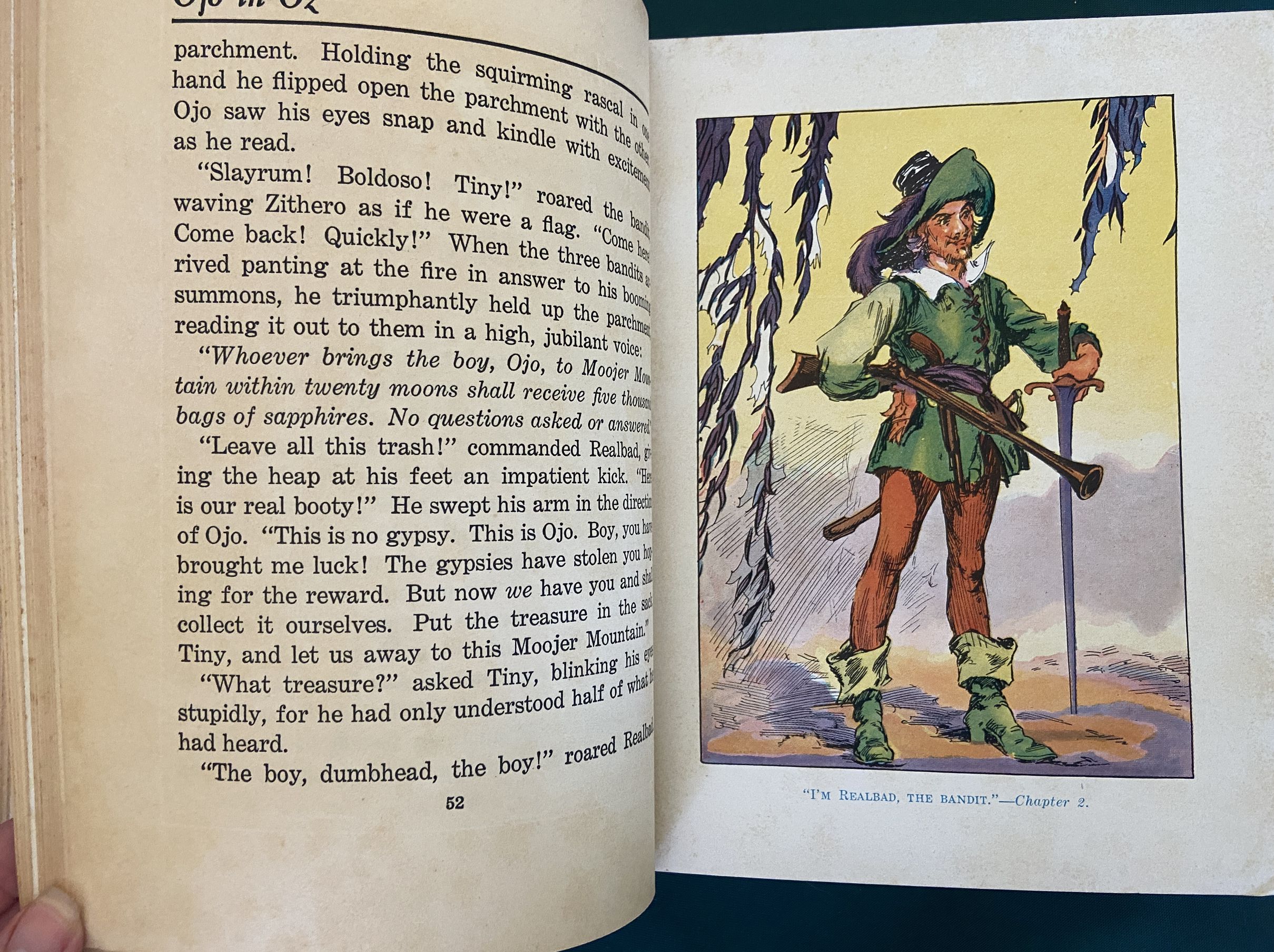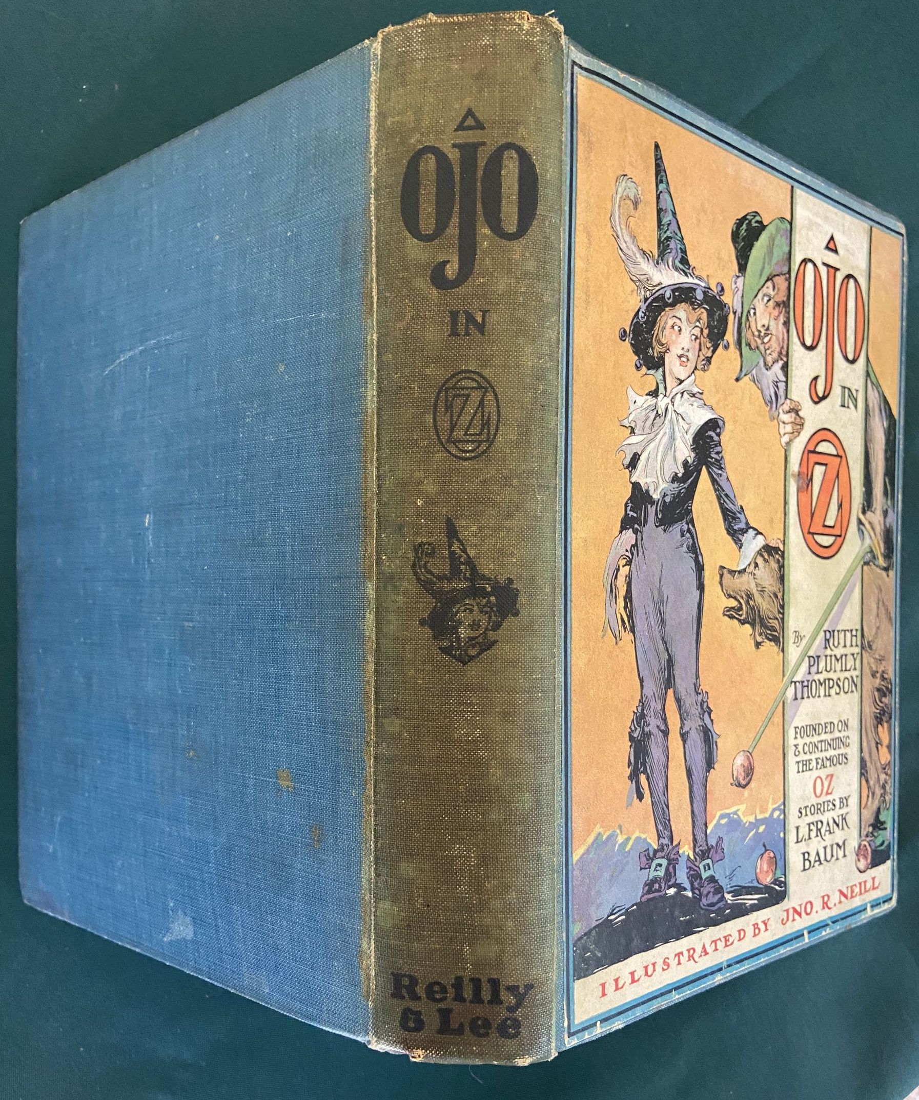 Here is a first edition copy of “Ojo in Oz”, one of the harder to find and thus more desirable vintage Oz titles. Written by Ruth Plumly Thompson, successor to L. Frank Baum. Copyright 1933 by Reilly & Lee, this is a 1st edition, first printing with 12 beautiful color plates by John R. Neill. This book was only issued for about 2 years with the plates, because In 1935 Reilly & Lee stopped including the color plates to cut costs. This book also is in the “A” binding, according to the Book Collector’s Guide to Baum, with the boldface publisher’s imprint.