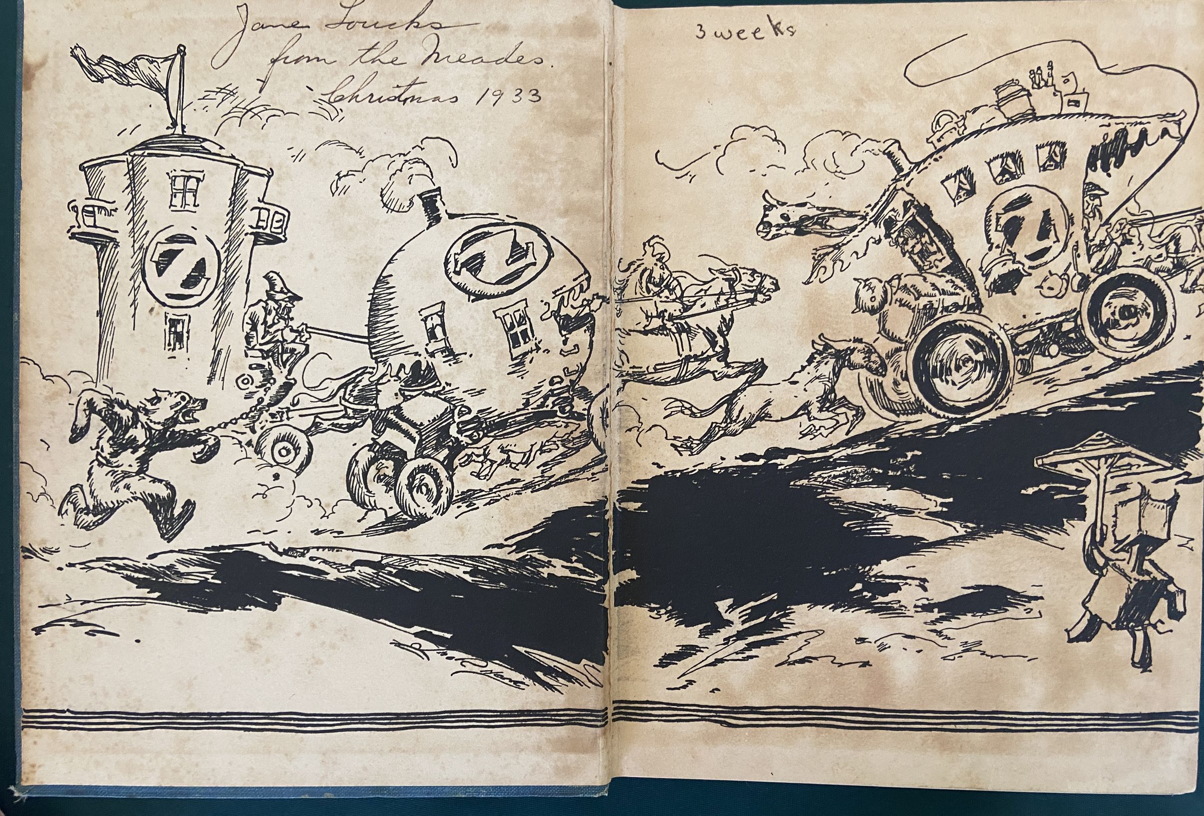The book is in good condition, with some wear. The cover pastedown has some wear to edges, the spine cloth is faded and a little spotted, and there is some staining to rear cover. Inside, both hinges are slightly cracked but the binding is tight. Heavy age toning and wear with a 1933 gift inscription and “3 weeks” written on endpaper–perhaps how long it took little Jane Louchs to read? Ownership page is blank. All 12 plates are present and still attractive, though there is a little staining at lower right and age toning and light foxing to pages opposite and behind.