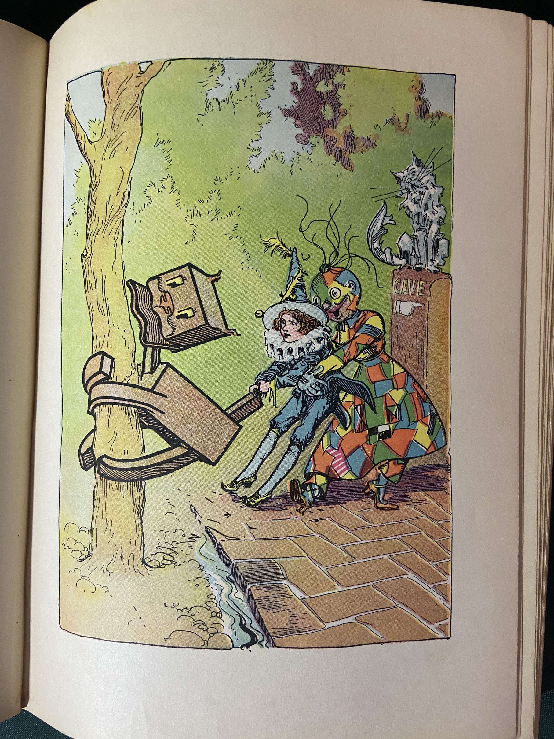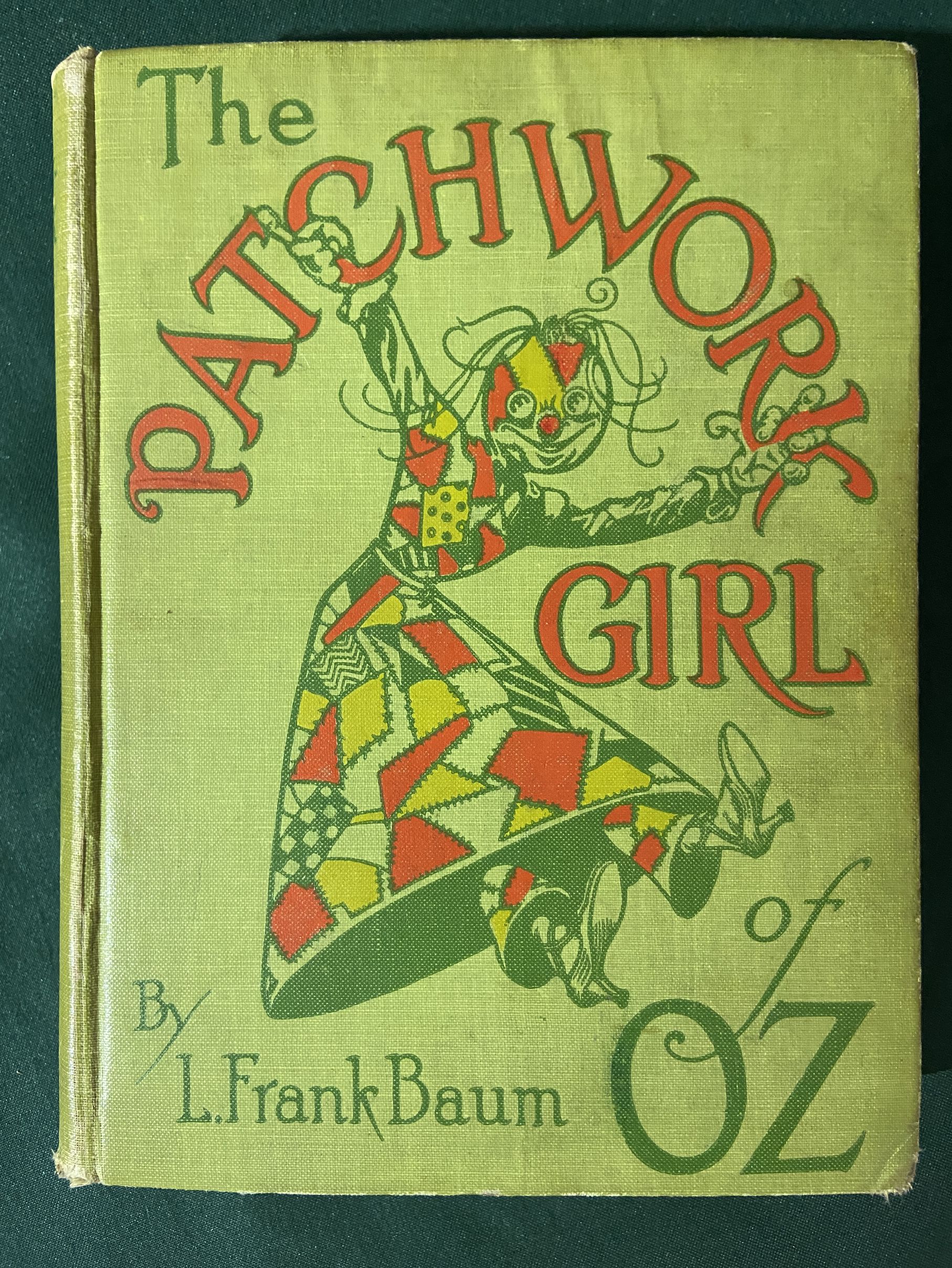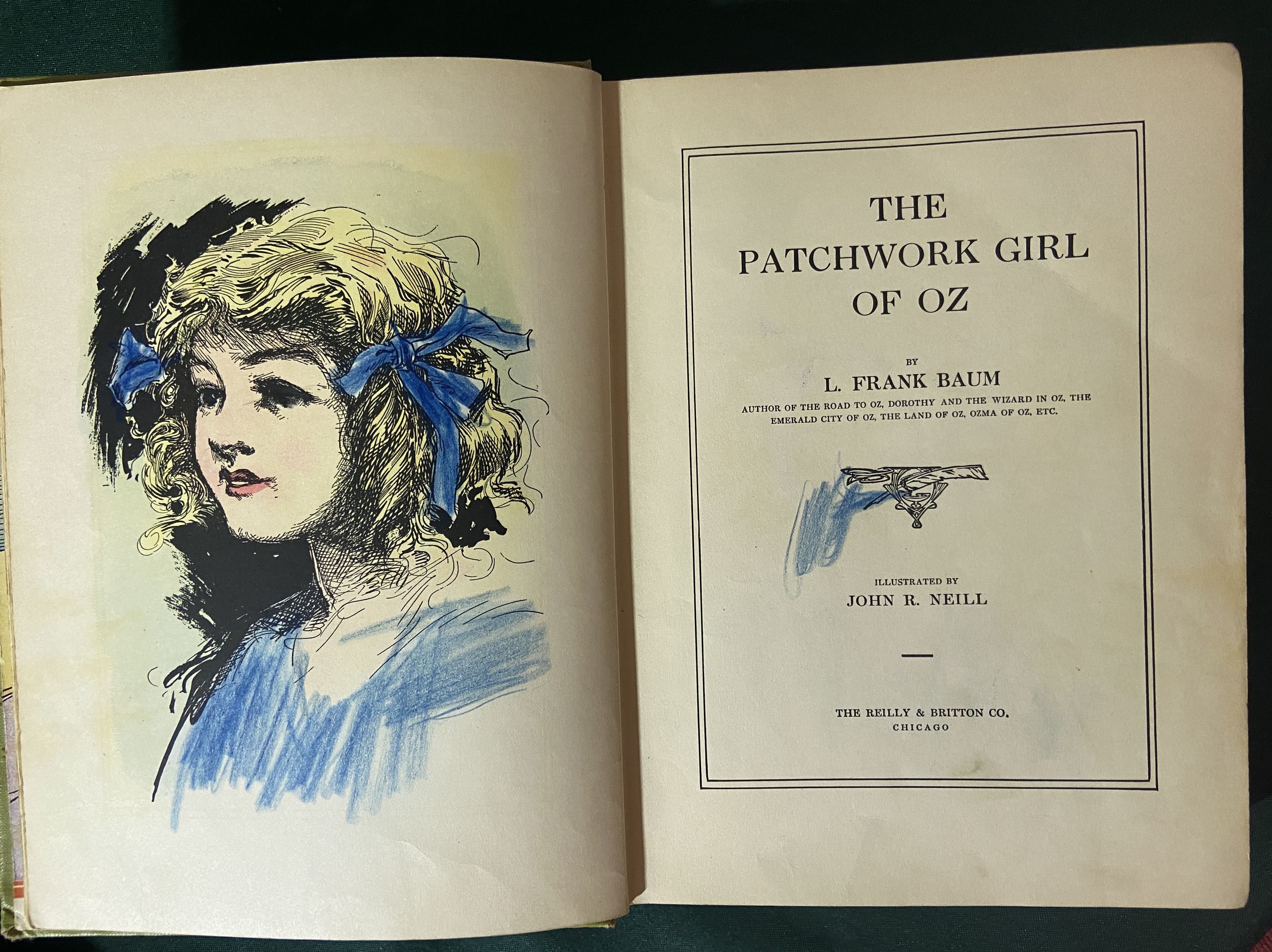Here is a first edition of The Patchwork Girl of Oz published by Reilly & Britton in 1913. Written by L. Frank Baum, this is a first edition, first printing, with “Reilly & Britton” on the spine. According to the Book Collector’s Guide to Baum, this is also a second state of the first edition, first printing, because it doesn’t have the “C” on page 35 overlapping the text. A little confusing, but there you have it. Primary light green binding. Beautiful color illustrated endpapers, and many, many color illustrations throughout the text.