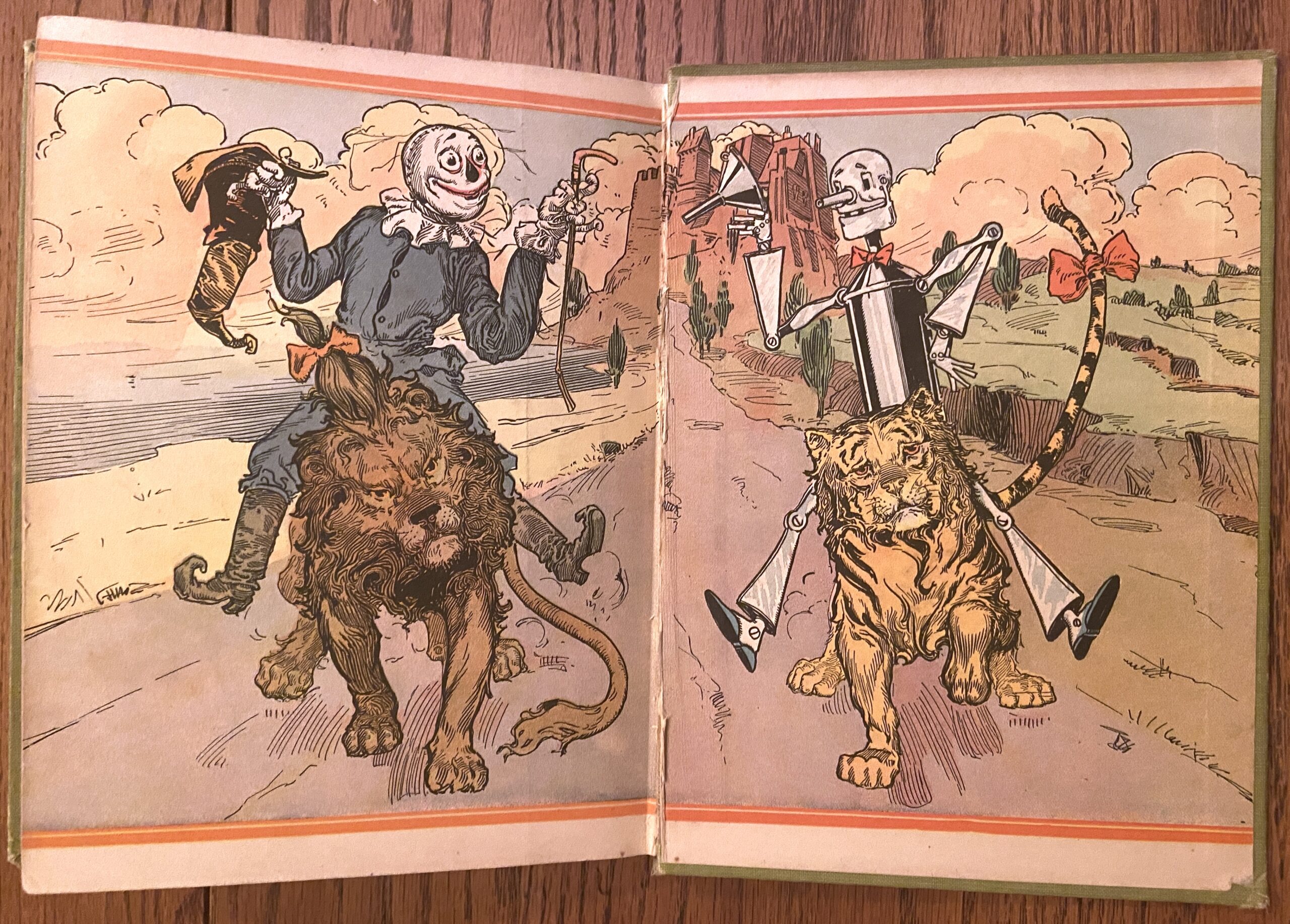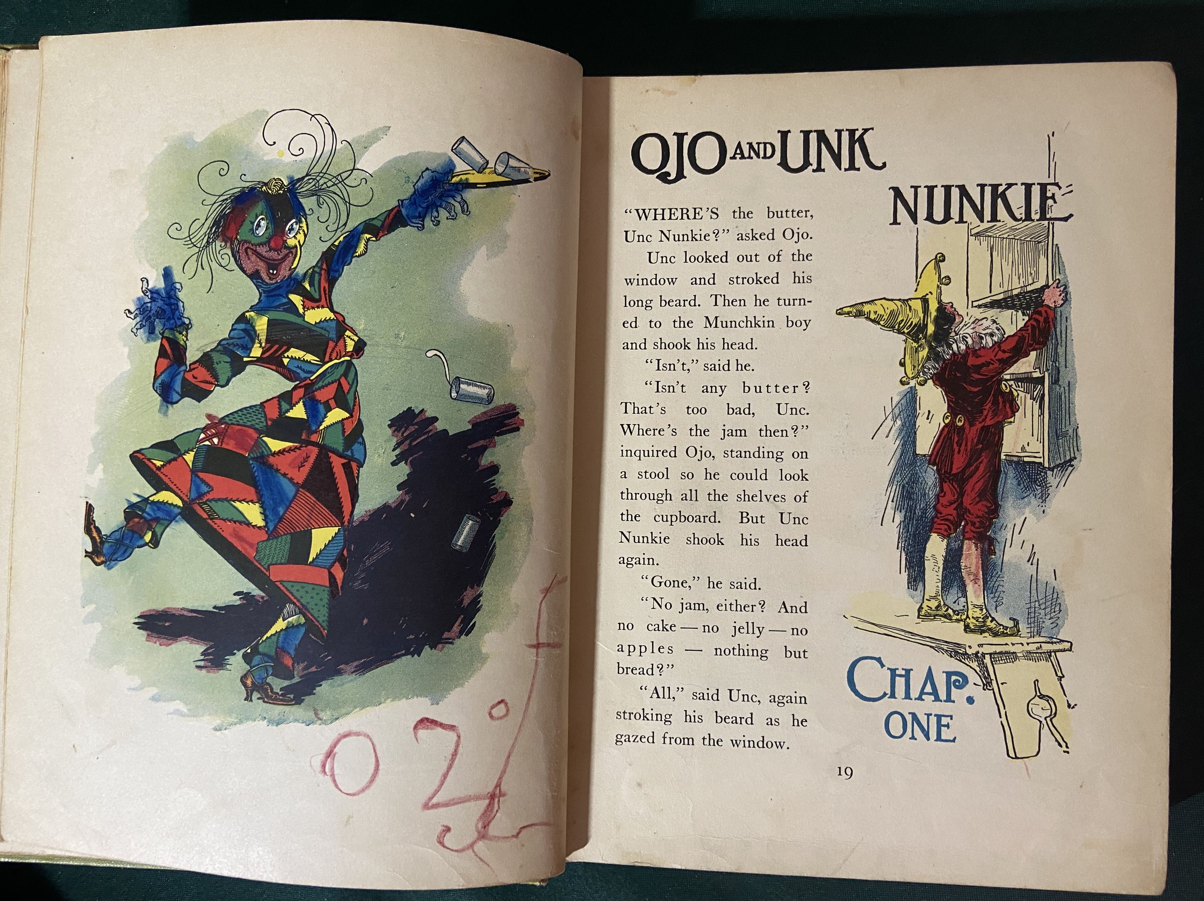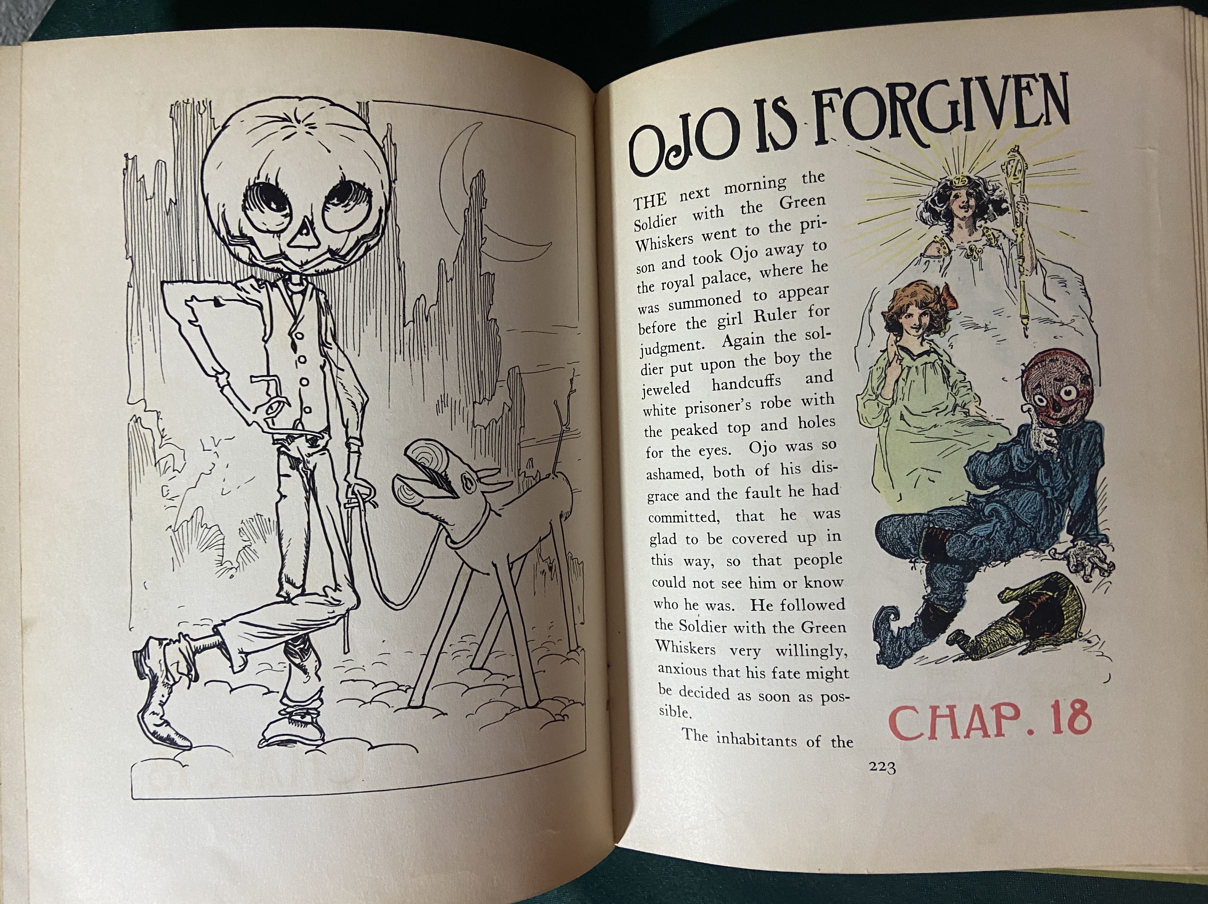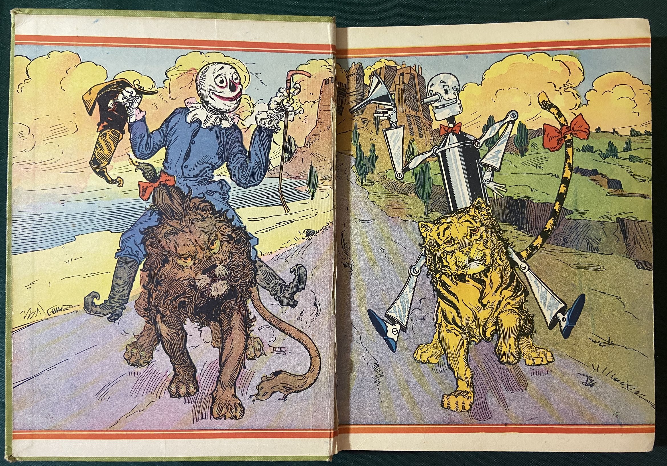 Here is a first edition of The Patchwork Girl of Oz published by Reilly & Britton in 1913. Written by L. Frank Baum, this is a first edition, first printing, with “Reilly & Britton” on the spine. According to the Book Collector’s Guide to Baum, this is also a second state of the first edition, first printing, because it doesn’t have the “C” on page 35 overlapping the text. A little confusing, but there you have it. Primary light green binding. Beautiful color illustrated endpapers, and many, many color illustrations throughout the text.