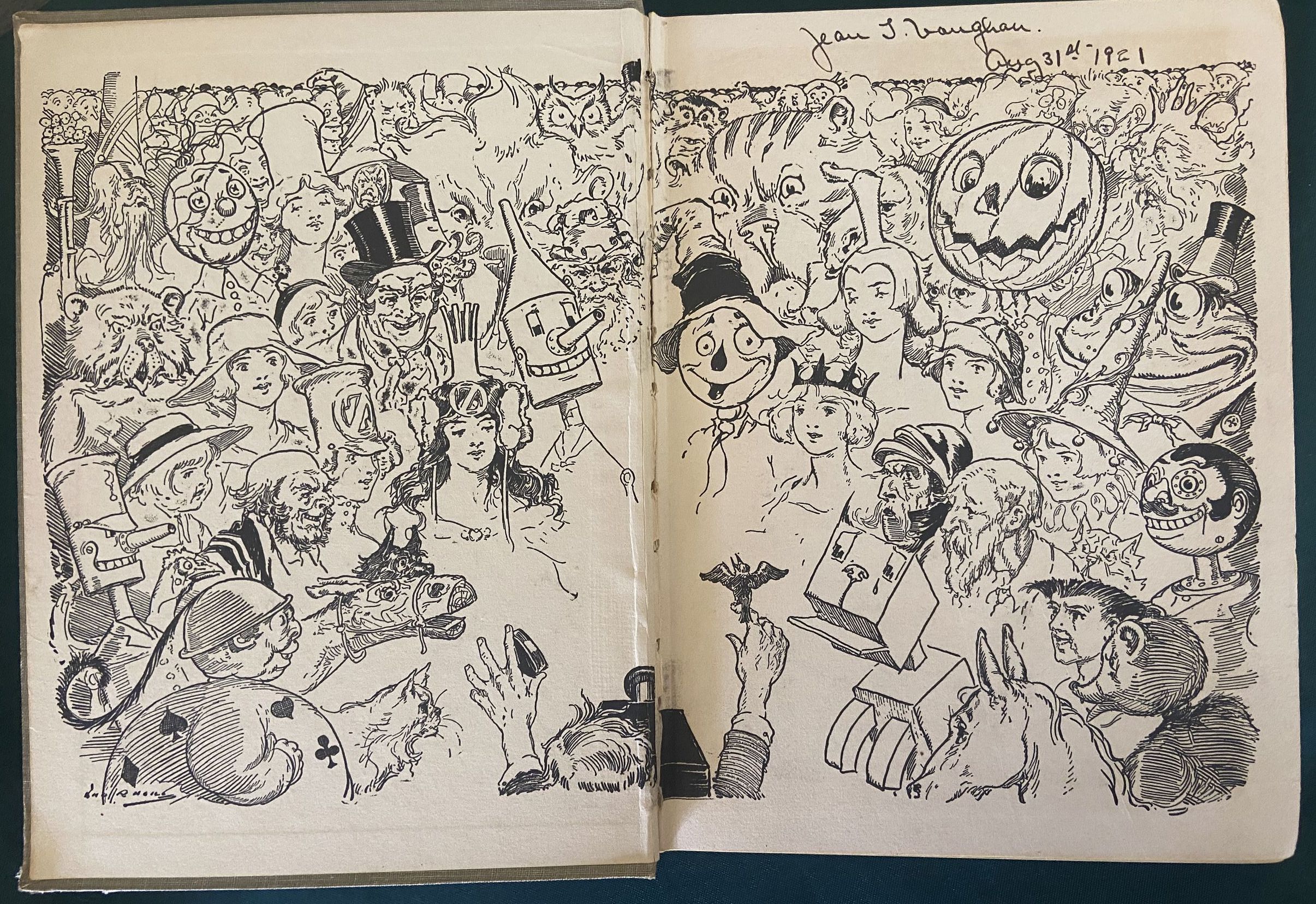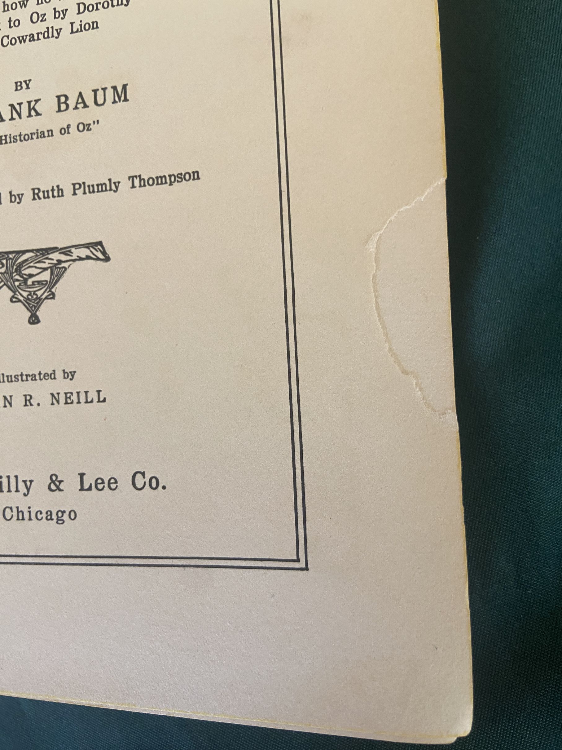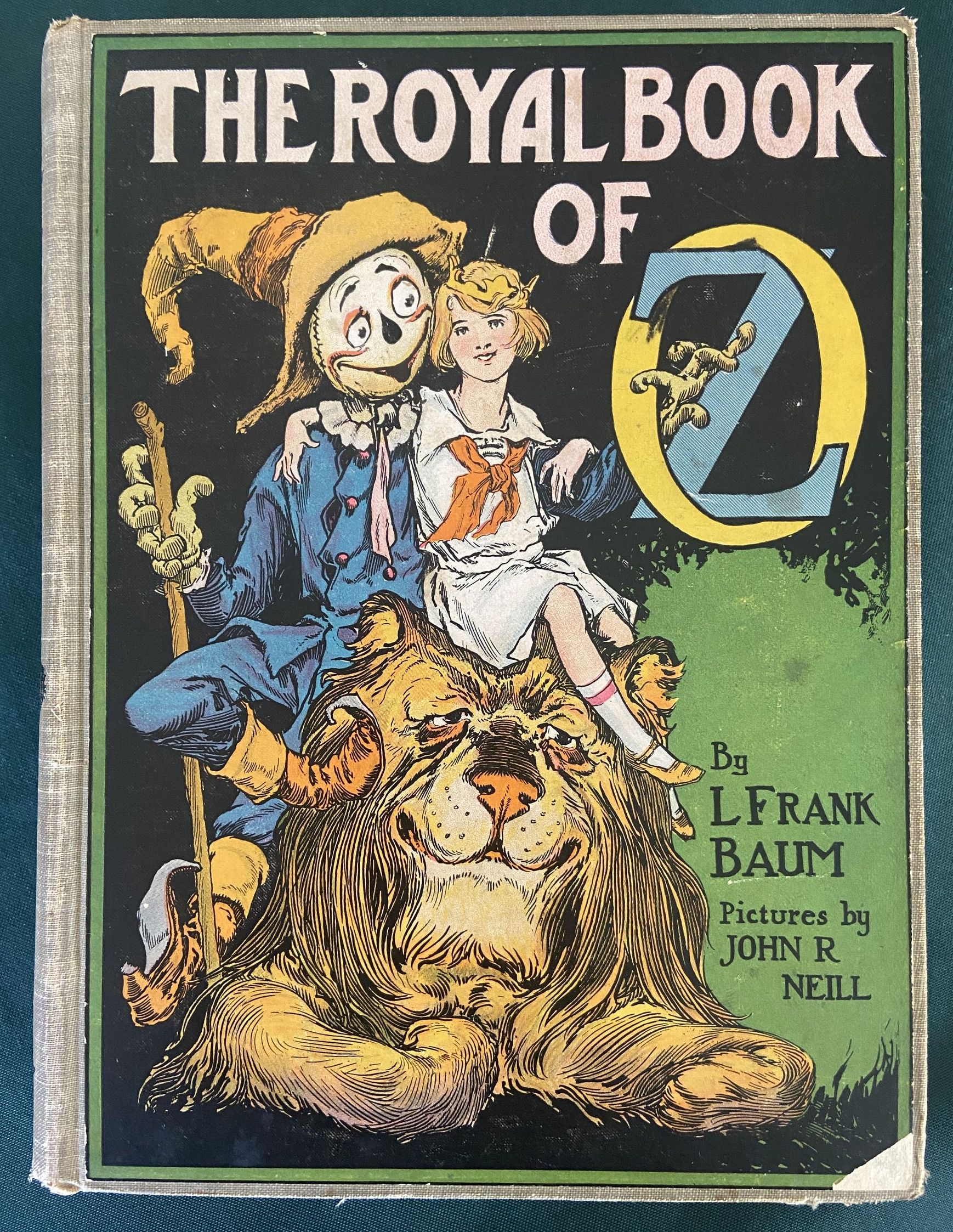 Here is a 1st edition, 1st printing of the Royal Book of Oz, published in 1921 by Reilly & Lee. This printing has 12 color plates by John R. Neill, with the plate opposite page 255 having a misprint–“SCARECORW’S” in the caption (see Bibliographia Oziana or The Book Collector’s Guide to Baum). Gray cloth with pictorial endpapers. The first Oz book written by Ruth Plumly Thompson, although originally credited on the cover to L. Frank Baum!