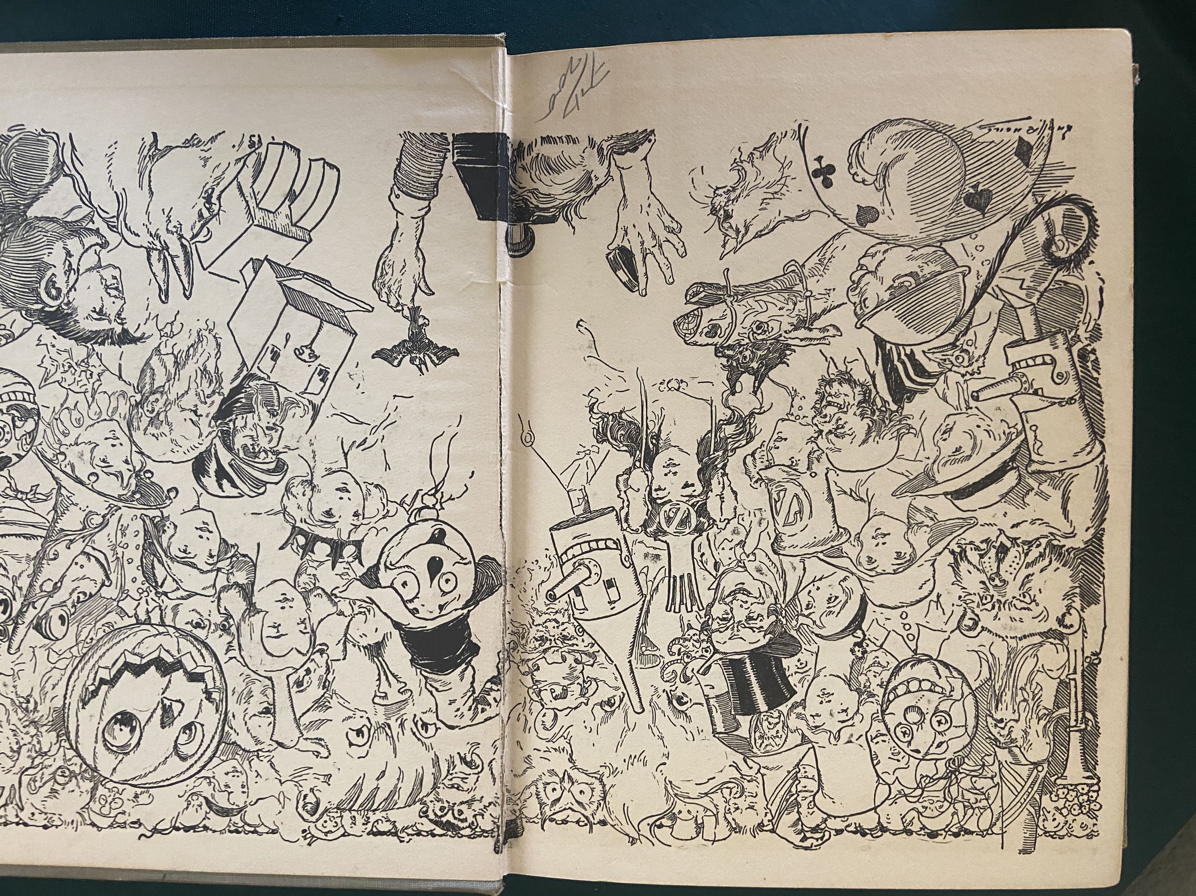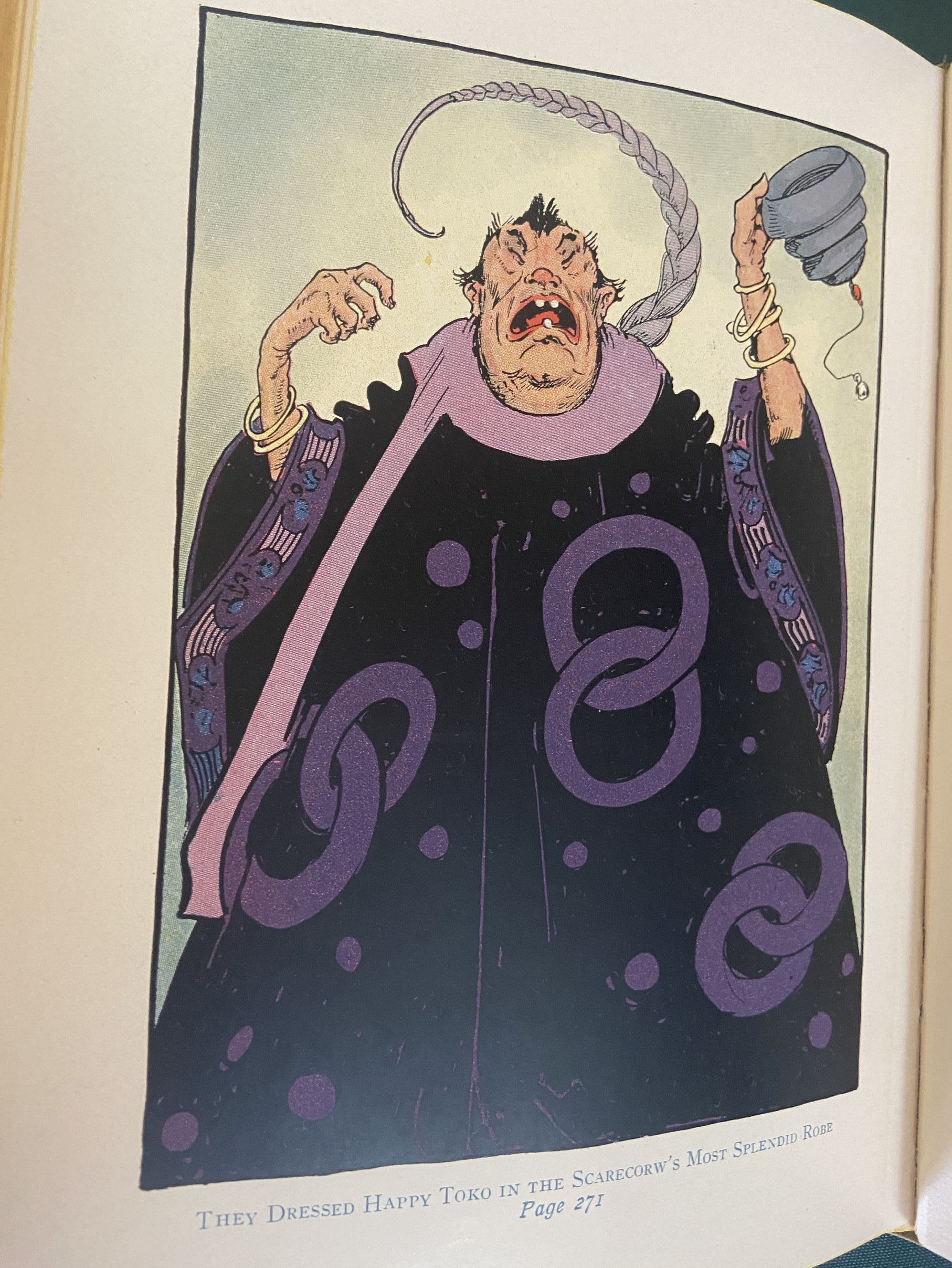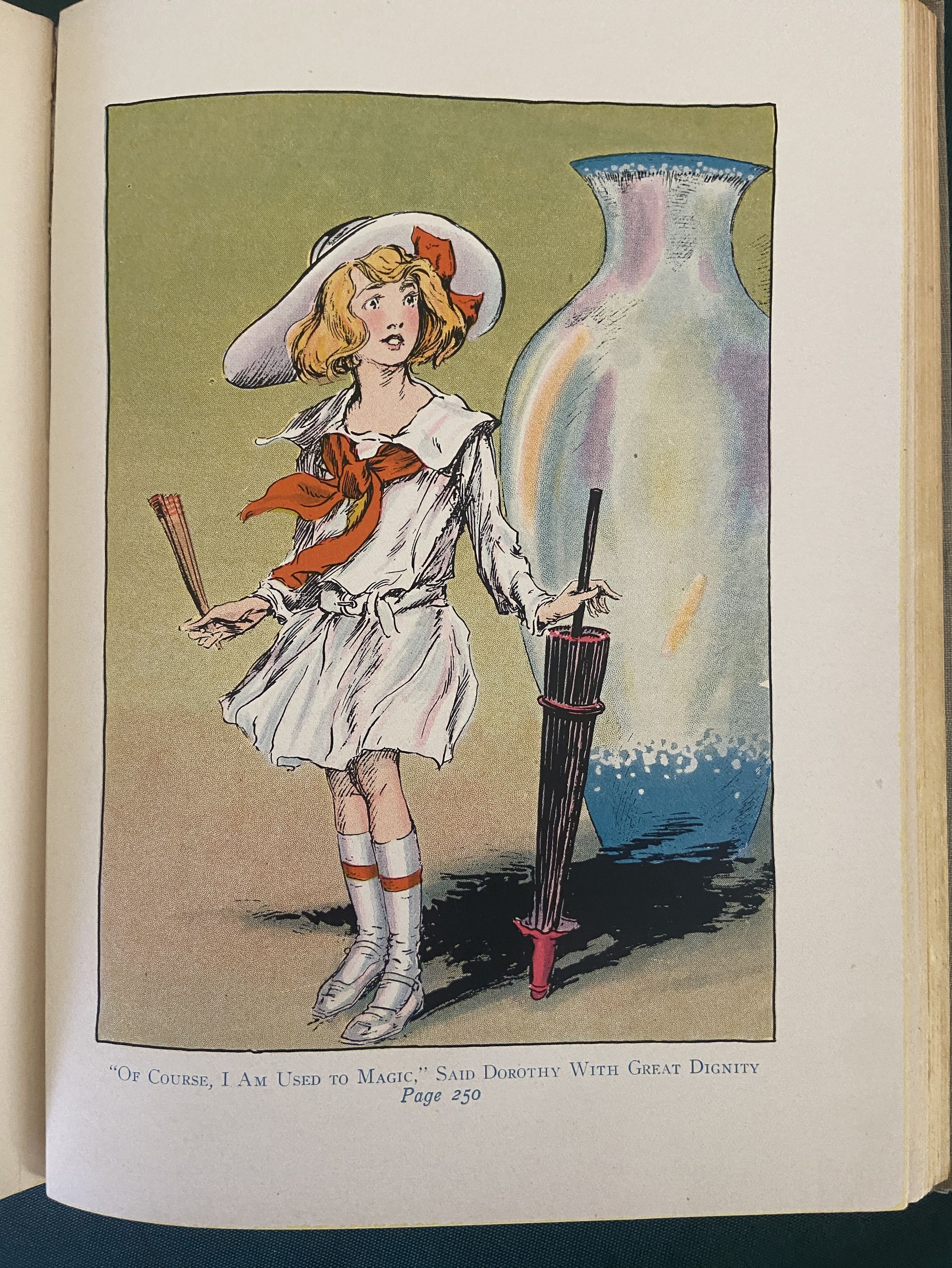 Here is a 1st edition, 1st printing of the Royal Book of Oz, published in 1921 by Reilly & Lee. This printing has 12 color plates by John R. Neill, with the plate opposite page 255 having a misprint–“SCARECORW’S” in the caption (see Bibliographia Oziana or The Book Collector’s Guide to Baum). Gray cloth with pictorial endpapers. The first Oz book written by Ruth Plumly Thompson, although originally credited on the cover to L. Frank Baum!
