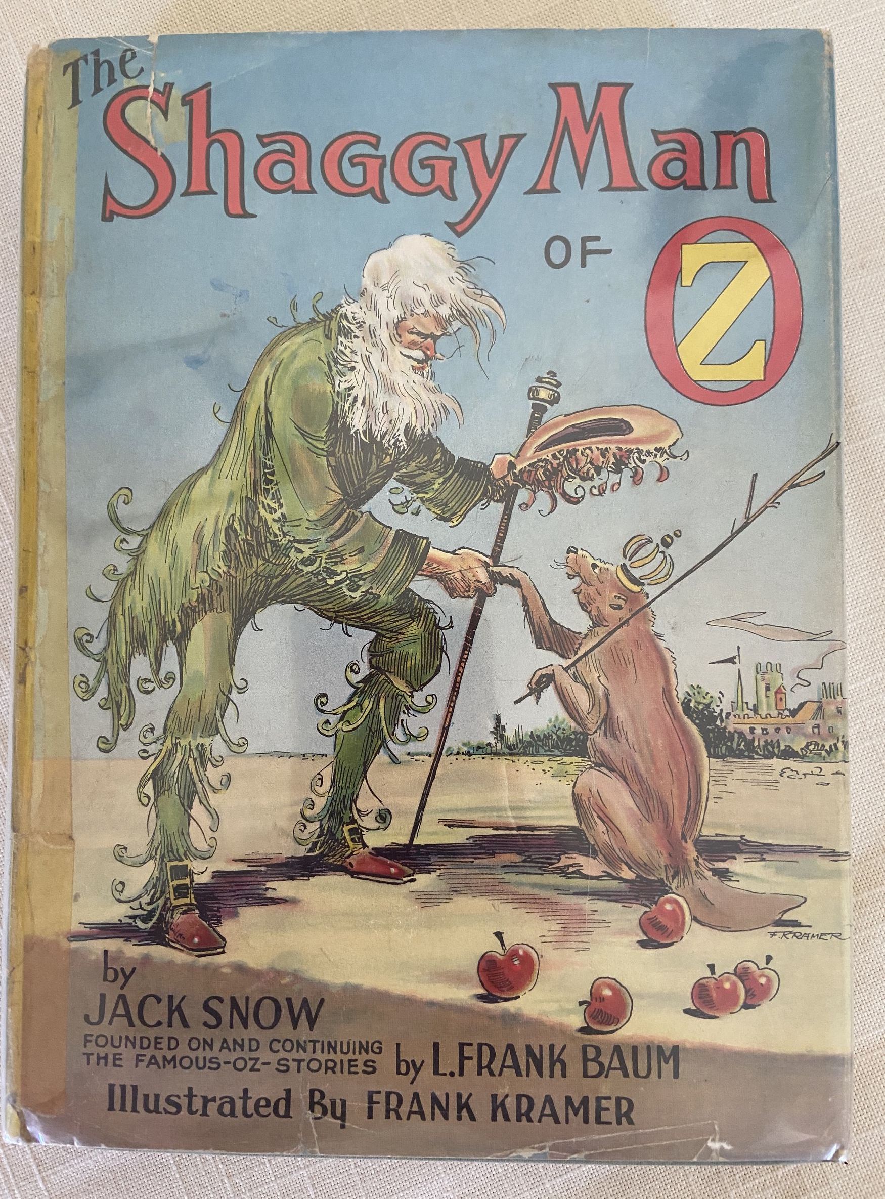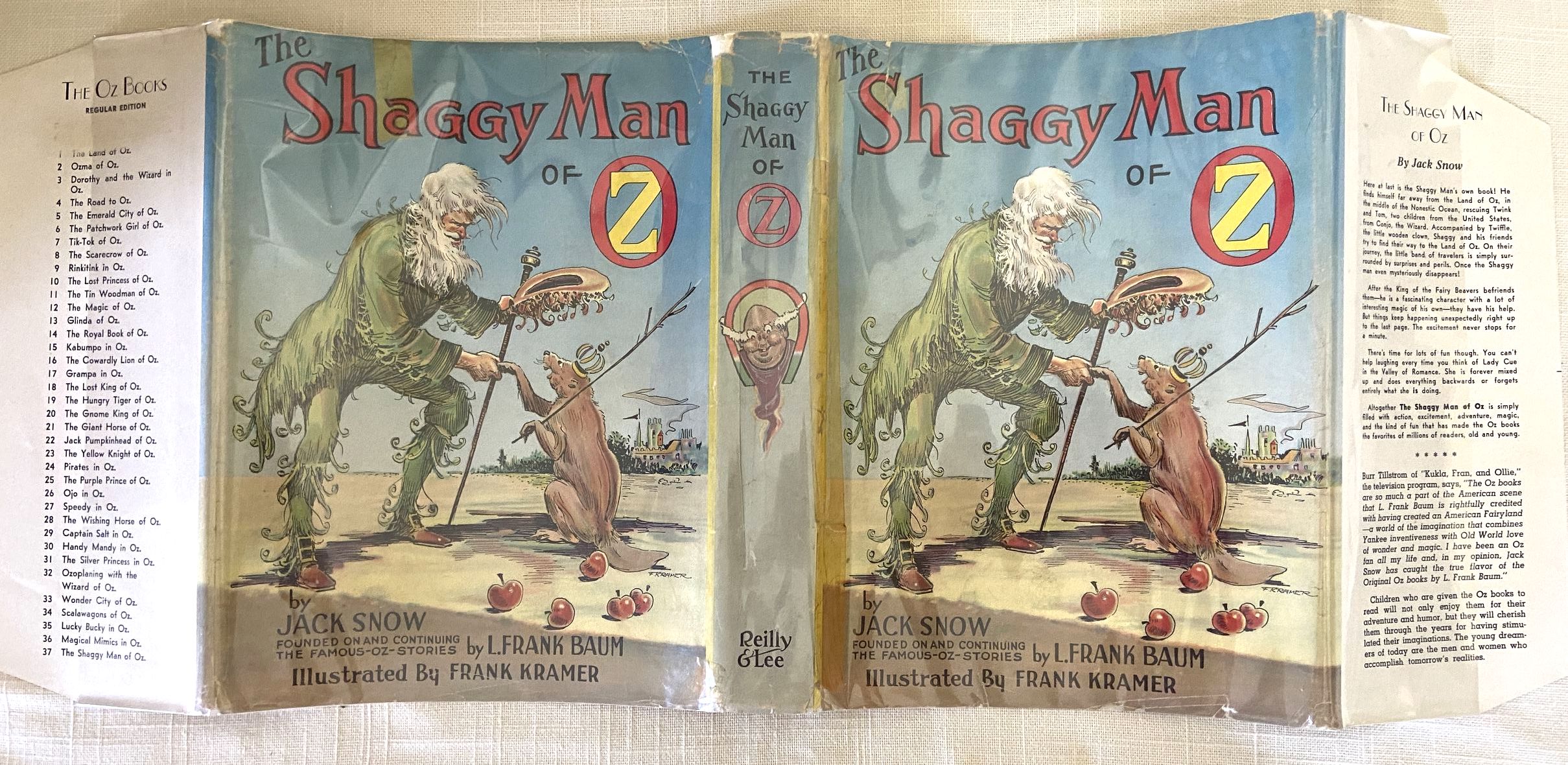 Here is a copy of The Shaggy Man of Oz written by one of the later Oz book authors, Jack Snow. Copyright 1949, first edition, first printing with illustrated endpapers (see Bibliographia Oziana). A beautiful book with the full-color paste down cover, and black and white illustrations by John R Neill. Also includes the first edition dust jacket, with Shaggy Man of Oz being the last title on the flap.