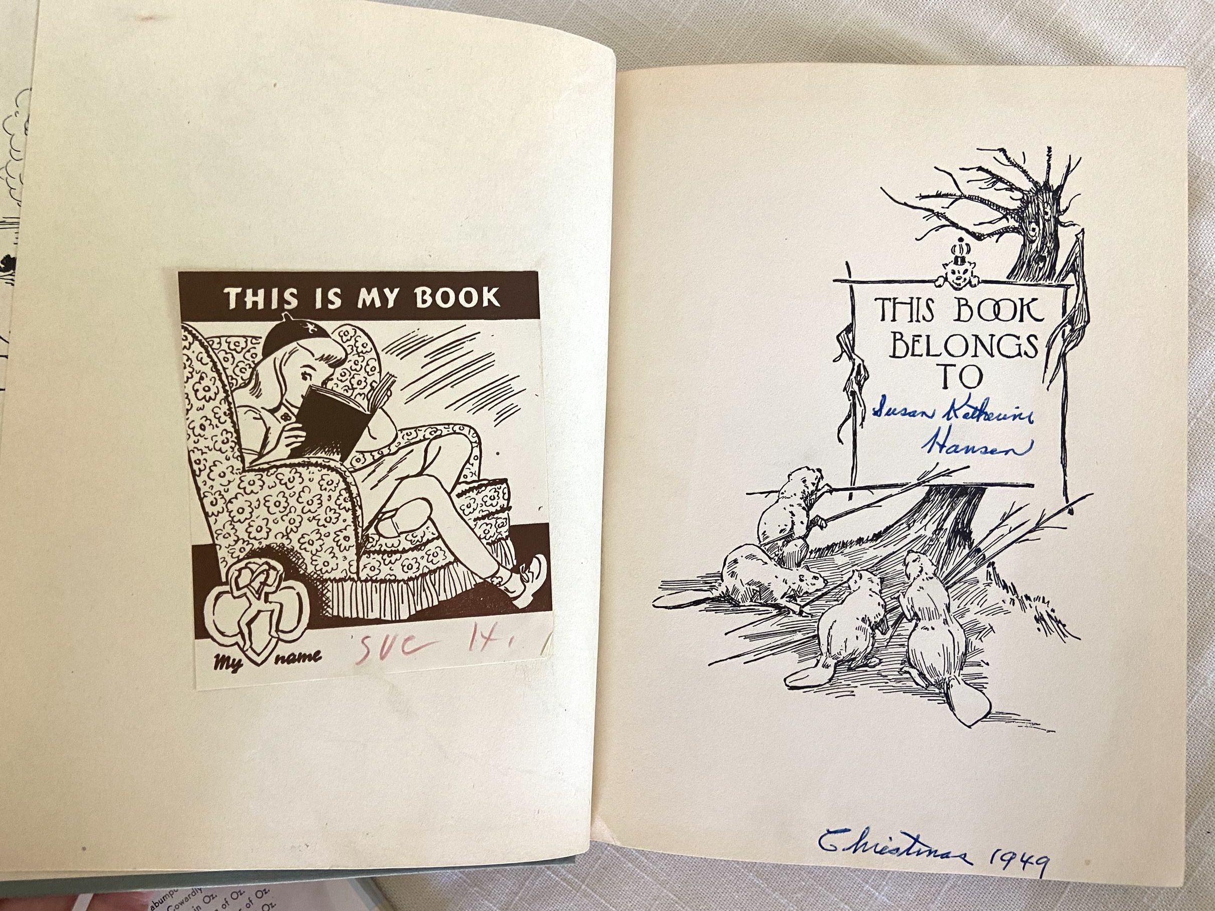 The book is very good condition–super clean front cover pastedown, with a little corner bumping. Inside, the binding is tight but there is a bookplate and former owner’s name on the endpapers, with a Christmas 1949 date. The front illustration was some light creasing, and there is a light stain on frontispiece. Pages are otherwise clean. The dust jacket is fair, price-clipped and with some tape on the outside along the front of the spine and on two tears along the top. Still presents well overall.