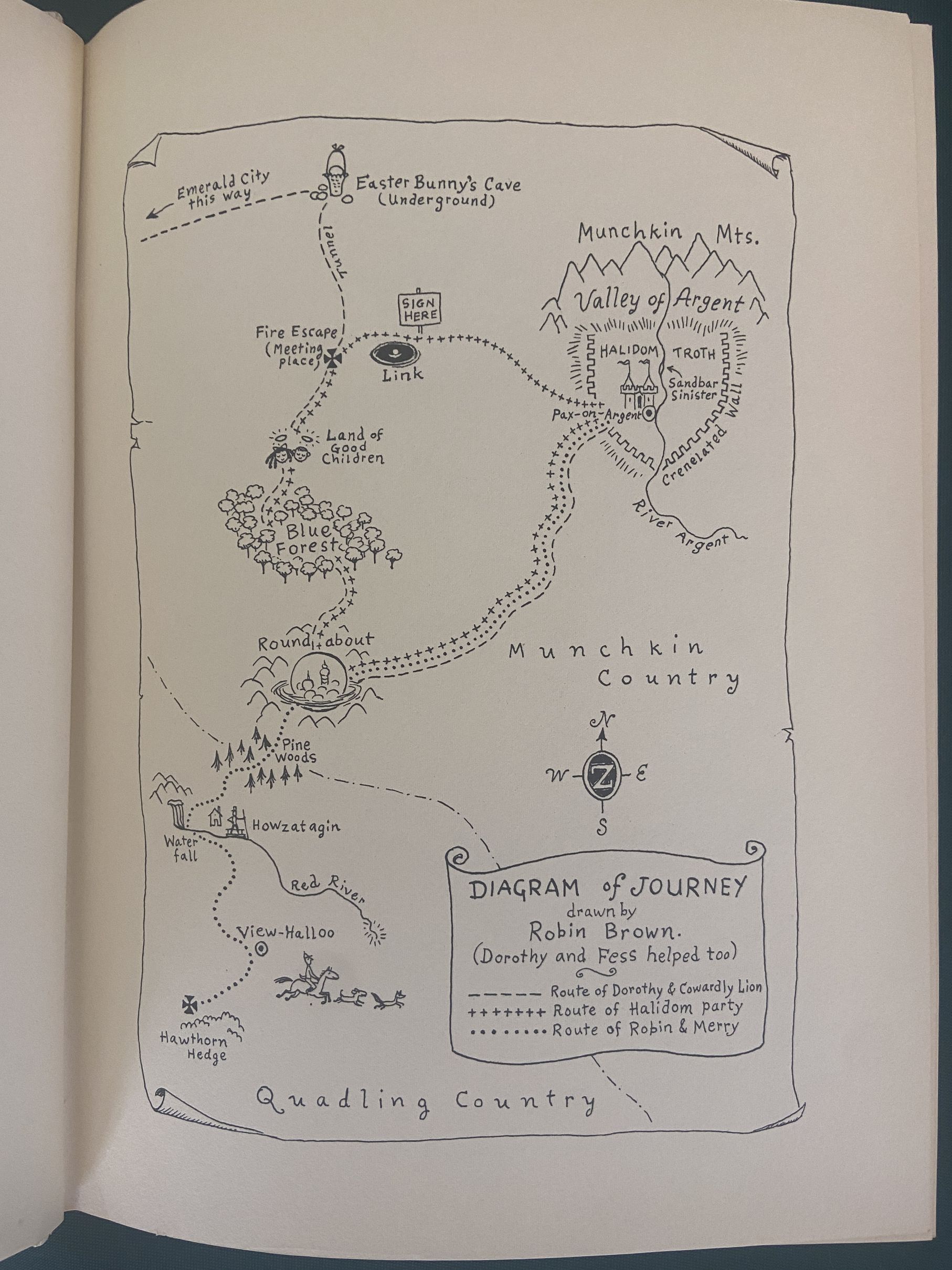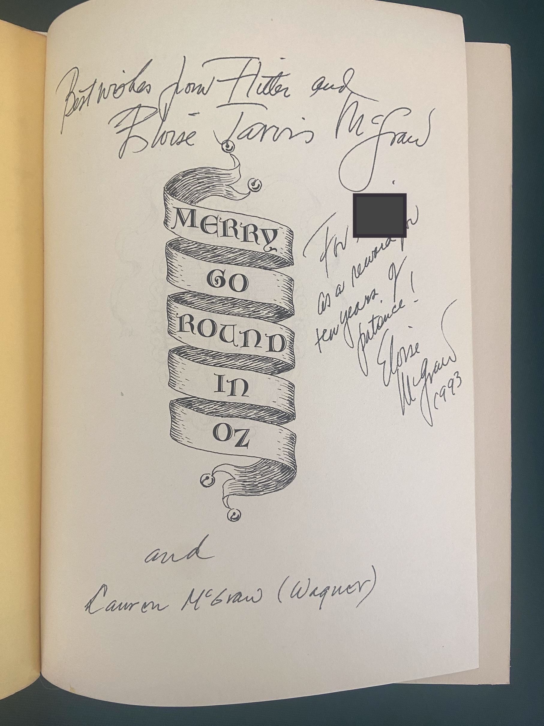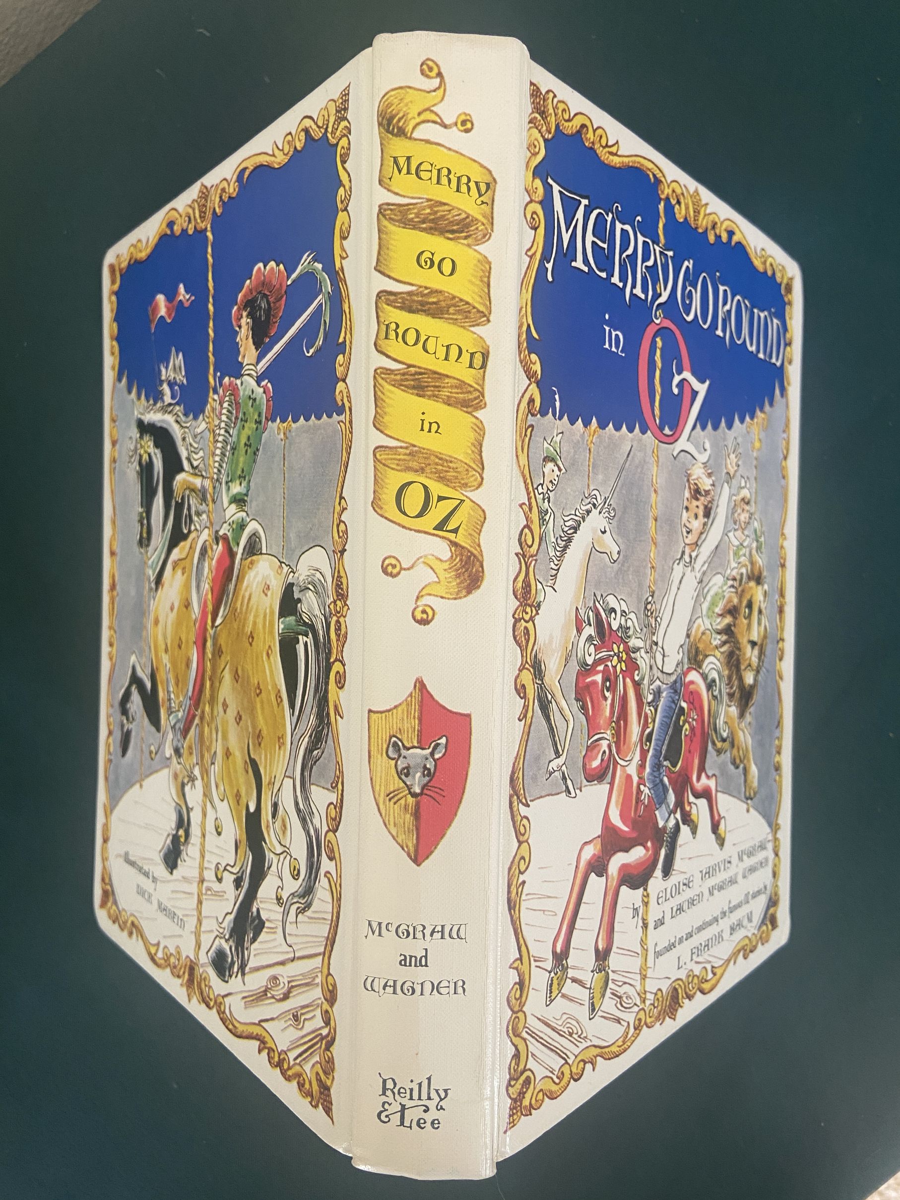 Here is a beautiful signed copy of one of the scarcer Wizard of Oz books, “Merry Go Round in Oz” by Eloise McGraw and McGraw, inscribed by both authors on the title page. First edition published in 1963 by Reilly & Lee, in the original dust jacket. With a beautiful color cover and internal B&W illustrations by Dick Martin, and interesting yellow and brown illustrated endpapers.