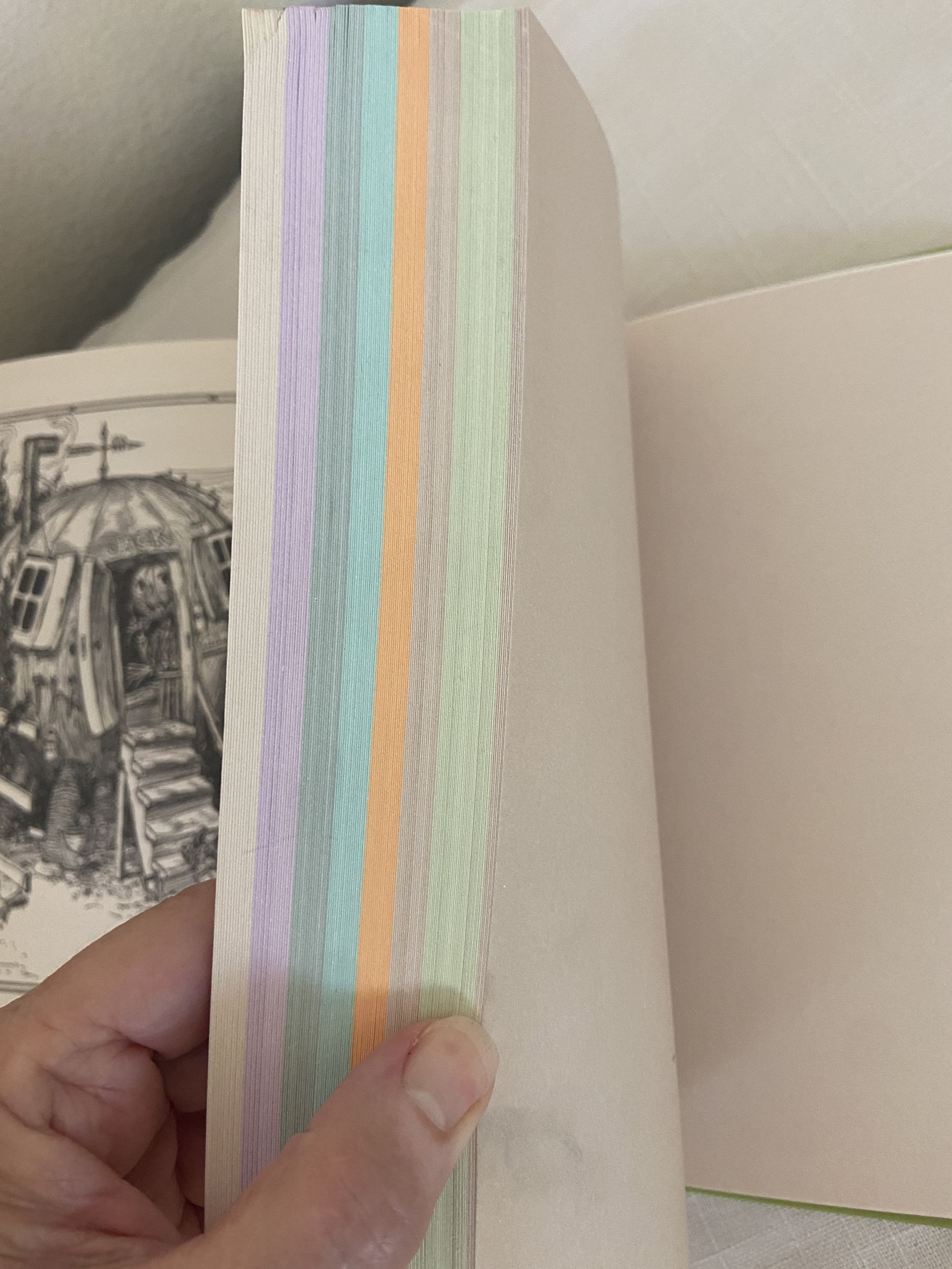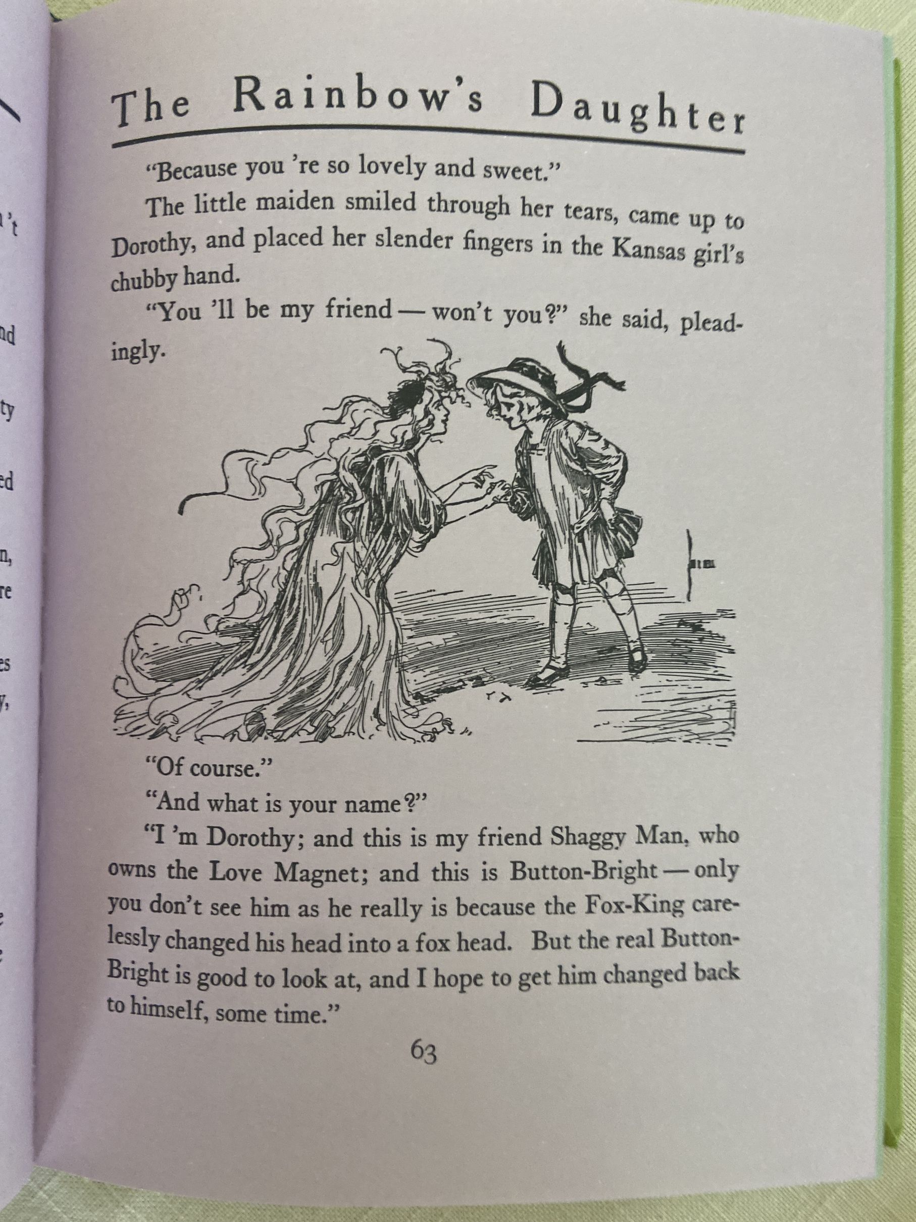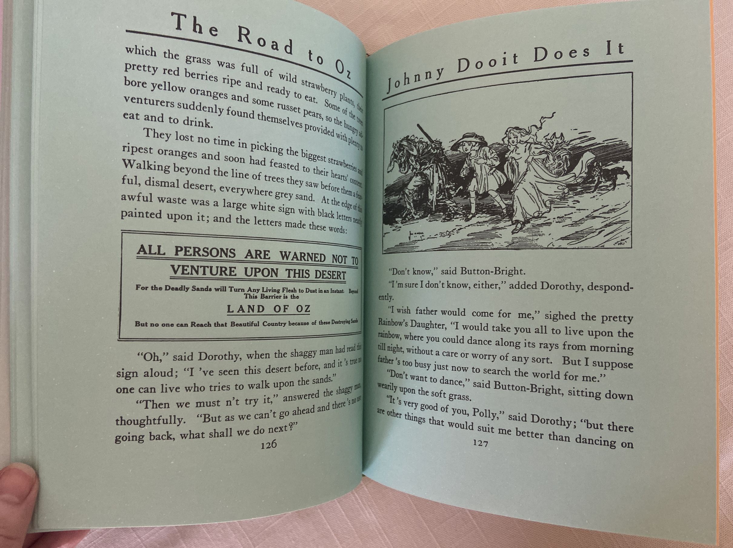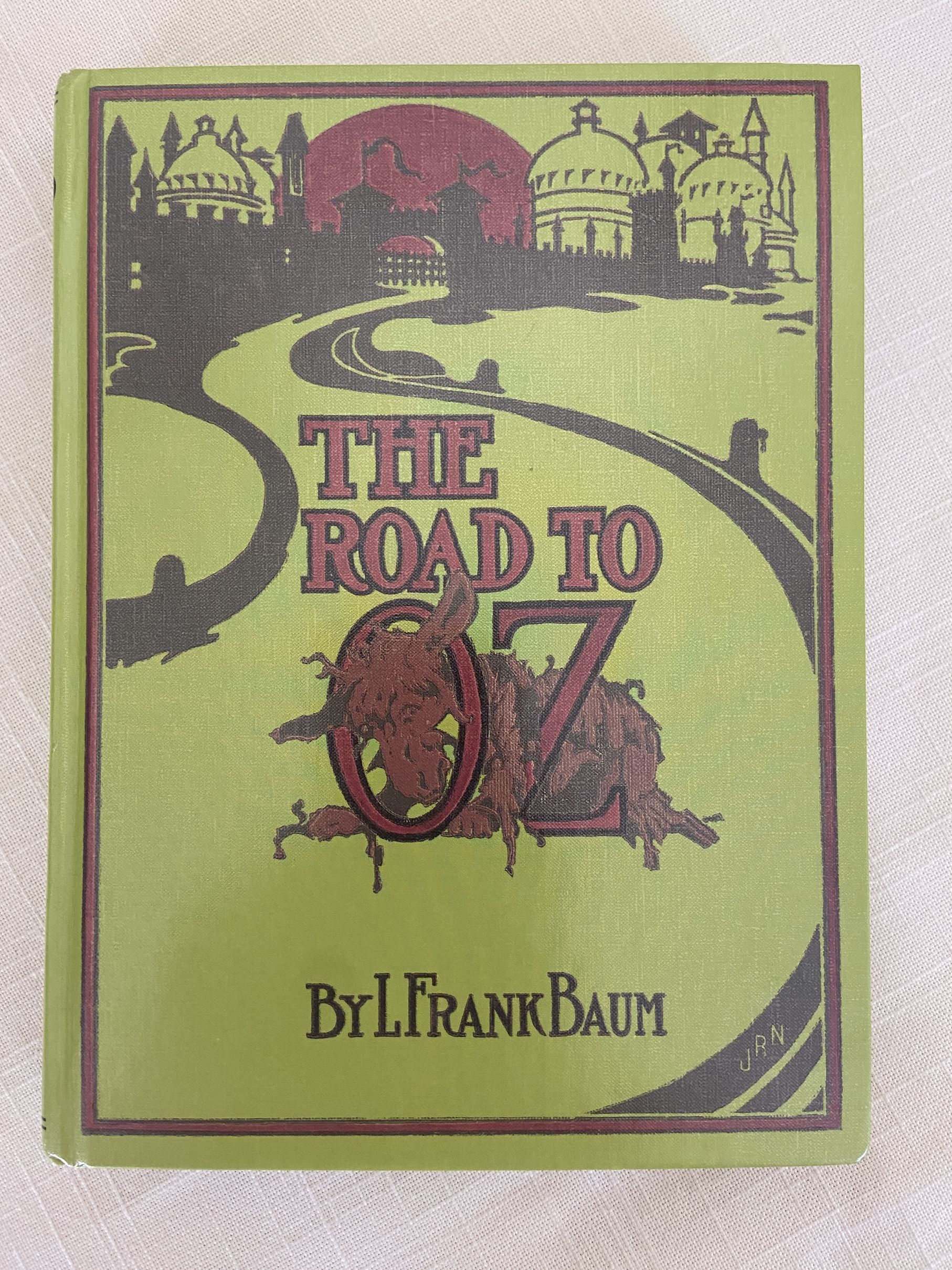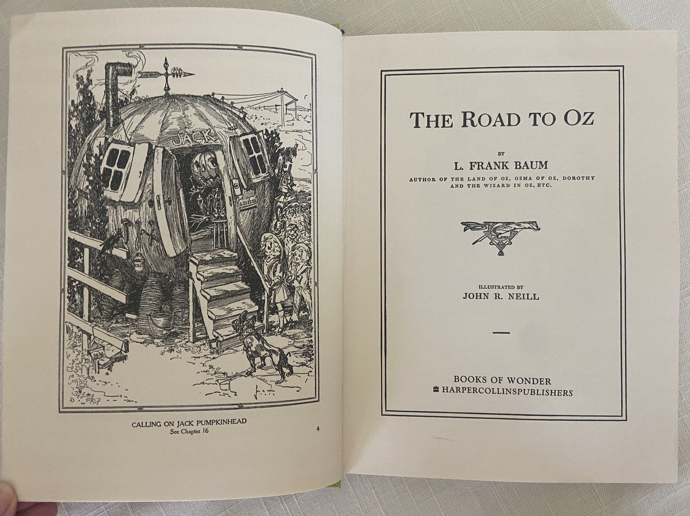 Here’s a beautiful facsimile reproduction of the first edition of the Road to Oz, published by Books of Wonder/Harper Collins in the early 1990s and written by L Frank Baum. The Road to Oz was never issued with color plates but with colored pages instead, which are reproduced here. In very good plus condition, no writing or tears, light edge wear to lower rear corner, first few pages folded at top corner, tight binding, without dust jacket.