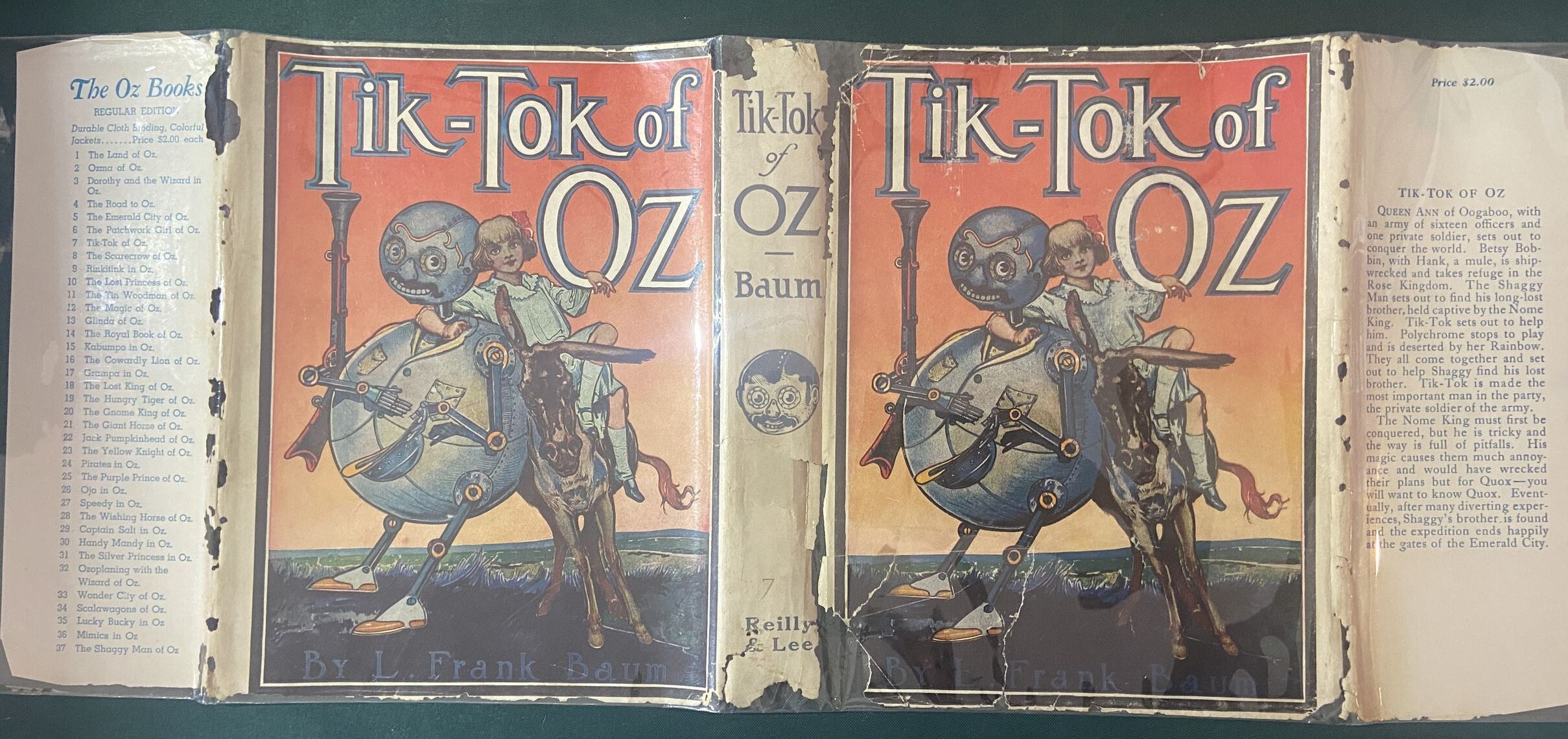 Dust jacket only for Tik-Tok of Oz book, circa 1949 with last title Shaggy Man of Oz. Fair to good condition with heavy wear to spine, flap folds and small piece of tape on back. Still will protect your book, in an archival Brodart style mylar cover. Will be shipped folded in two.
