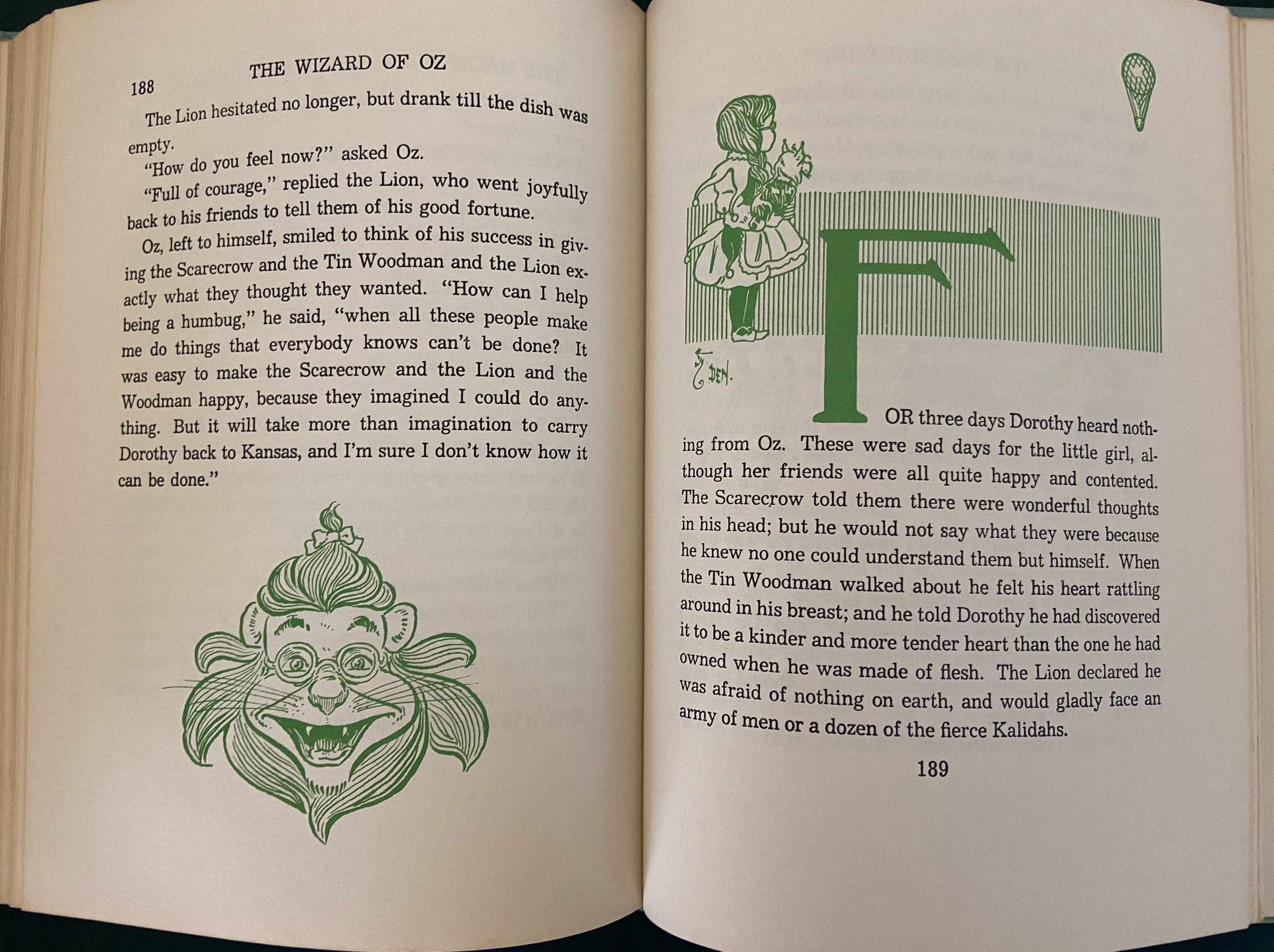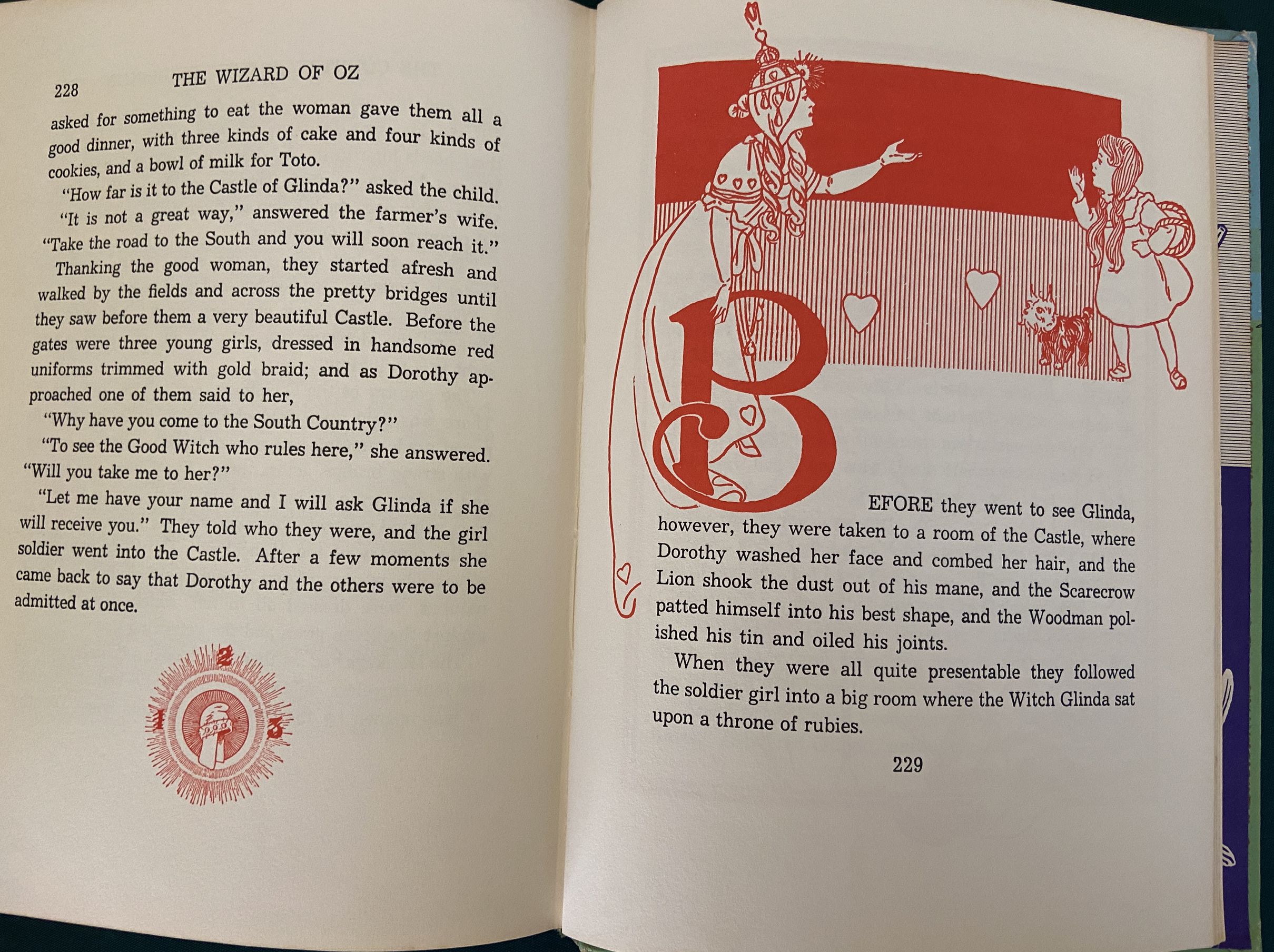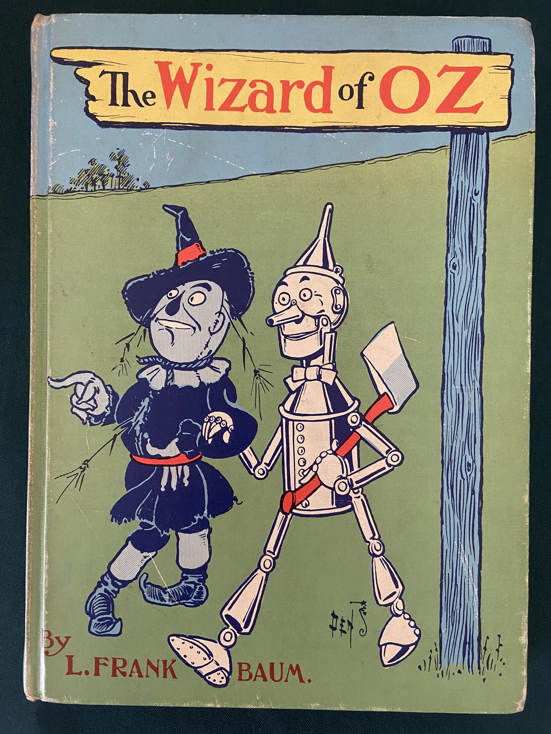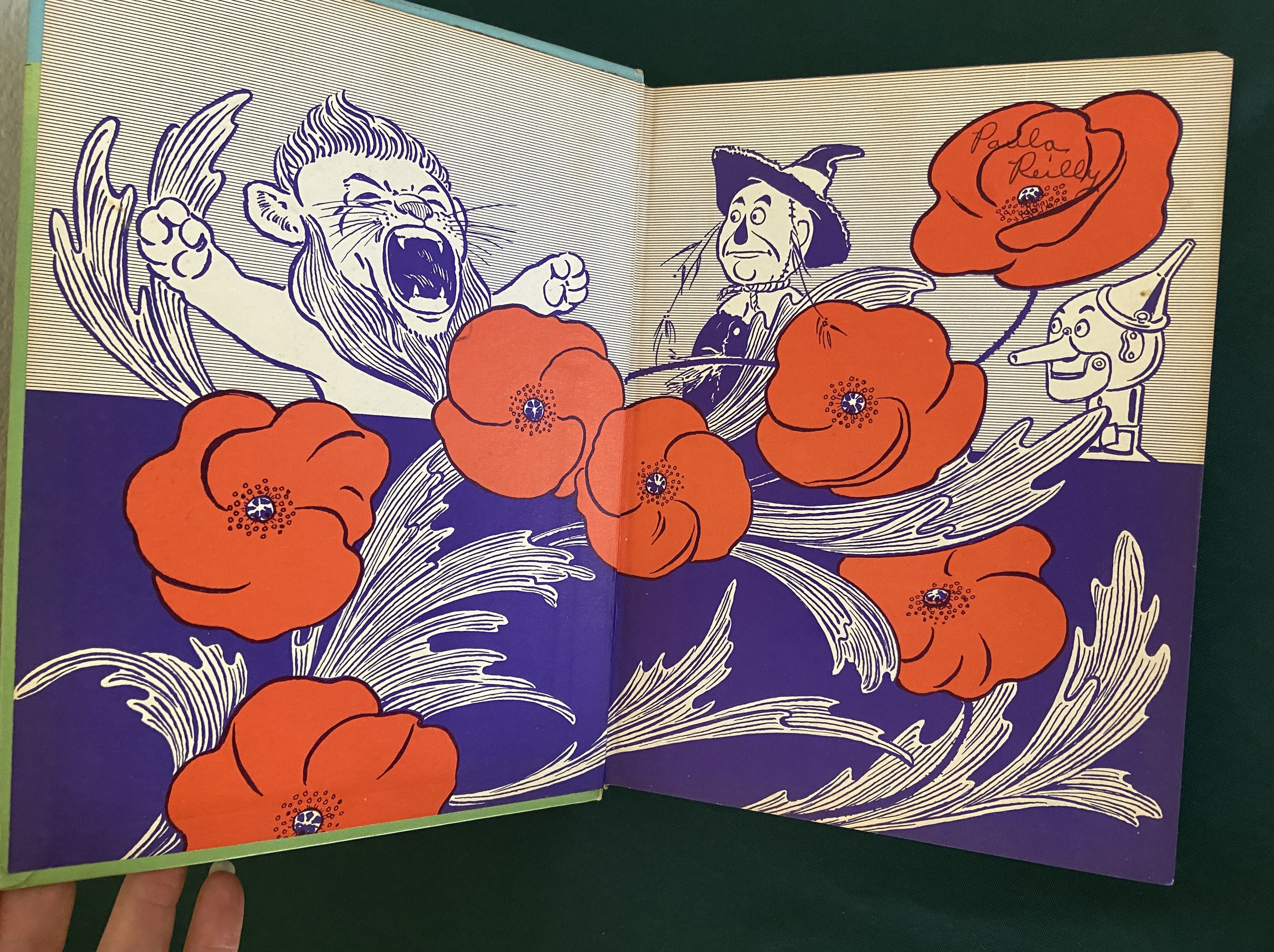 The blue cover illustration is integral to the front and rear cover, and is adapted from a 1900 W. W. Denslow poster advertising the Wizard of Oz. The eye-popping endpapers depict a red and purple Denslow poppy illustration. There are also single color (blue, red, and green depending on section) Denslow illustrations throughout the text, based on the true 1st edition of The Wonderful Wizard of Oz.