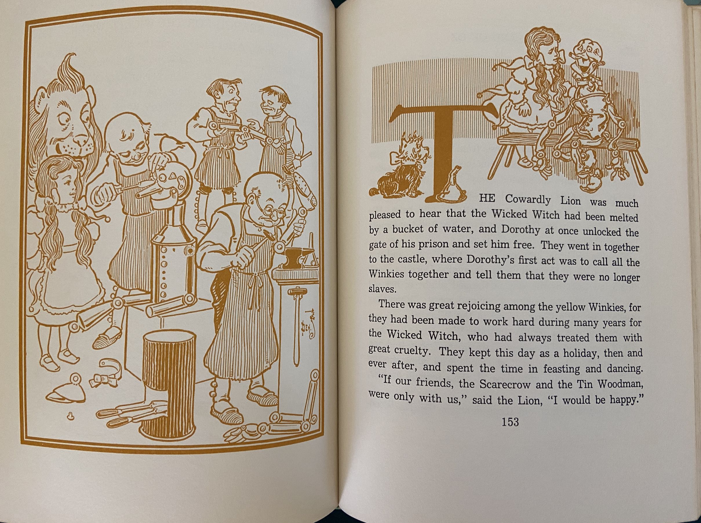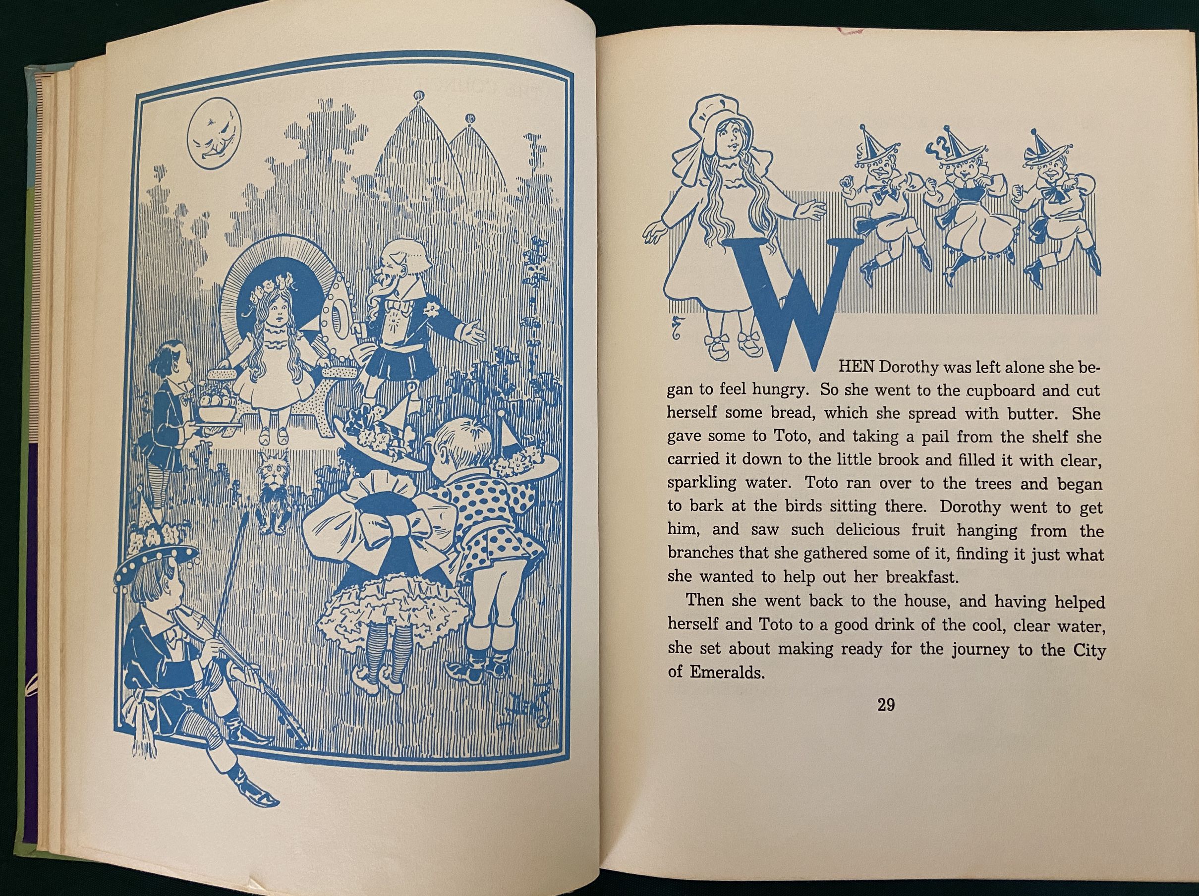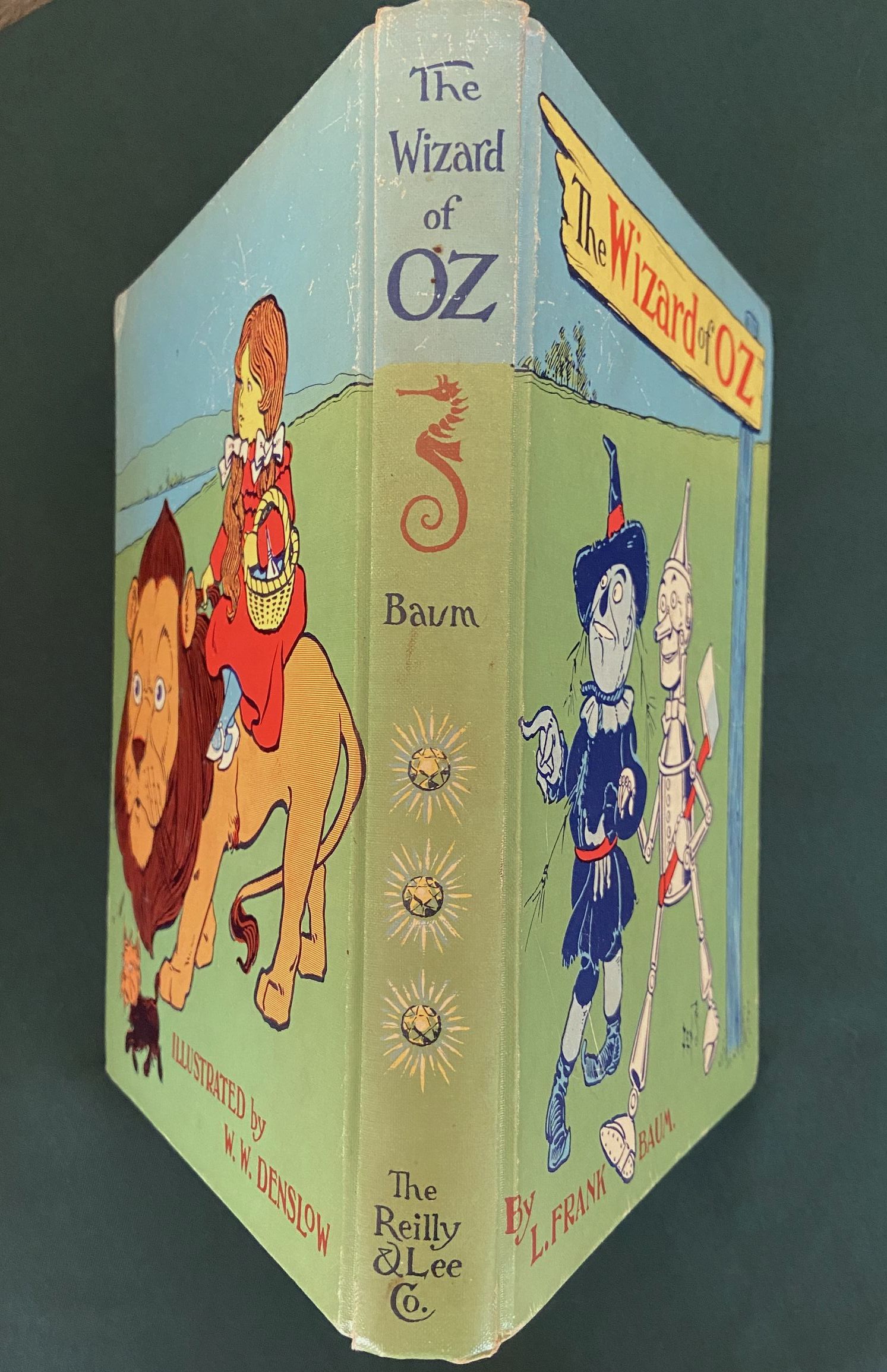 Here is an unusual version of “The Wizard of Oz”, 1st of the Oz books written by L Frank Baum. Copyright 1956 by Reilly & Lee, this is a short-lived Denslow poster cover version. According to Bibliographia Oziana, this “blue cover” printing was only printed in 1964, and was replaced by the more common white cover version in 1965, which accounts for it being less common.
